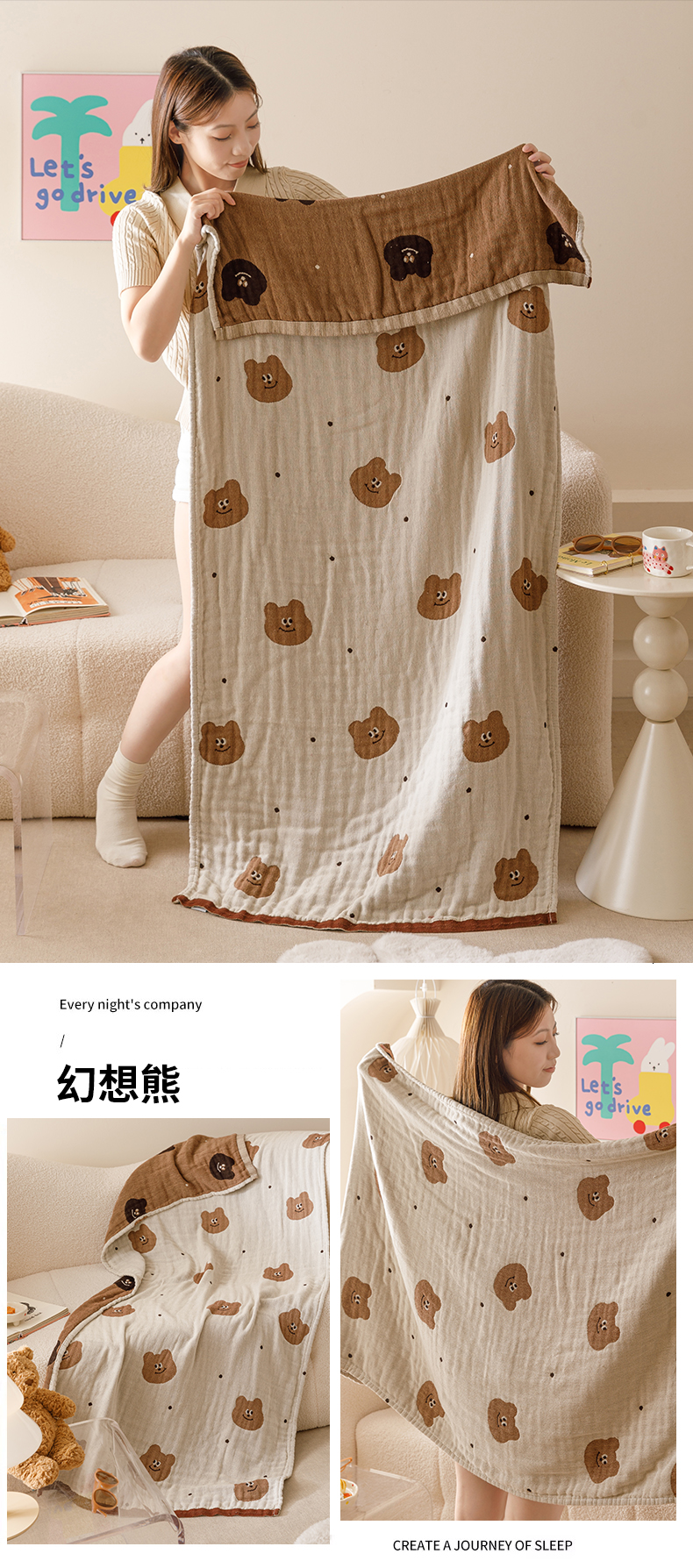商品名称:麻依 2025新款全棉四层纱布浴巾披肩旅行毯 樱桃兔猫