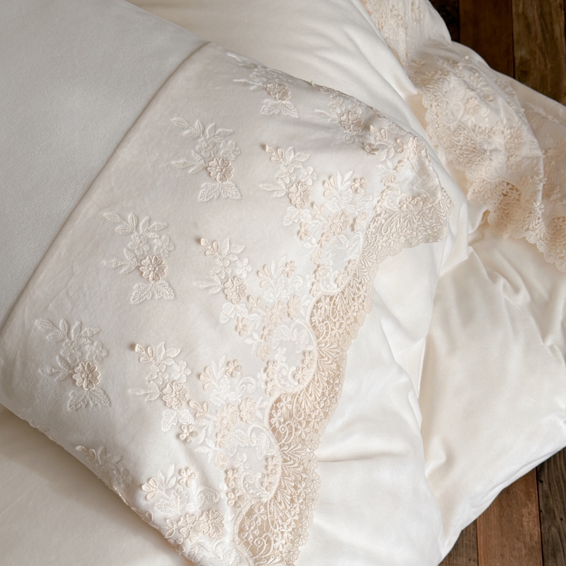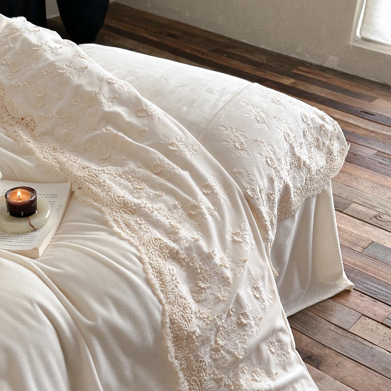 (总)佳汐蓝 2025春夏新品双层皱皱纱刺绣+织带+荷叶边四件套--白茶花,奶白,曲奇