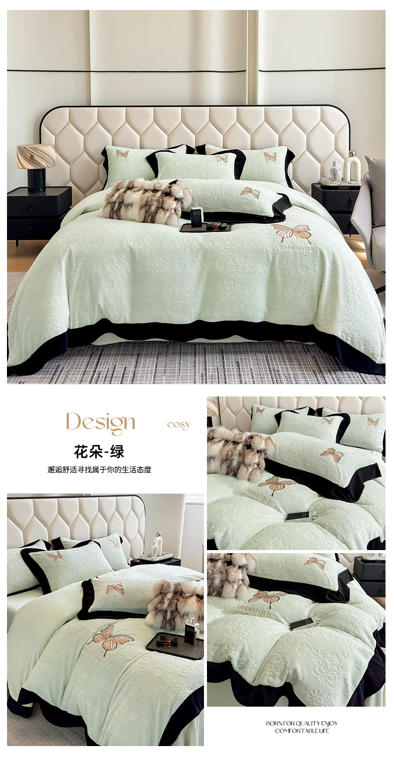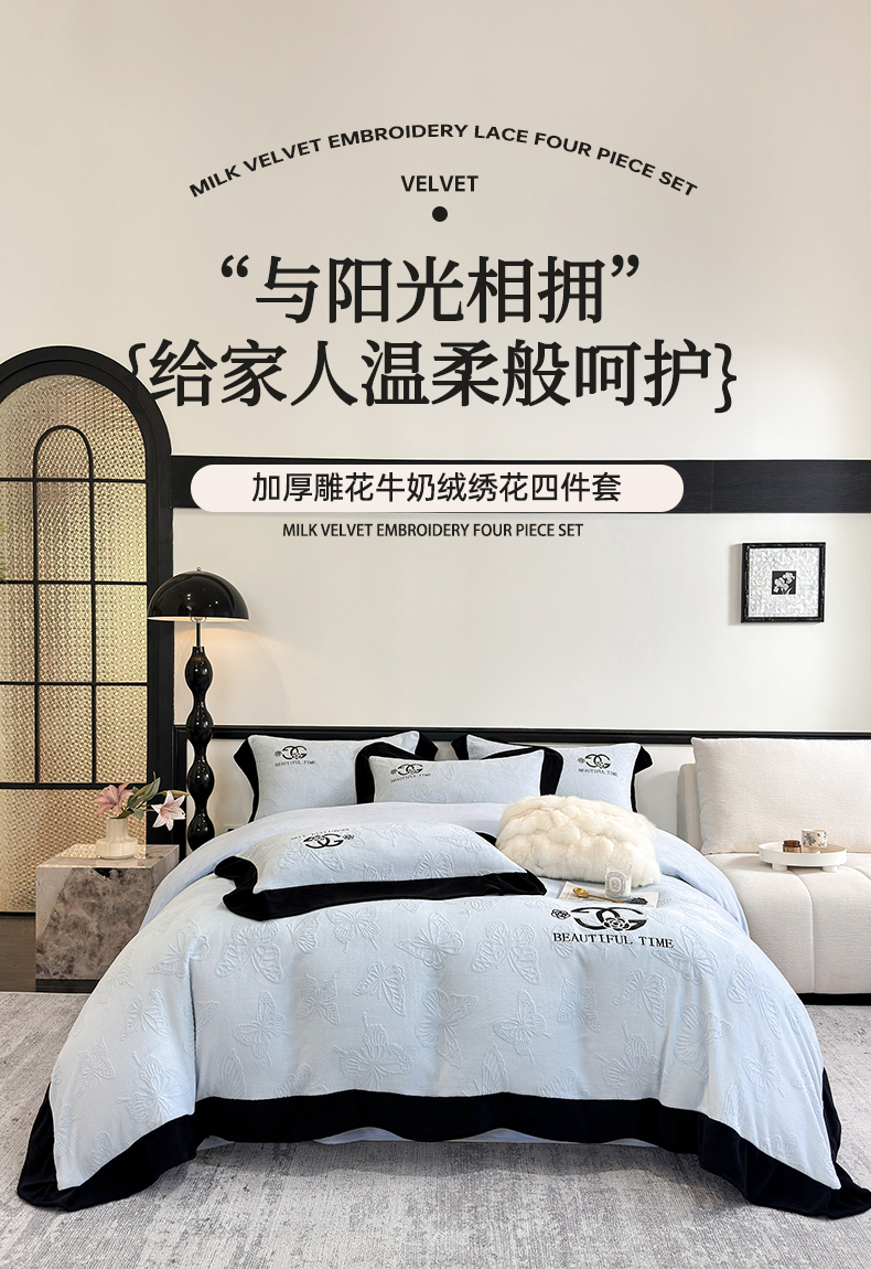 (总)优眠坊 2025新款雕花牛奶绒绣花四件套,蝴蝶-粉,蝴蝶-蓝,蝴蝶-米白,蝴蝶-紫