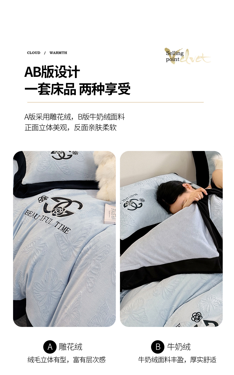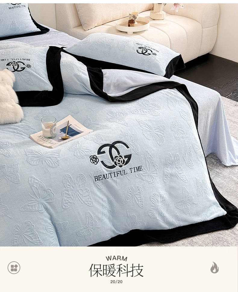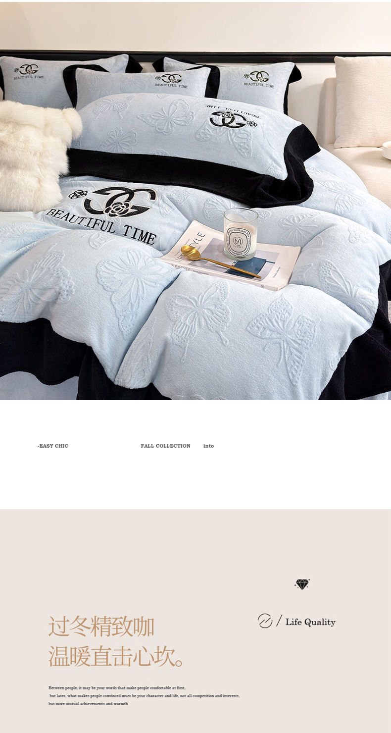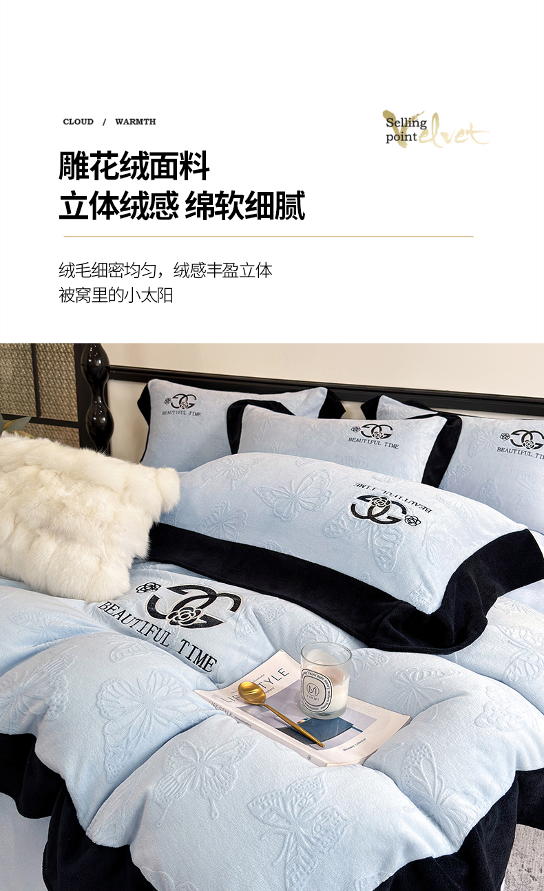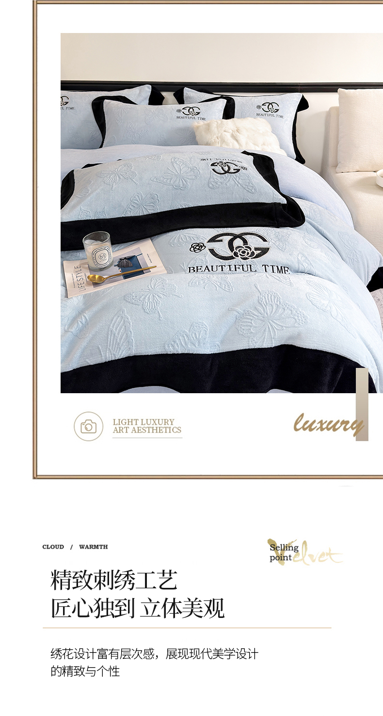 商品名称:优眠坊 2025新款雕花牛奶绒绣花四件套 蝴蝶-蓝
