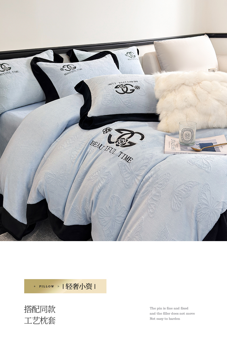 优眠坊 2025新款雕花牛奶绒绣花四件套 蝴蝶-蓝