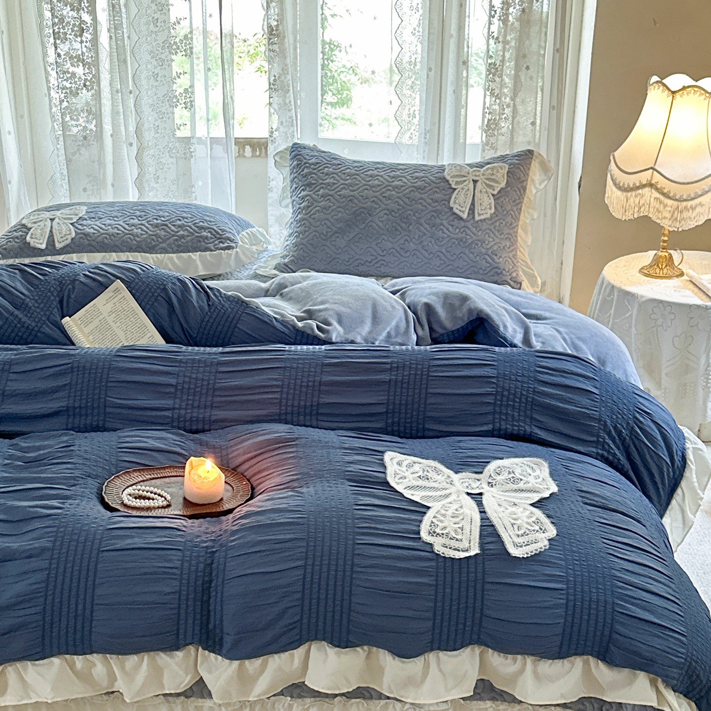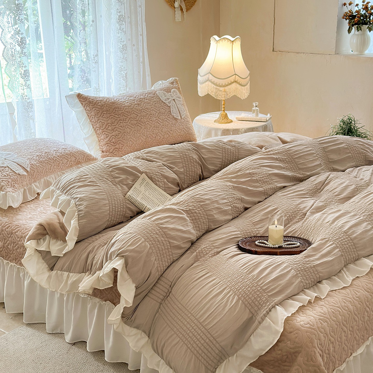 商品名称:梵克保罗 2025新款亲肤舒适牛奶绒花边床盖四件套 浅米