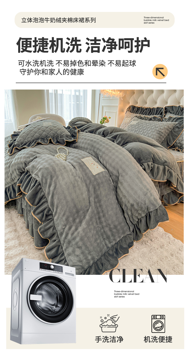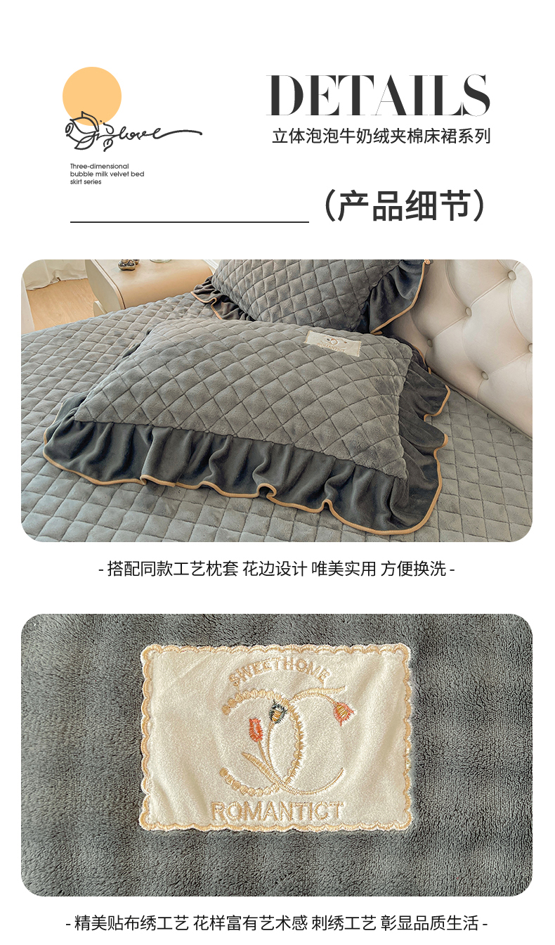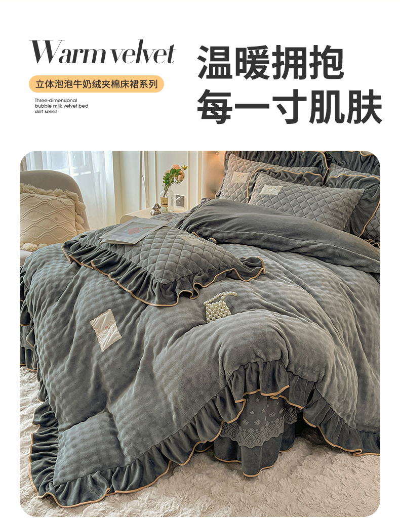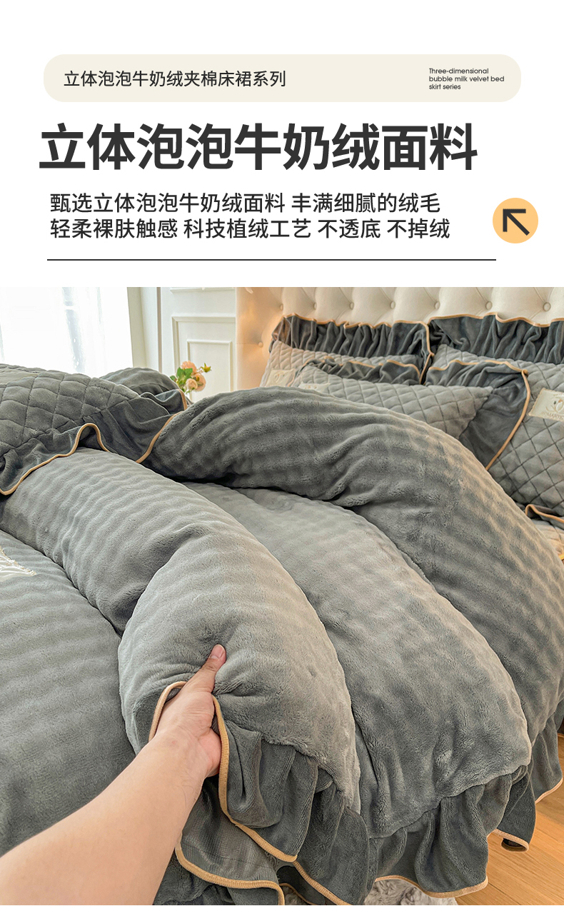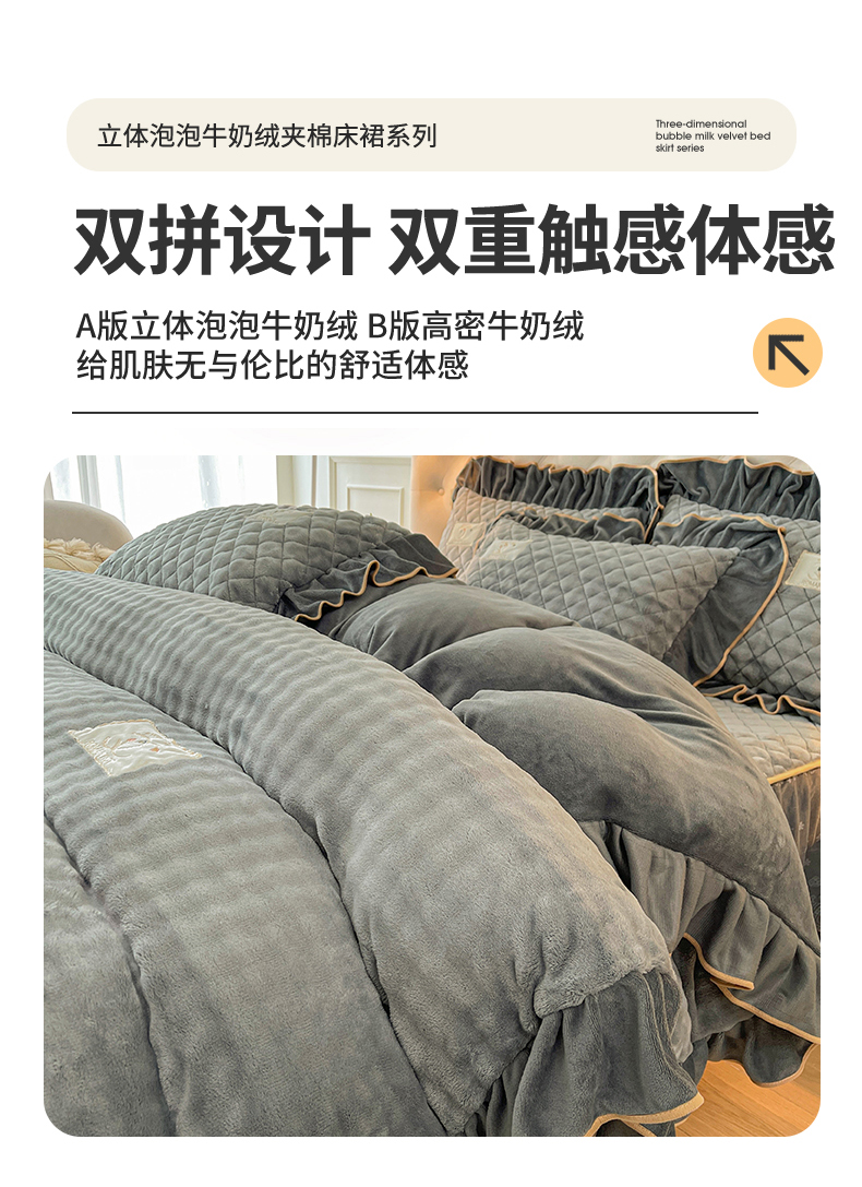 当前位置: 91家纺网 > 商品网购 > 床品套件 > 四件套 > 牛奶绒四件套 > 情恒家纺 2025新款立体泡泡牛奶绒夹棉床裙四件套系列-浅语光年 浅语光年-星灰