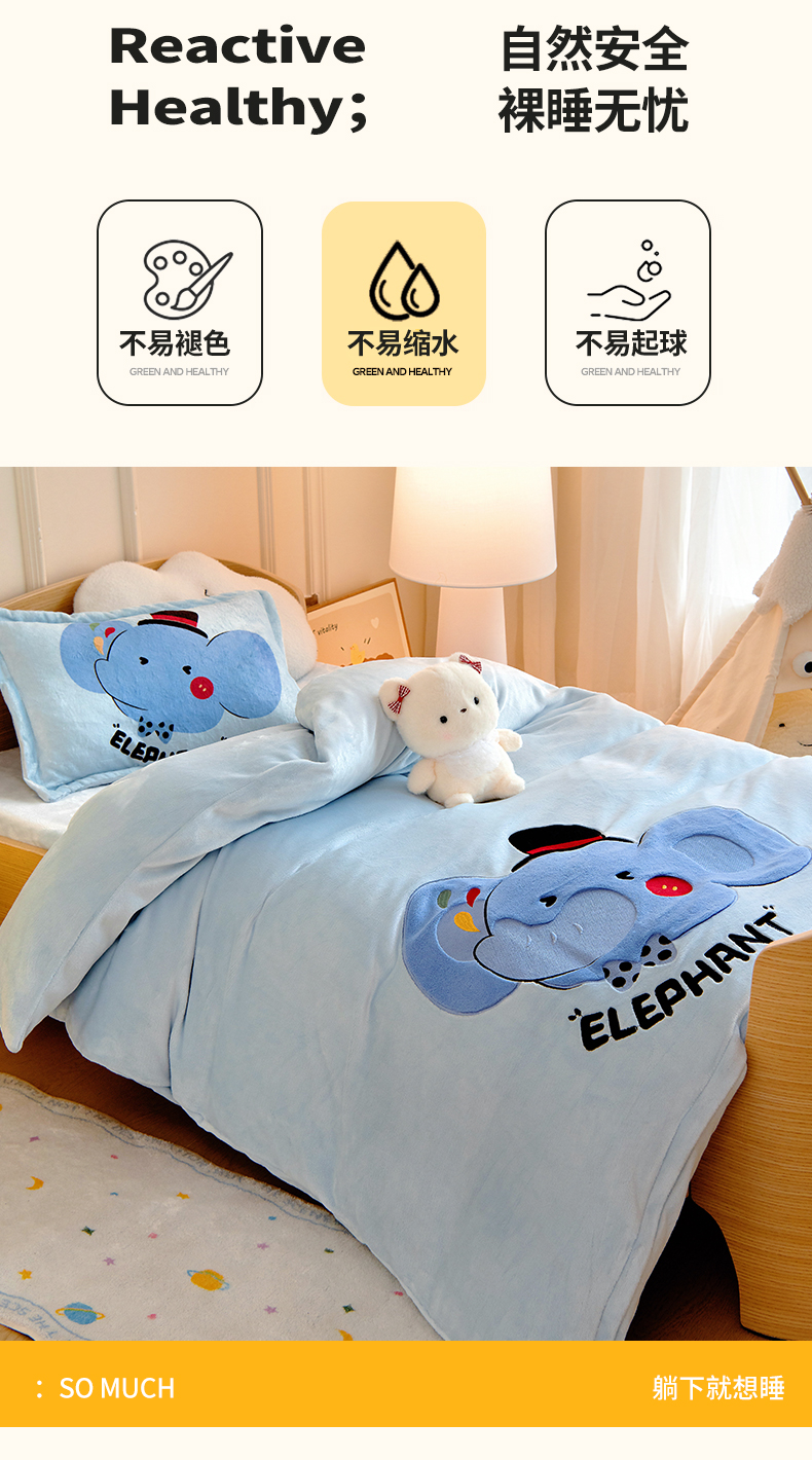 • 91家纺网 家纺一手货源 找家纺 (总)梵赫 2025新款加厚牛奶绒贴布绣原创卡通幼儿园套件儿童三件套,超级小萌怪,可爱小鸭,围巾兔,机灵小挖机,巧克力熊,组合,大象先生