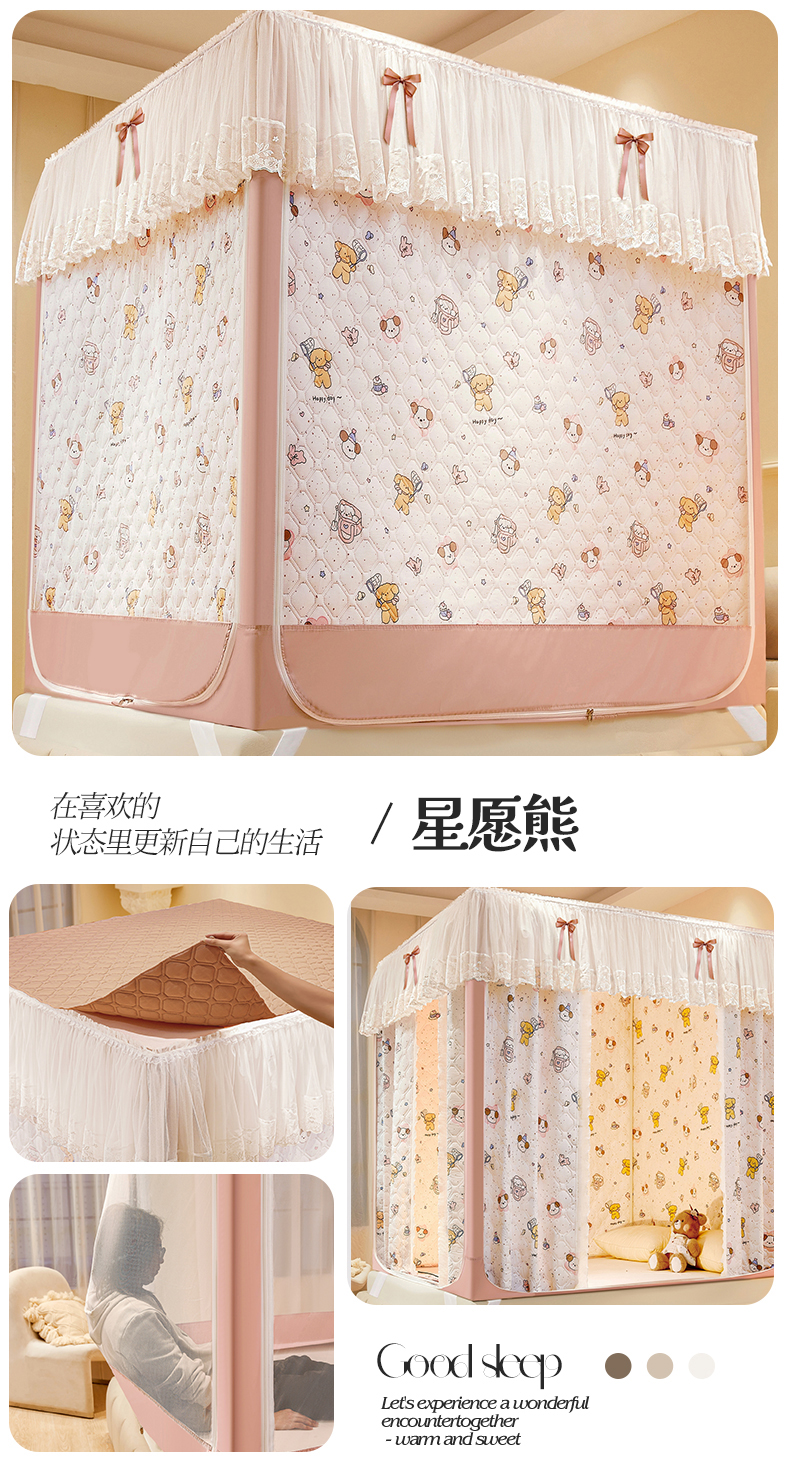 (总)夏彩 2025新款五面保暖亲肤面料坐床拉链四季款蚊帐-88632,星愿熊,拉贝贝,羽飞舞,支架,保暖顶-灰色,保暖顶-粉色,保暖顶-绿色