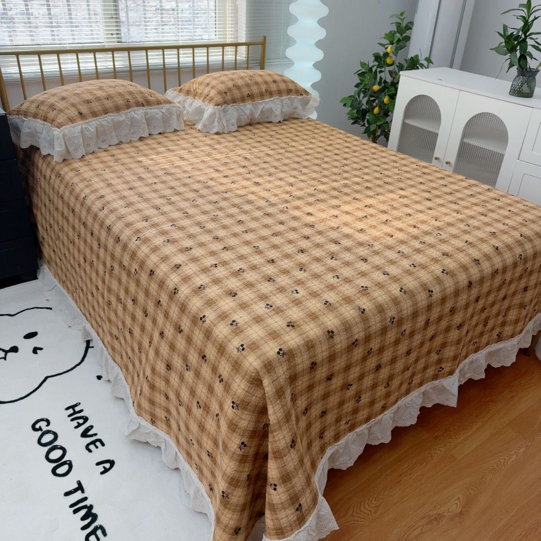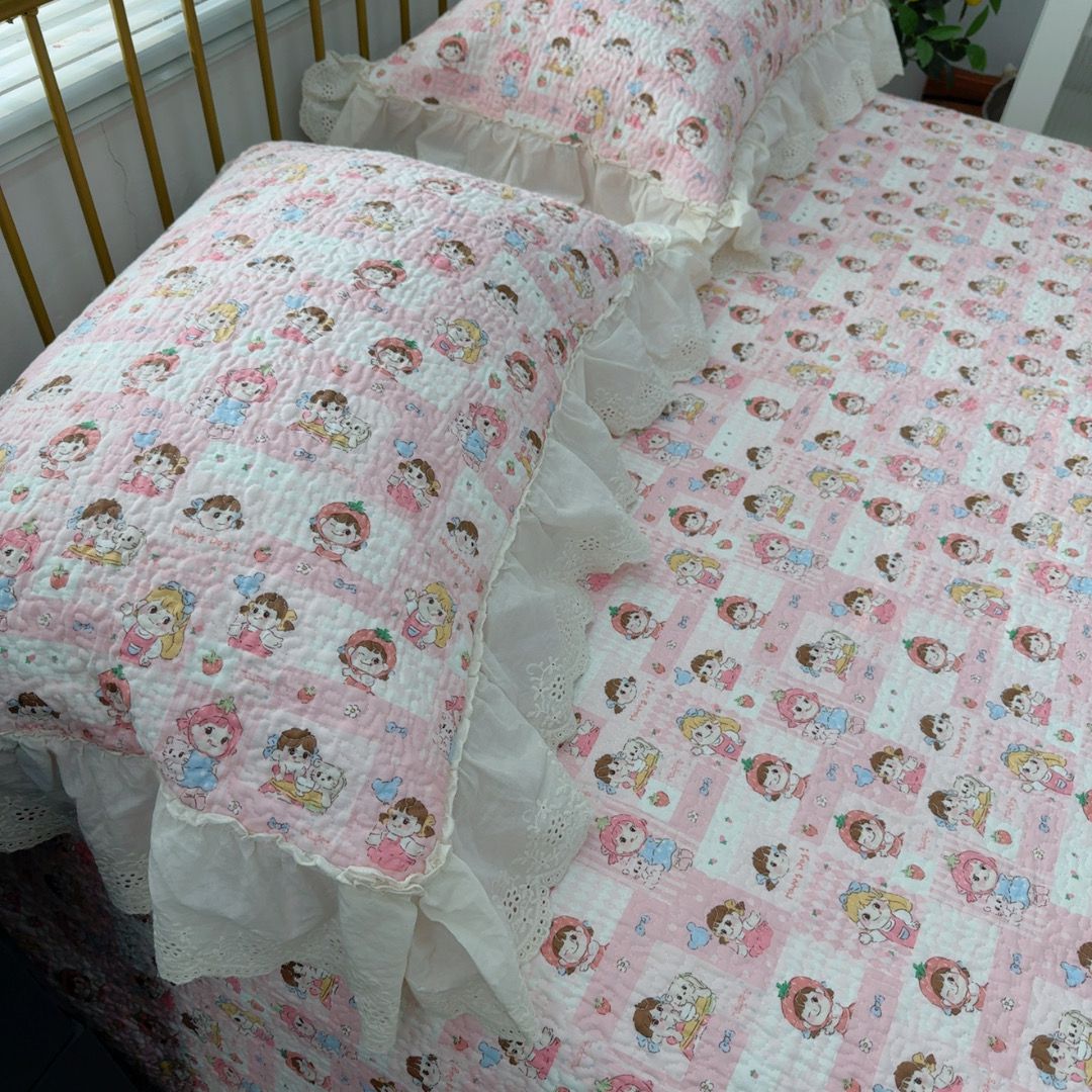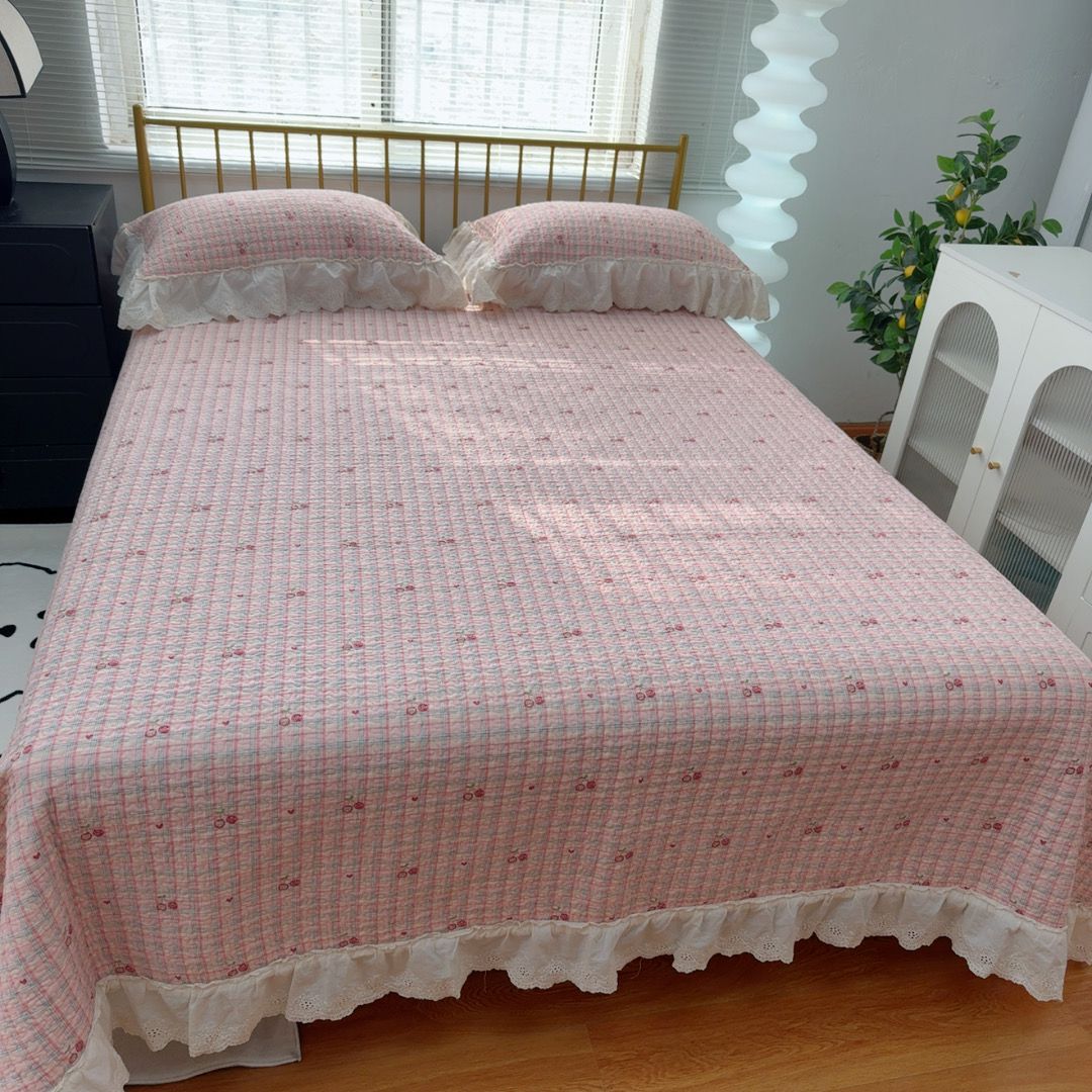 (总)暖居 2026新款大尺寸双层纱高温砂洗245X265床盖三件套,车厘子,粉绿格,洛璃,米妮,旺旺队,小丸子,樱桃可可,饼干熊,木马,小星星