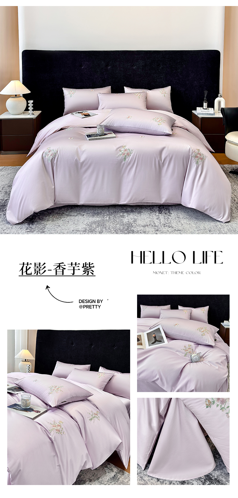 当前位置: 91家纺网 > 商品网购 > 床品套件 > 四件套 > 全棉普通四件套 > (总)莱势 2026新品100支纯棉全棉50x50s贡缎长绒棉刺绣绣花四件套高端礼盒-花影