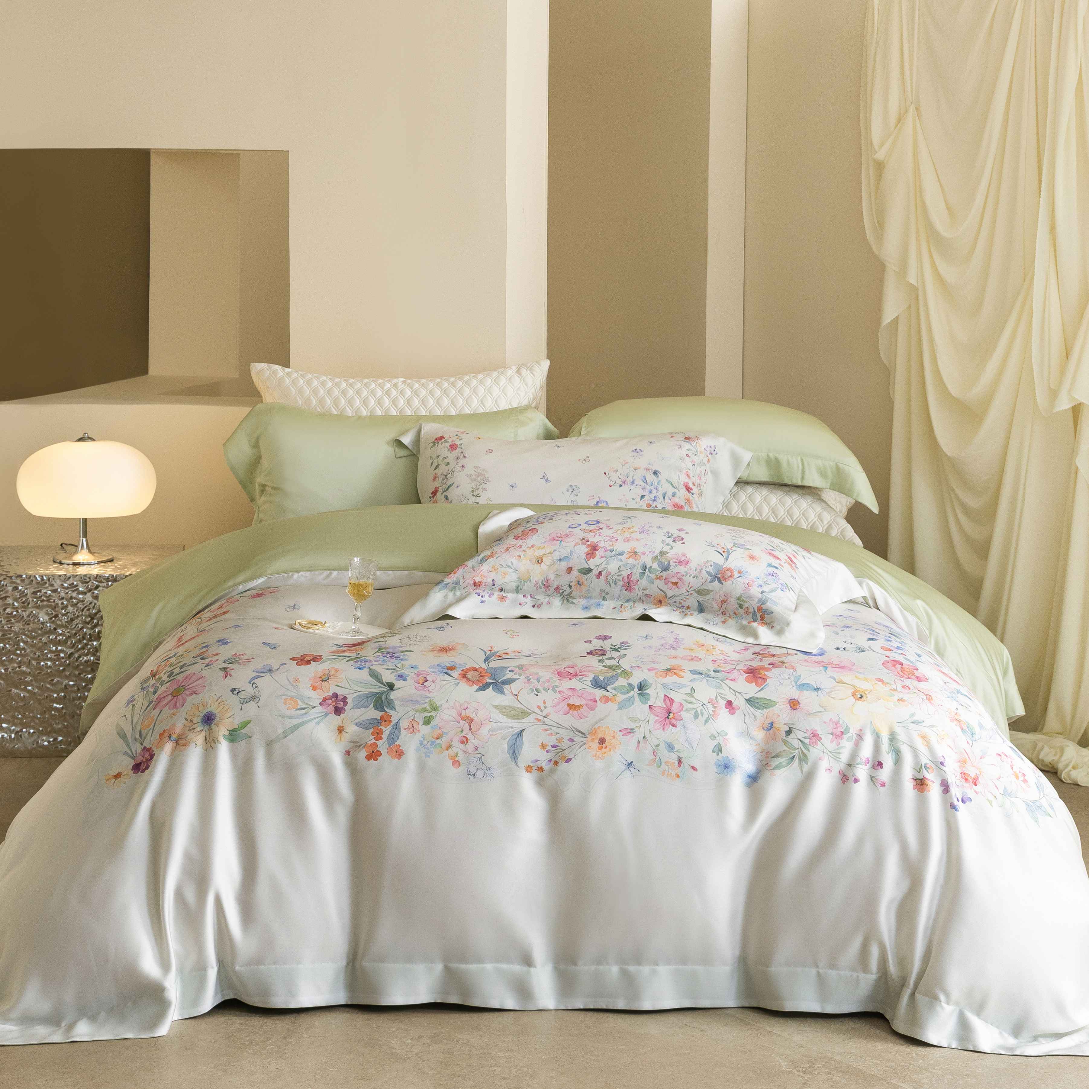 (总)佳汐蓝家纺 2026春夏新款棉麻皱皱双层纱四件套-栀子茉莉 控价:卷后不低于398,栀子茉莉-绿色床单,栀子茉莉-麻色床单