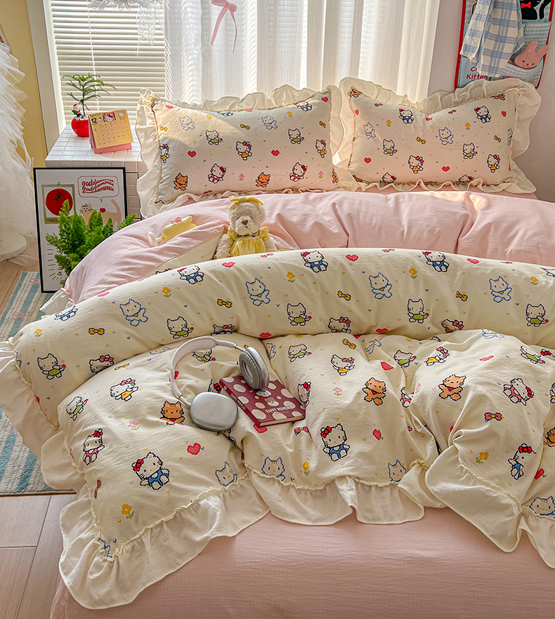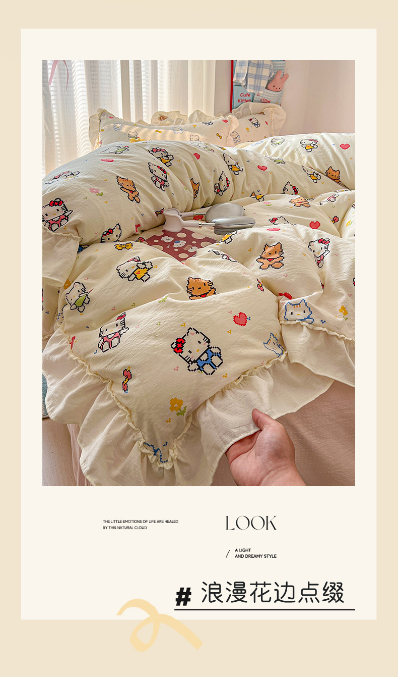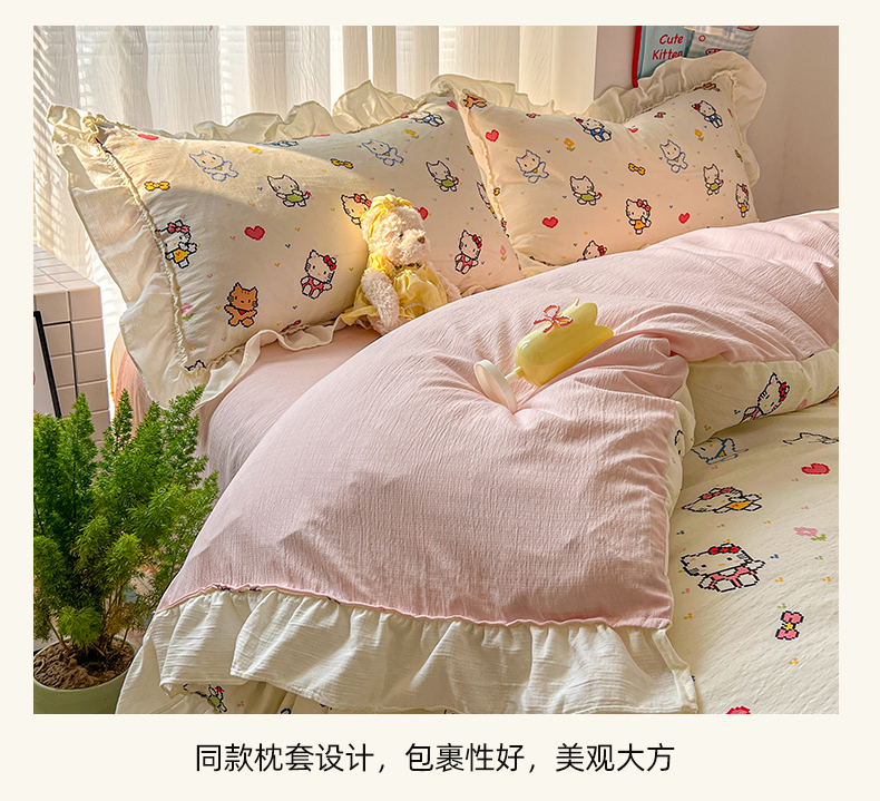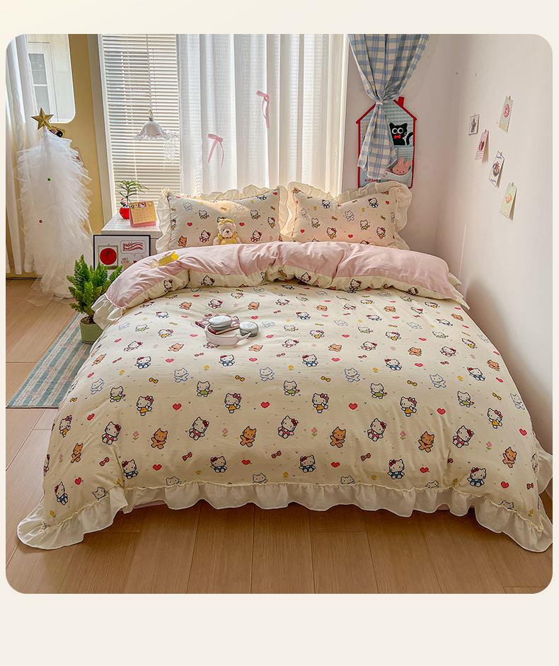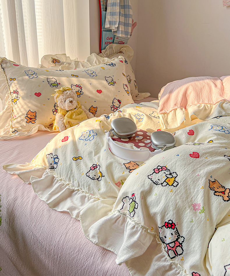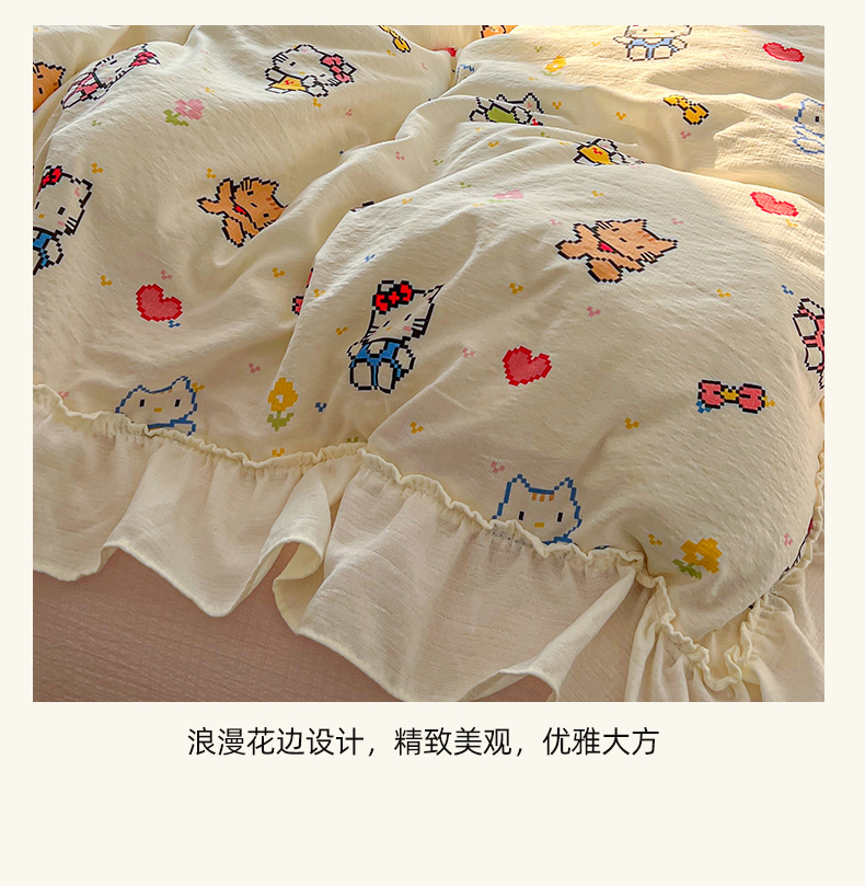 当前位置: 91家纺网 > 商品网购 > 床品套件 > 四件套 > 双层纱四件套 > 老K (原美阁) 2026新款木棉双层纱四件套卡通韩版公主风四件套 爱心猫