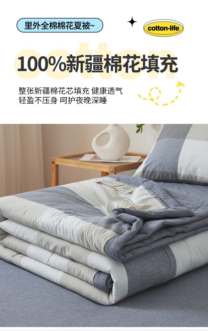 西域种棉人·千百笠 2026新款A类里外全棉夏凉被100%新疆棉纯棉全棉填充无印格子款空调被夏被 里外全棉-蓝大格