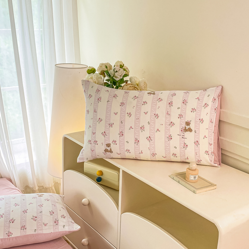 商品名称:雅阁尔家纺 2026新款轻奢复古美拉德风泡芙棉冷淡侘寂风水洗棉双层纱单枕套 花园小熊