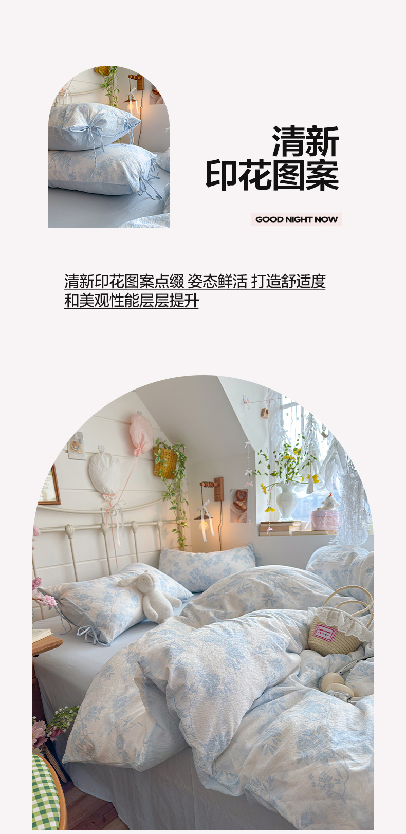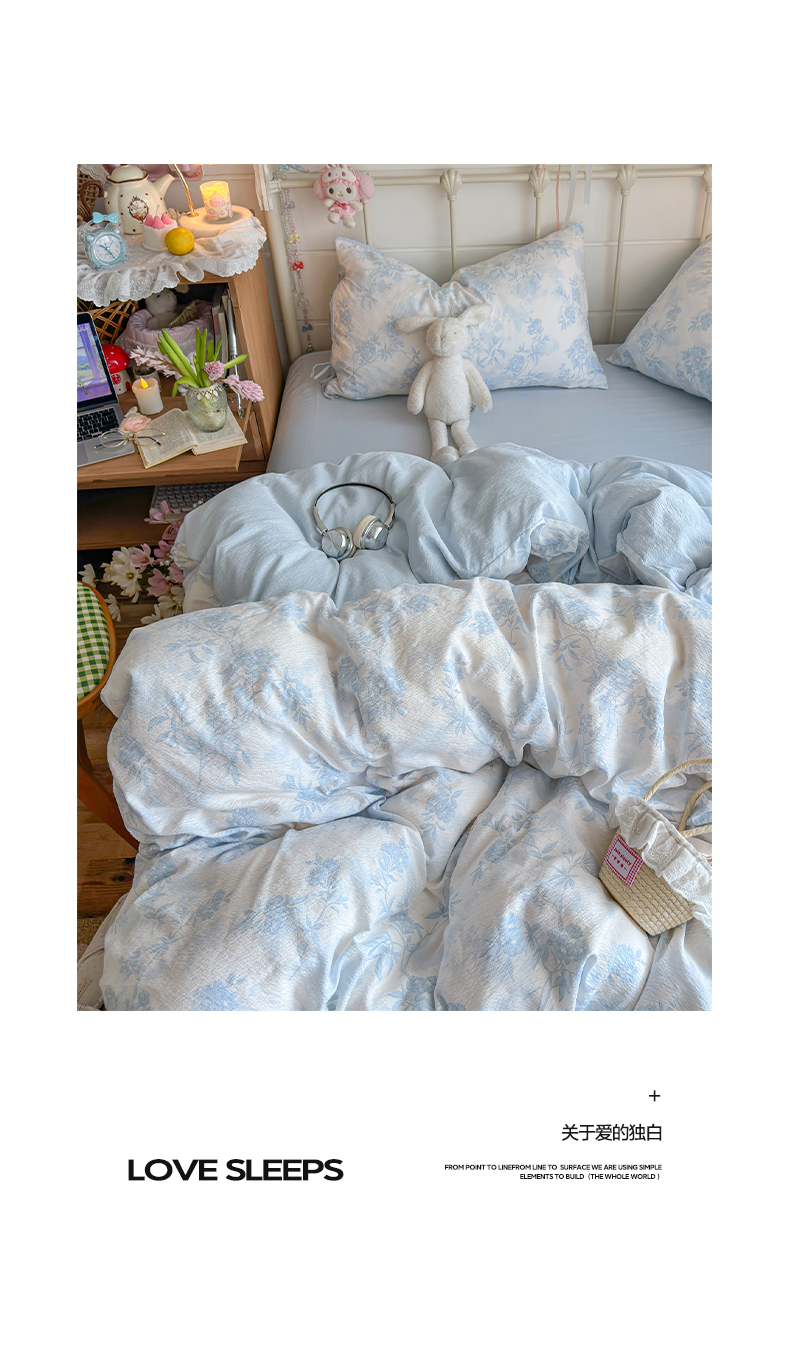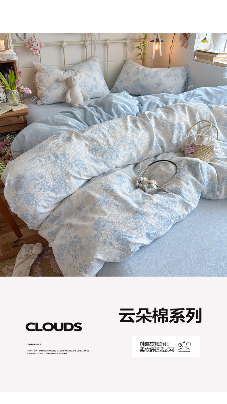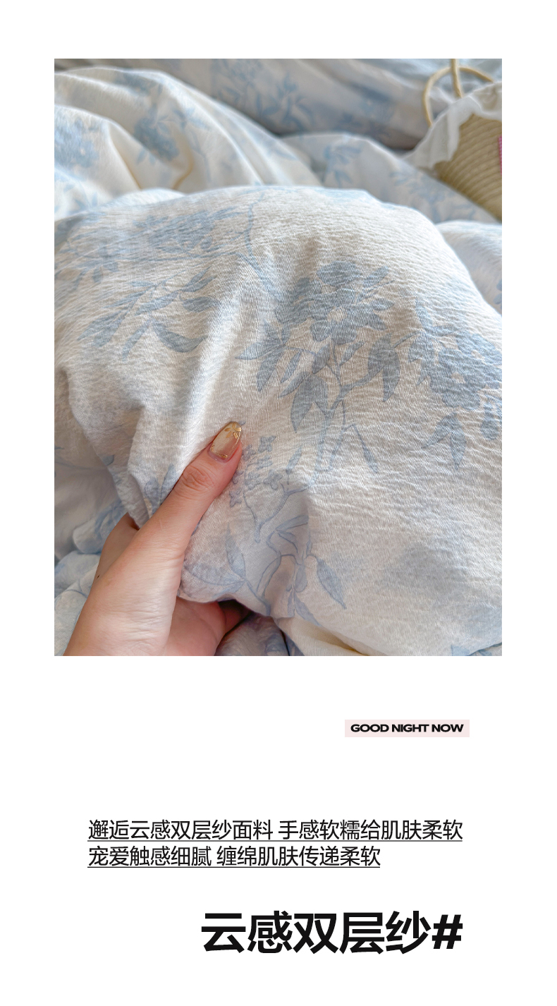 当前位置: 91家纺网 > 商品网购 > 床品套件 > 四件套 > 双层纱四件套 > 优选 2026新款小清新直播热卖款云感双层纱木棉四件套系列(小红书热款推荐) 冰菱花