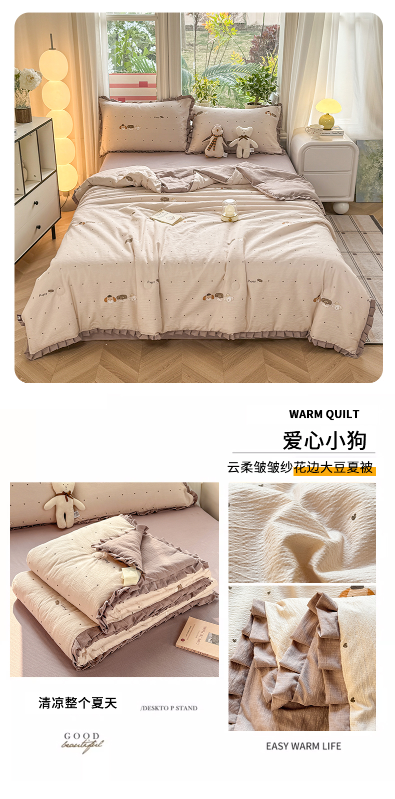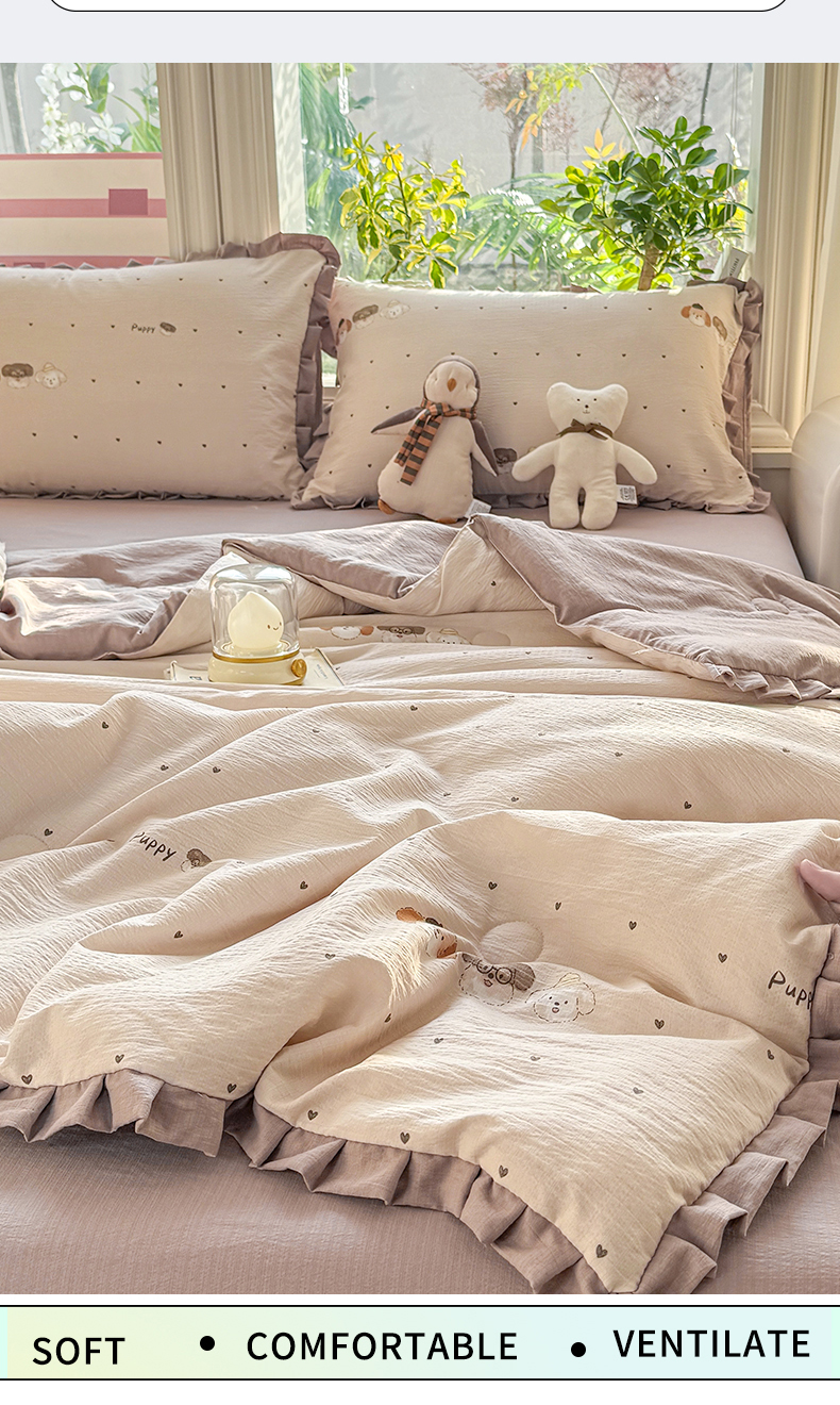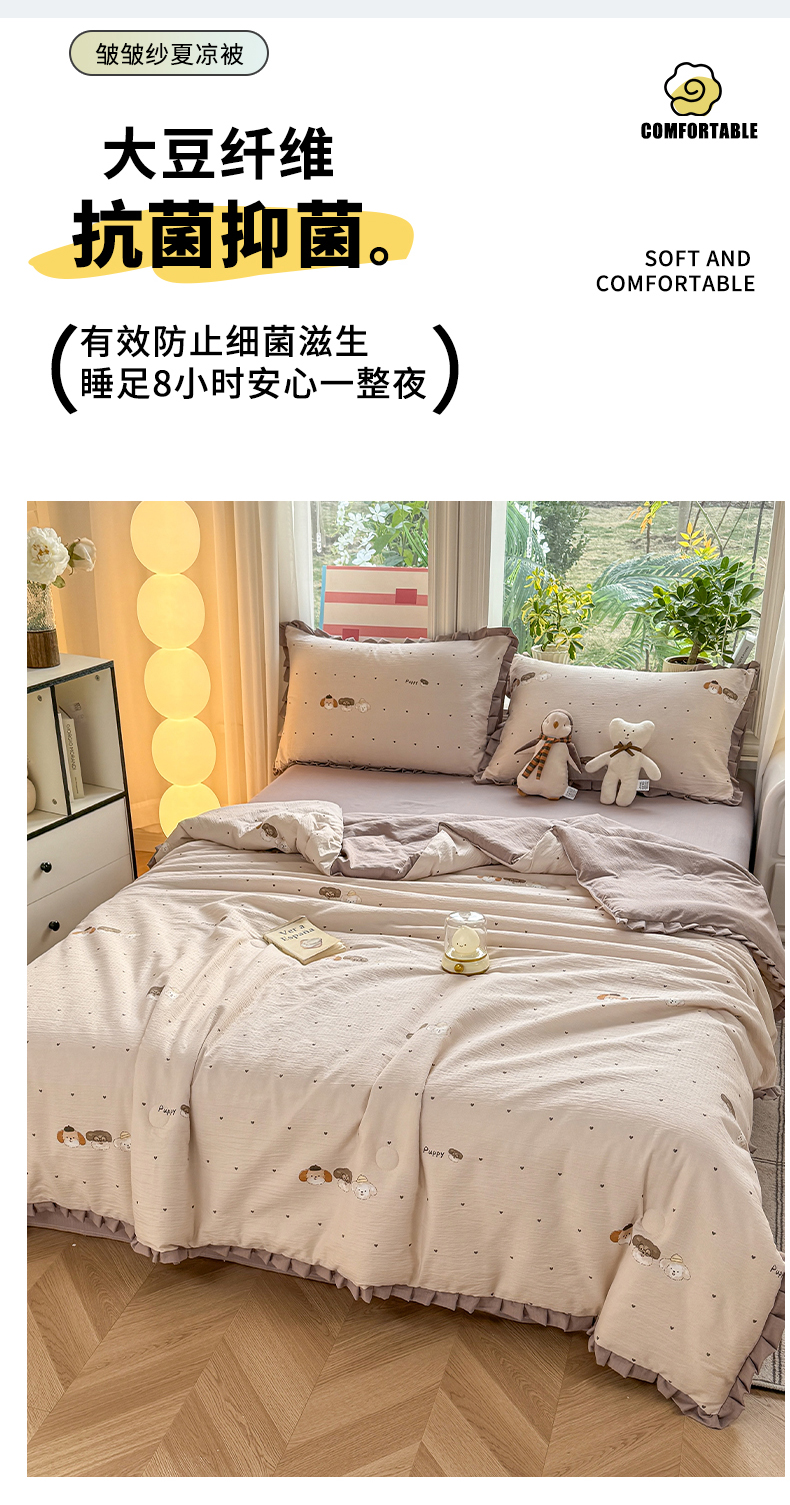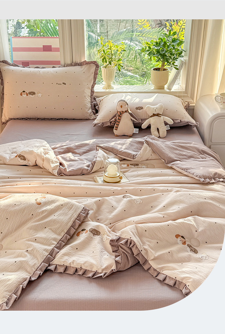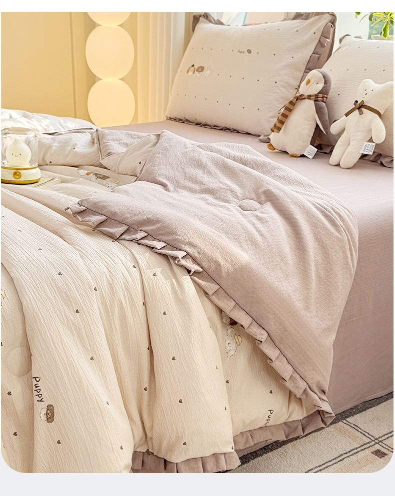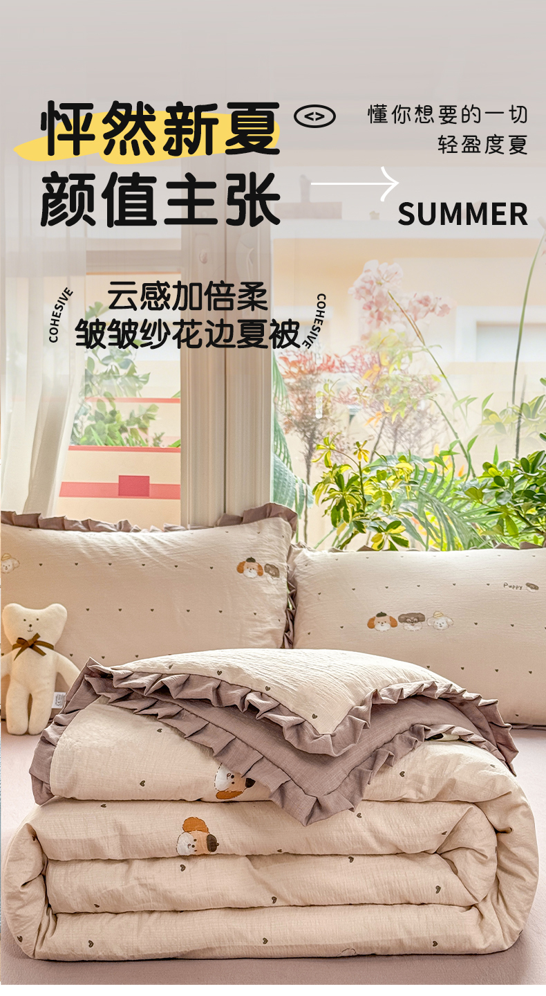 • 91家纺网 家纺一手货源 找家纺 丽美人家纺 2026新款皱皱纱花边夏被被夏凉被空调被 HB爱心小狗