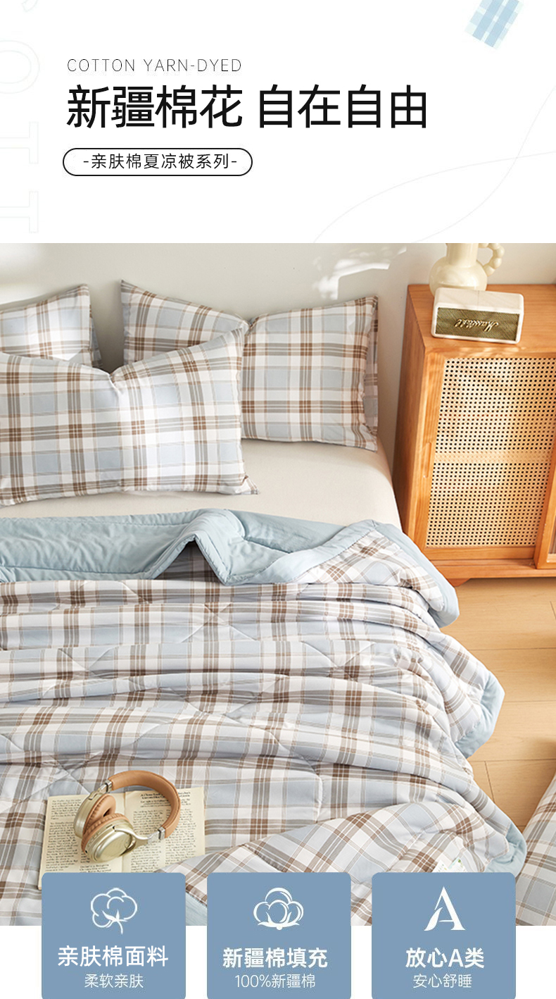 商品名称:海洋家纺 2026新款100%新疆棉花格子夏被亲肤仿棉夏凉被纯手包边空调被薄被子 英伦-蓝