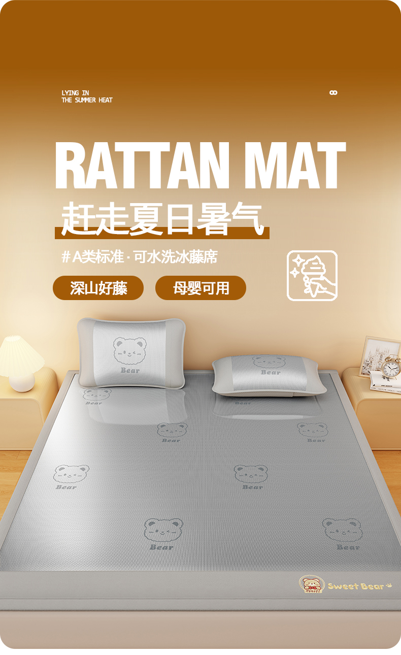 当前位置: 91家纺网 > 商品网购 > 床上用品 > 凉席 > 冰丝席 > 卡初家居(原微来) 2026春夏新款快乐熊水洗冰藤床席款床笠款 快乐熊-香槟金-床席款