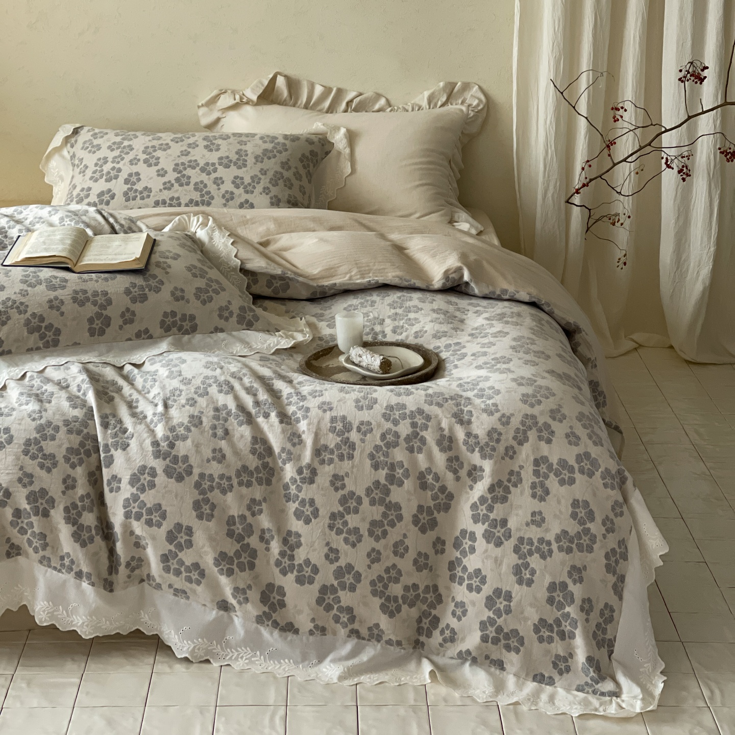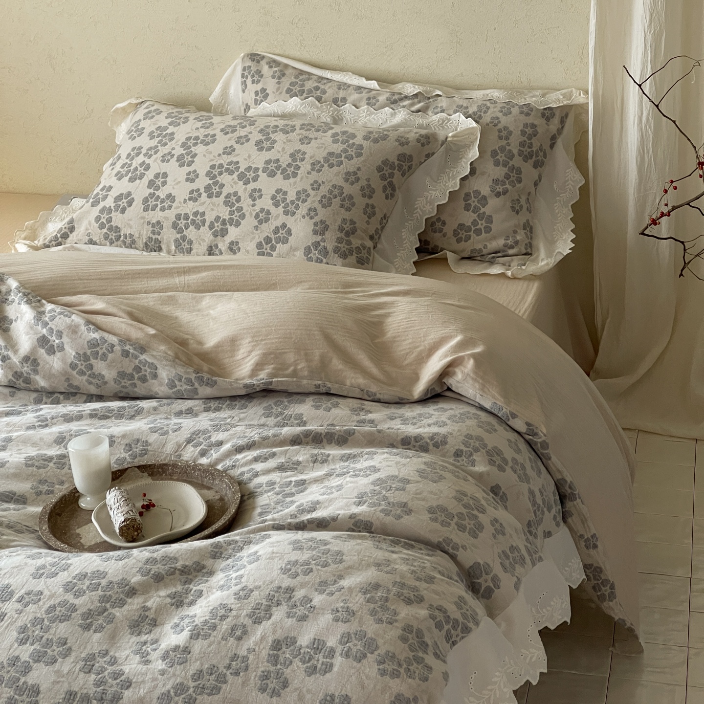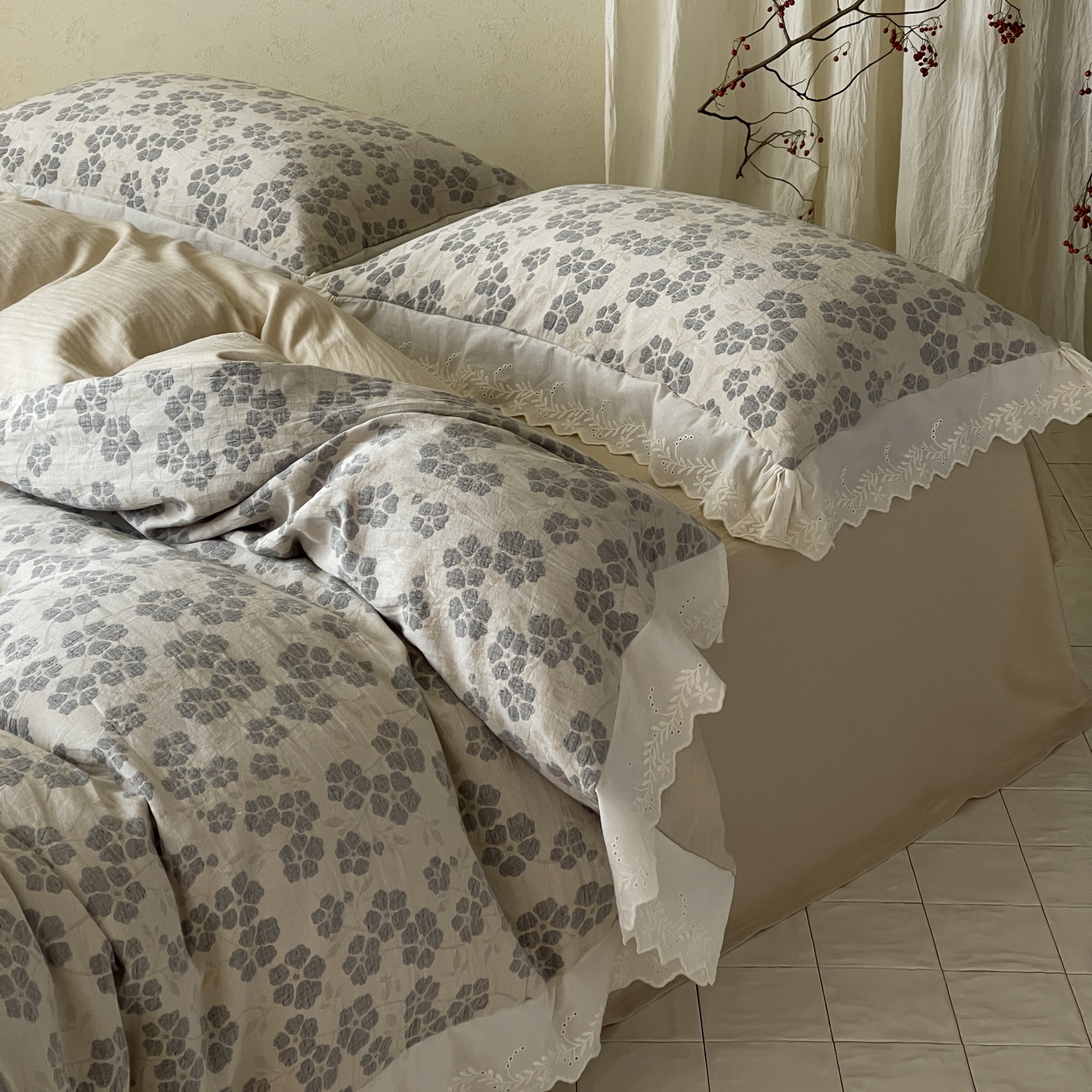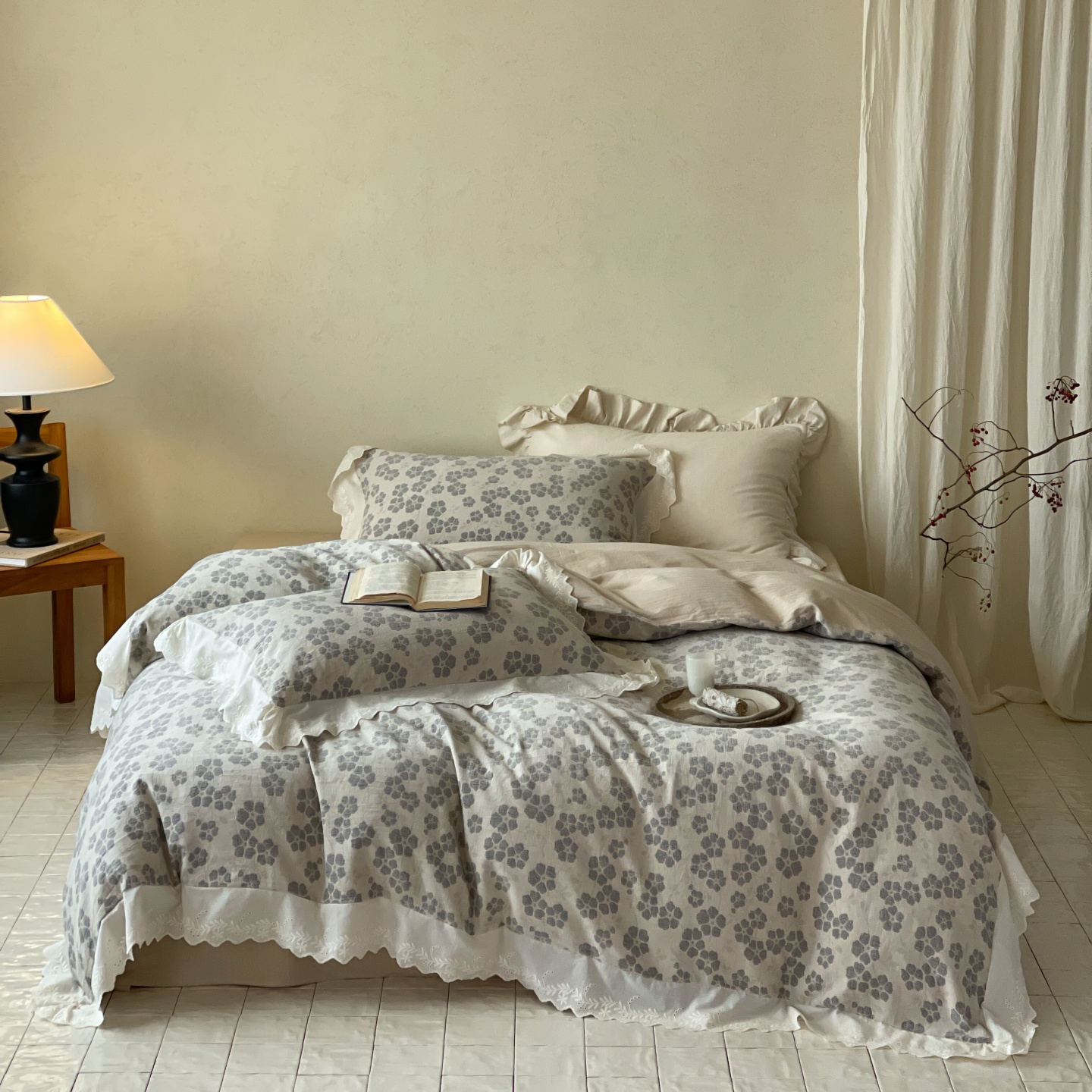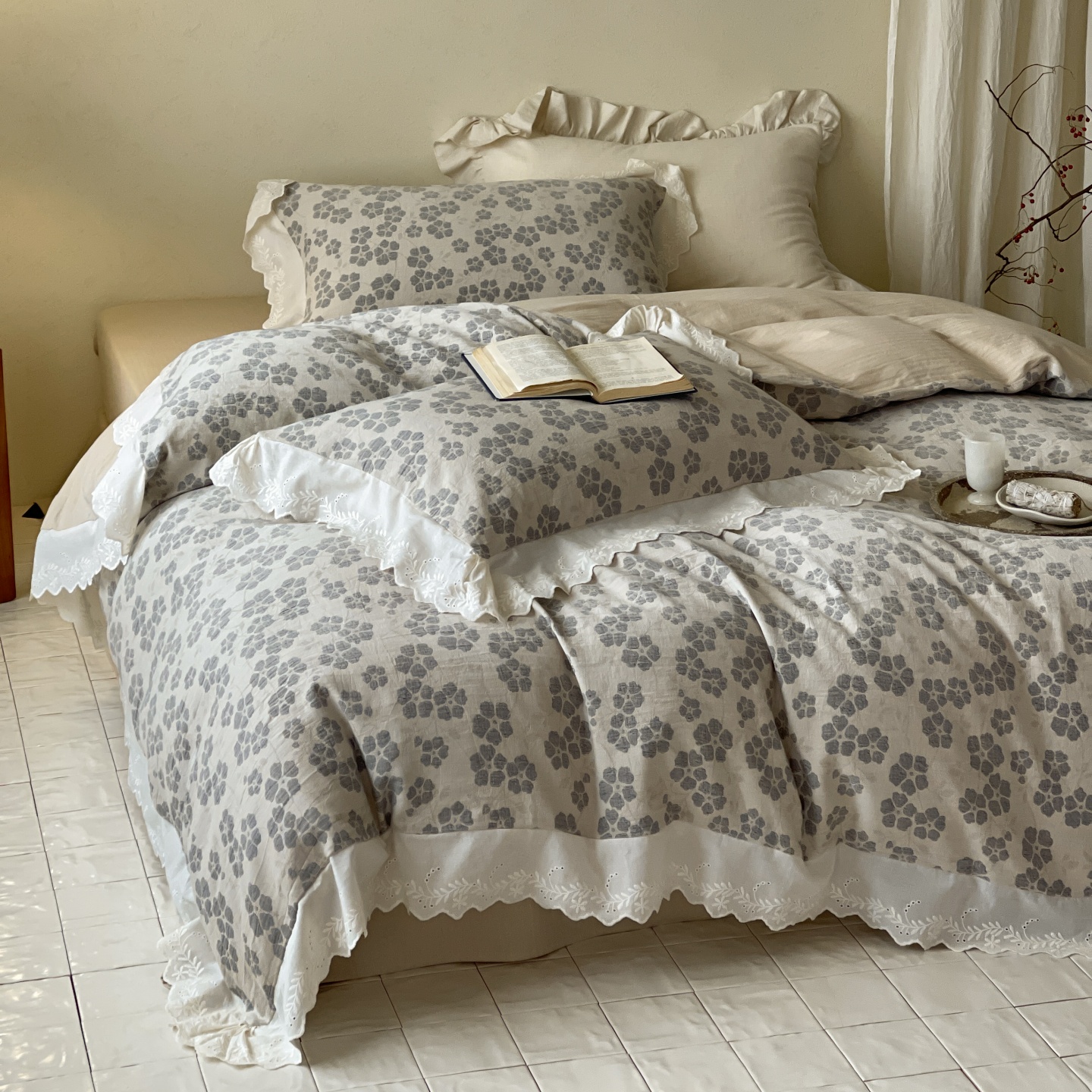 当前位置: 91家纺网 > 商品网购 > 床品套件 > 四件套 > 全棉普通四件套 > 云上 2026春夏新款全棉纯棉色织大提空气层提花法式花边款四件套--花悦 花悦-米灰