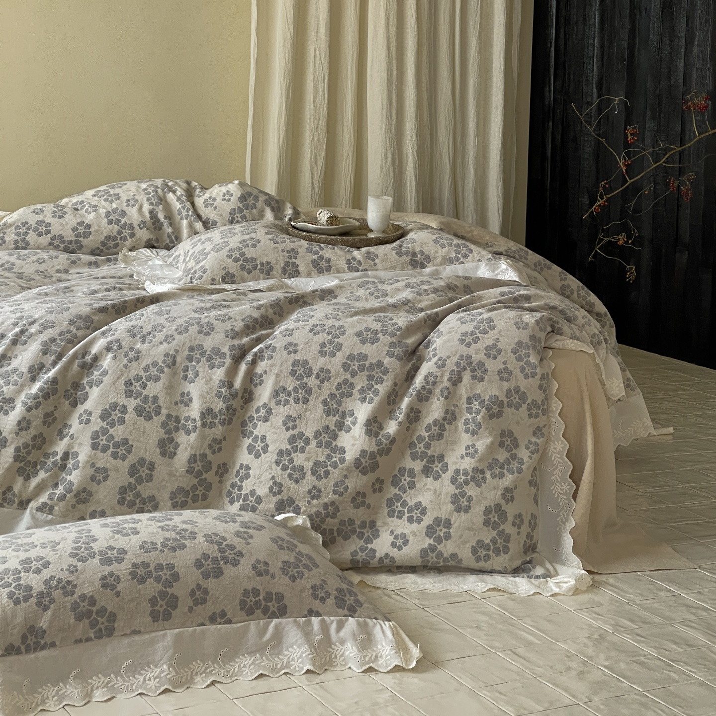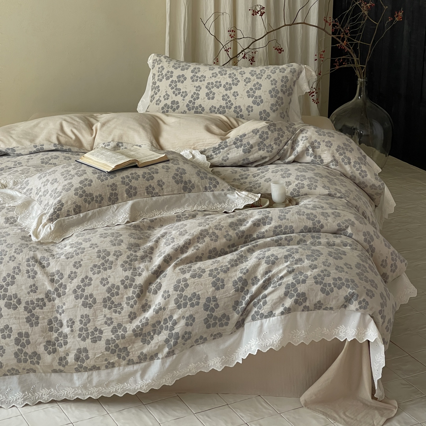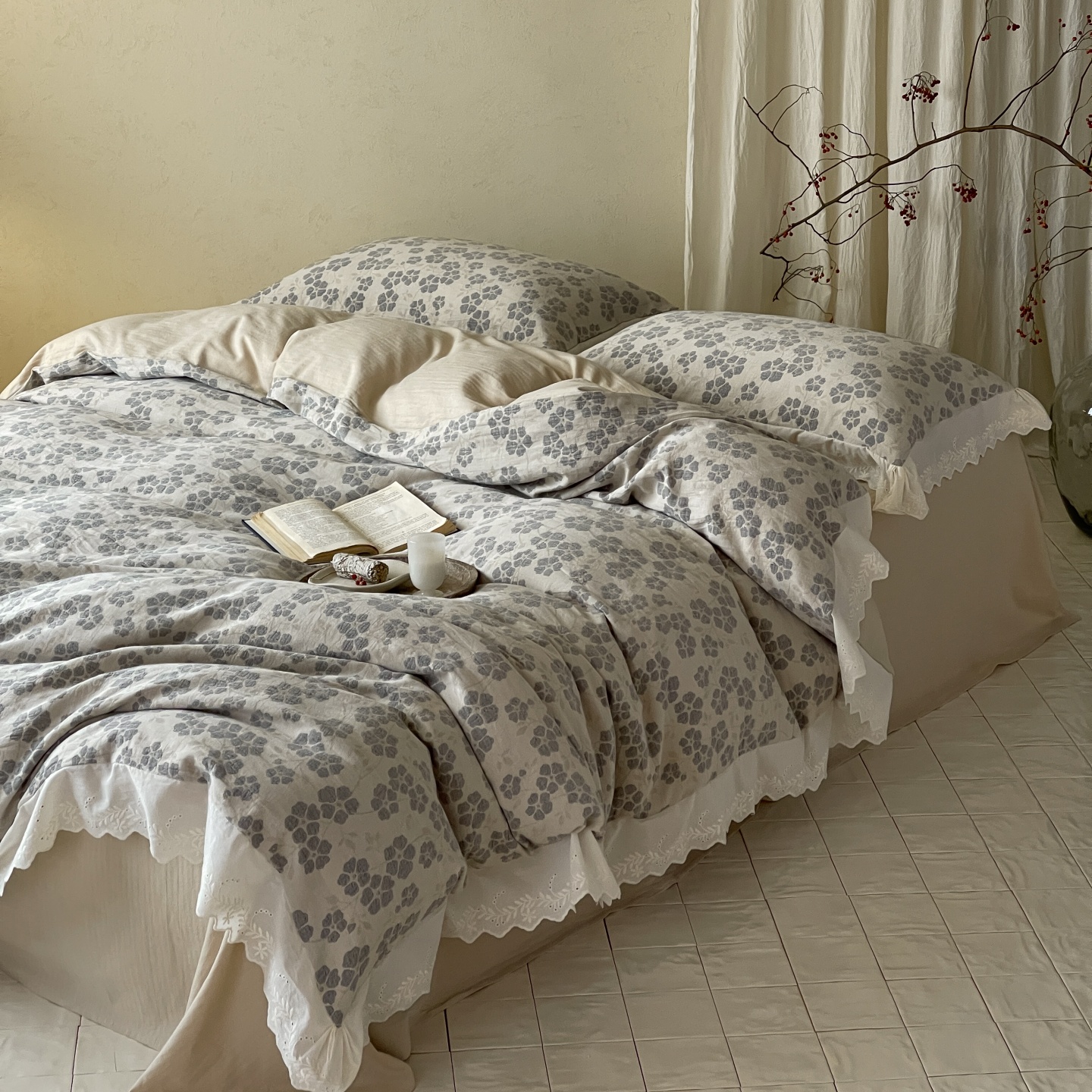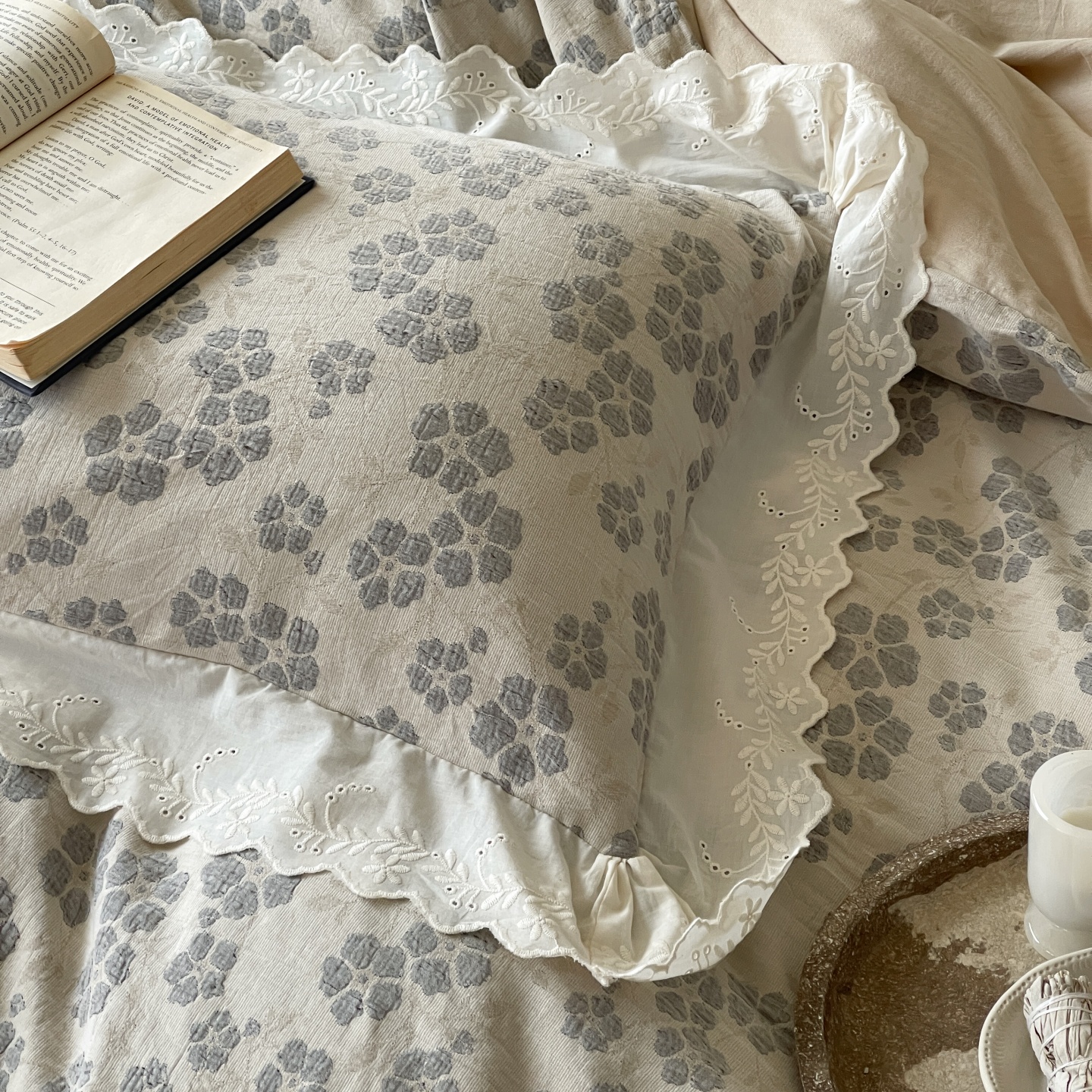 当前位置: 91家纺网 > 商品网购 > 床品套件 > 四件套 > 全棉普通四件套 > 云上 2026春夏新款全棉纯棉色织大提空气层提花法式花边款四件套--花悦 花悦-米灰