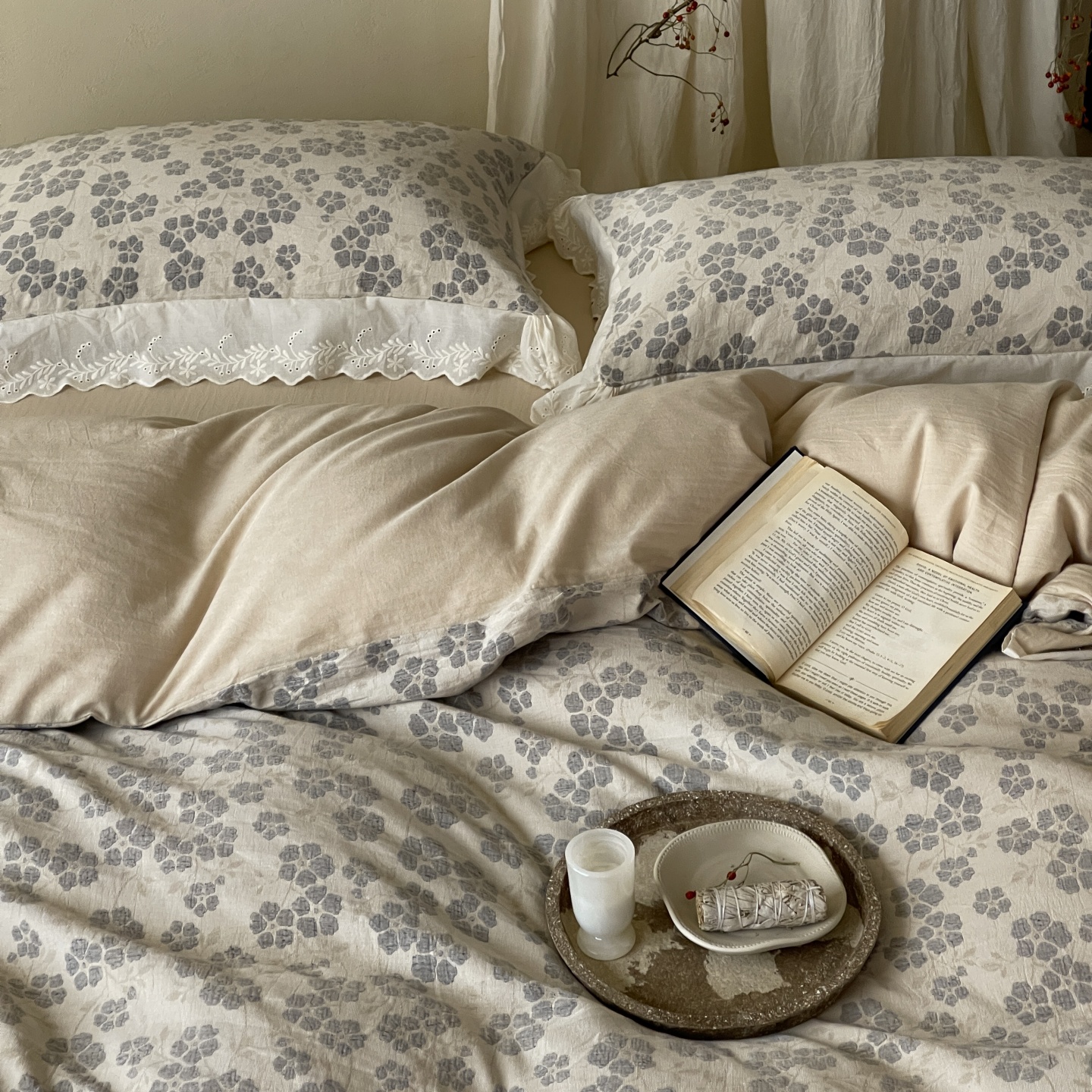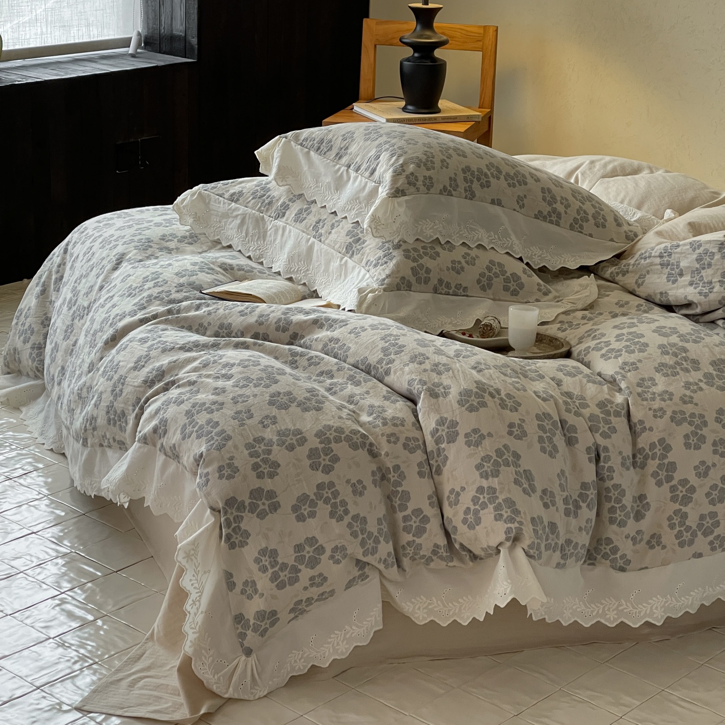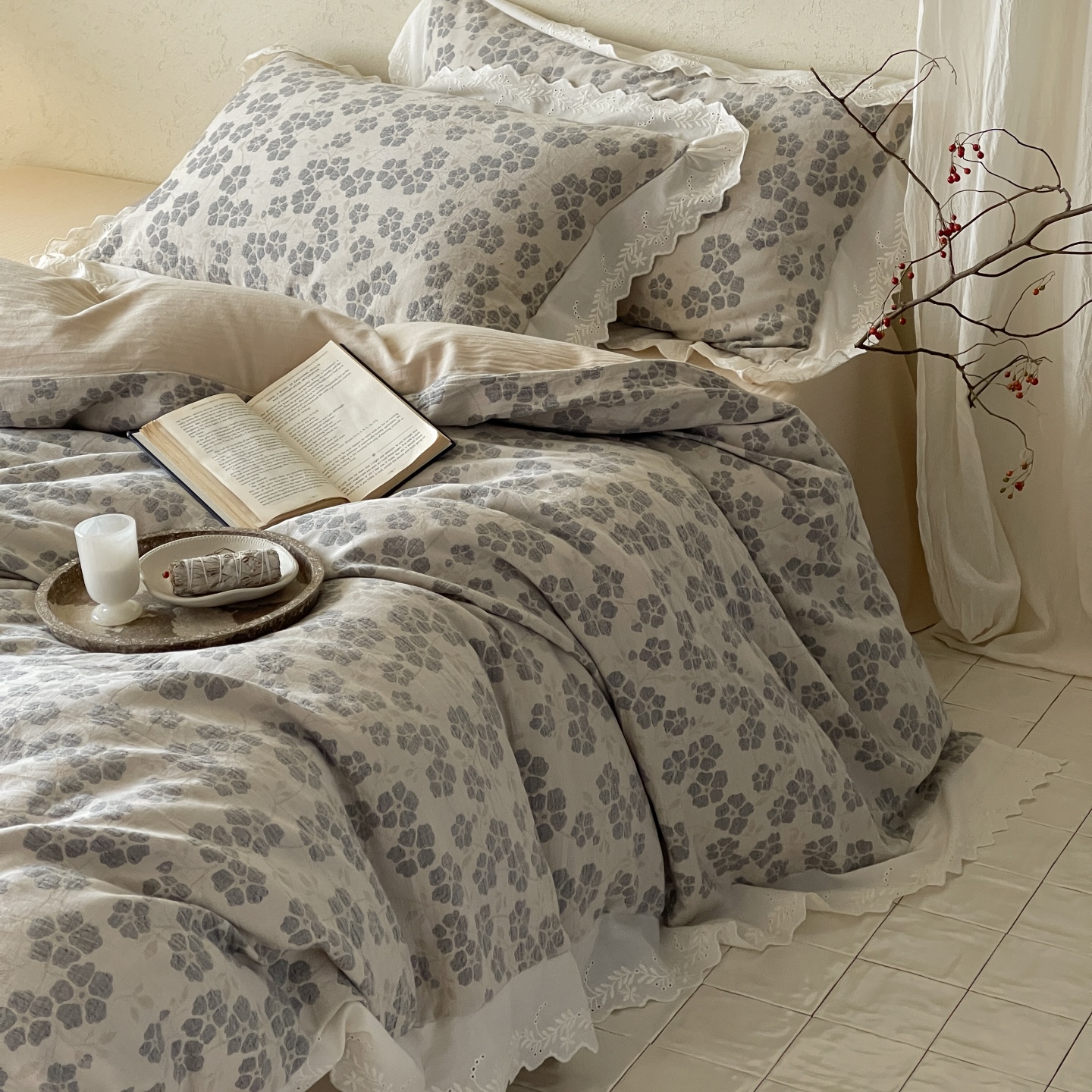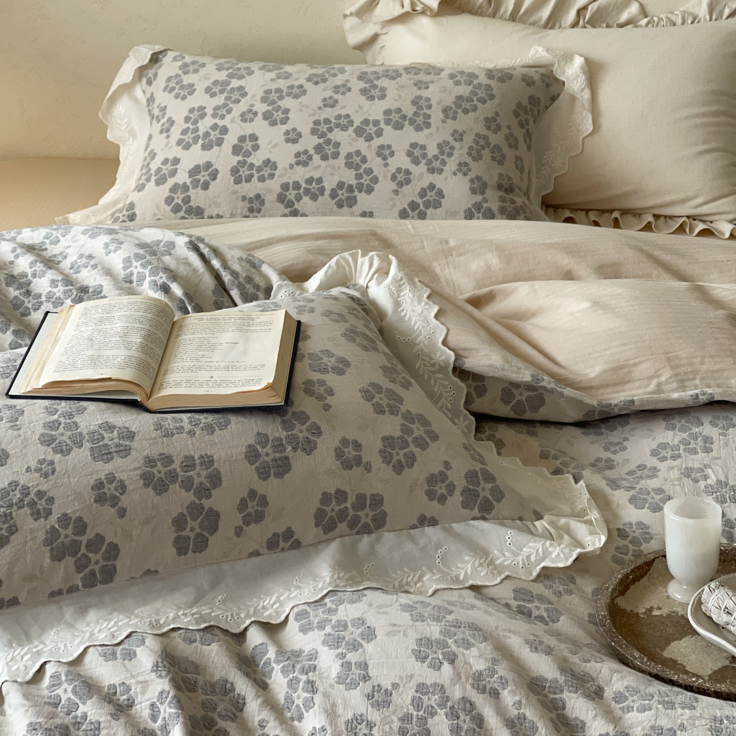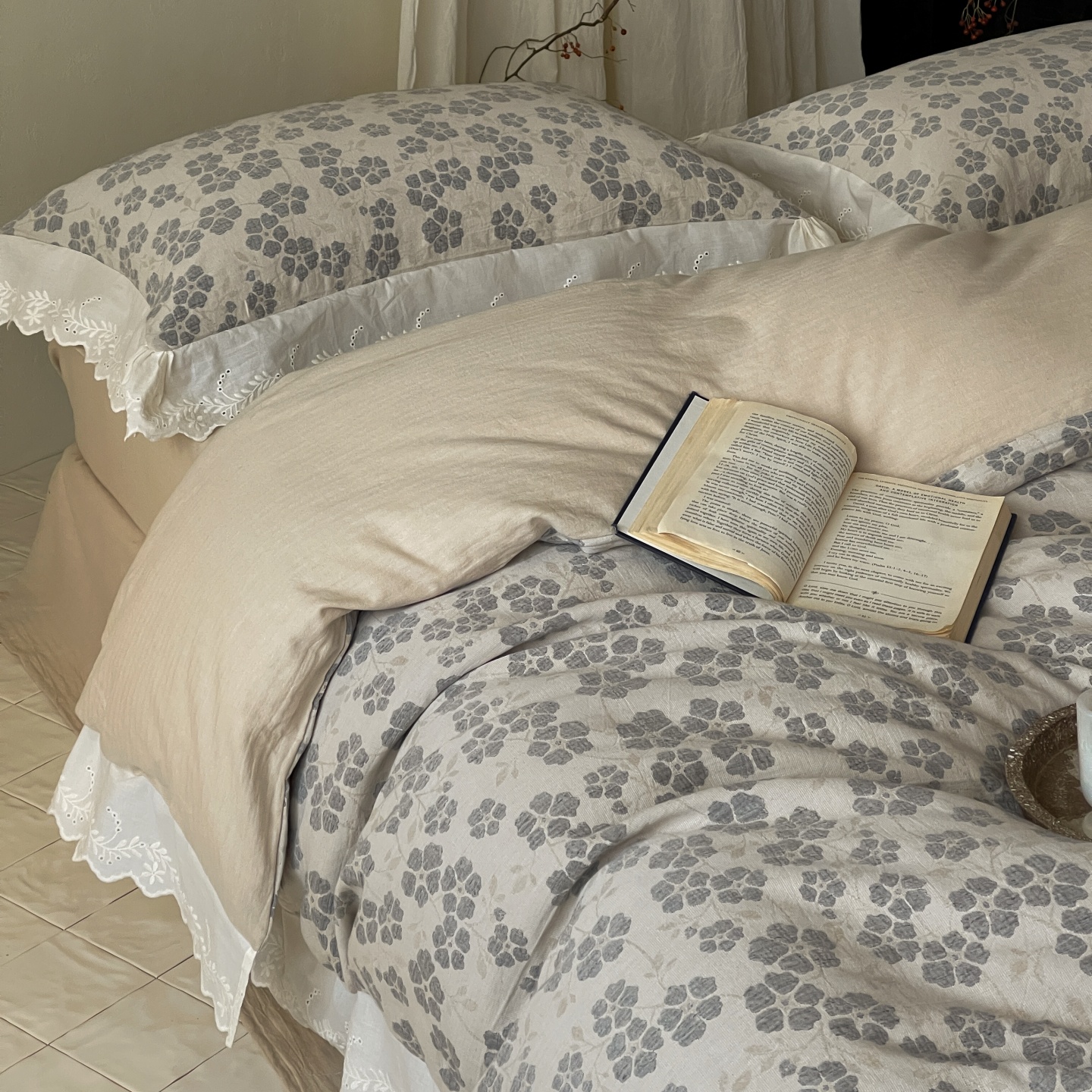 当前位置: 91家纺网 > 商品网购 > 床品套件 > 四件套 > 全棉普通四件套 > 云上 2026春夏新款全棉纯棉色织大提空气层提花法式花边款四件套--花悦 花悦-米灰