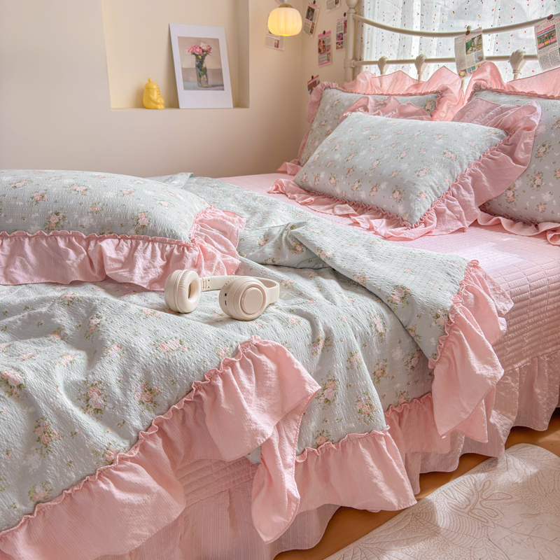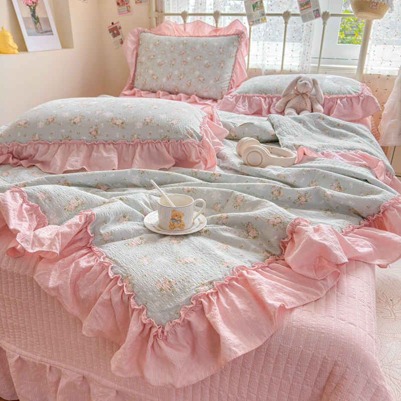 梵希雅 2026新款泡芙纱纯棉蕾丝花边夏被四件套 花丛萌免,花丛萌免