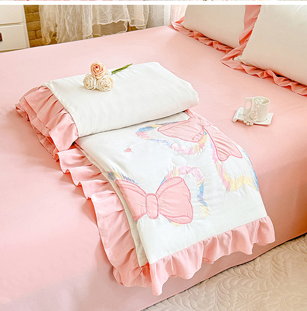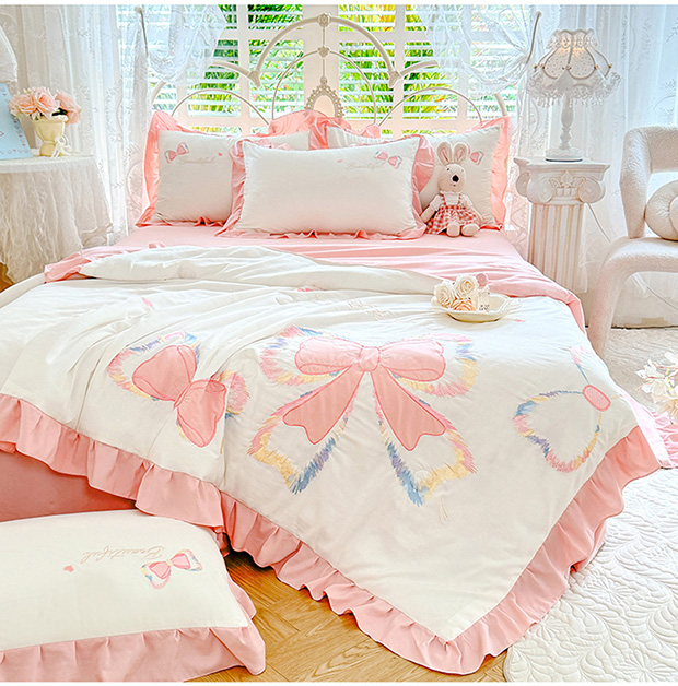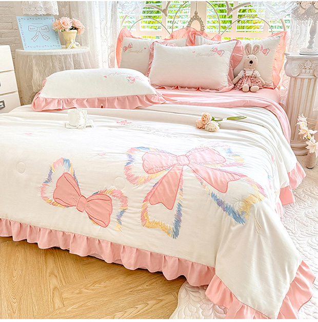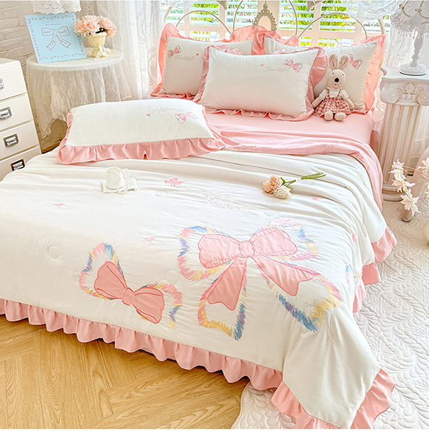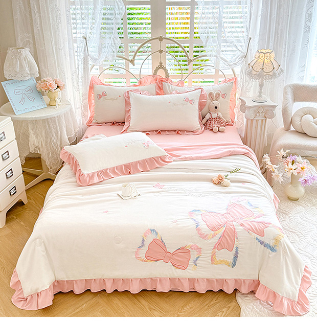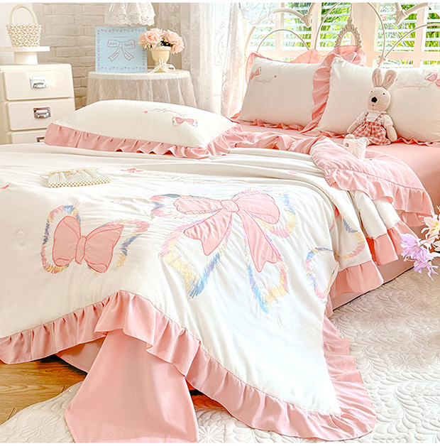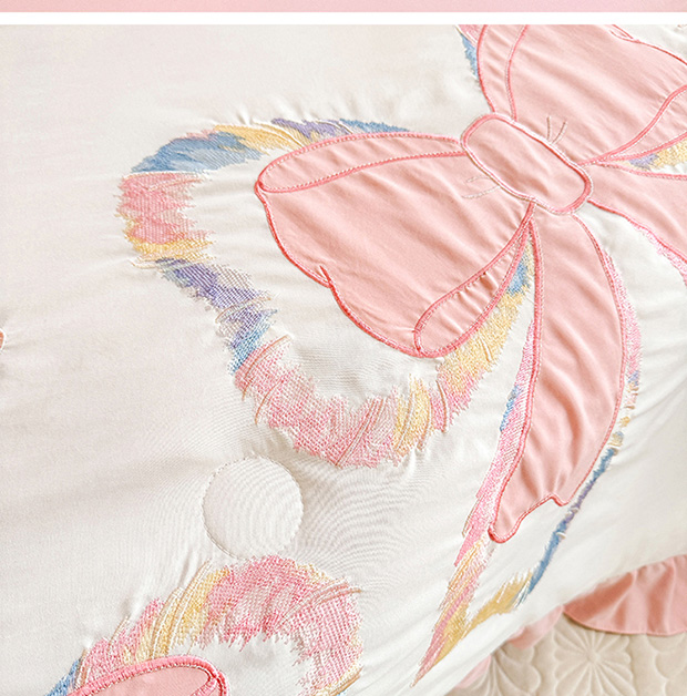 绒棉世家 2026新款水洗棉贴布绣专版夏被四件套 邂逅蝴蝶结粉