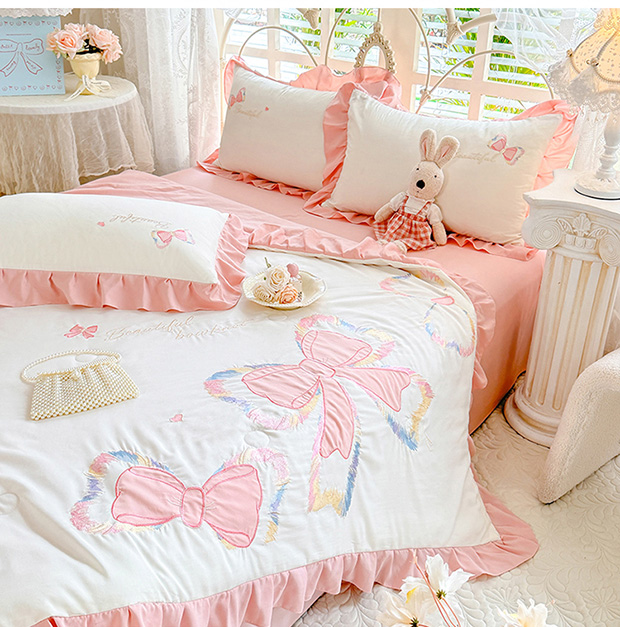商品名称:绒棉世家 2026新款水洗棉贴布绣专版夏被四件套 邂逅蝴蝶结粉