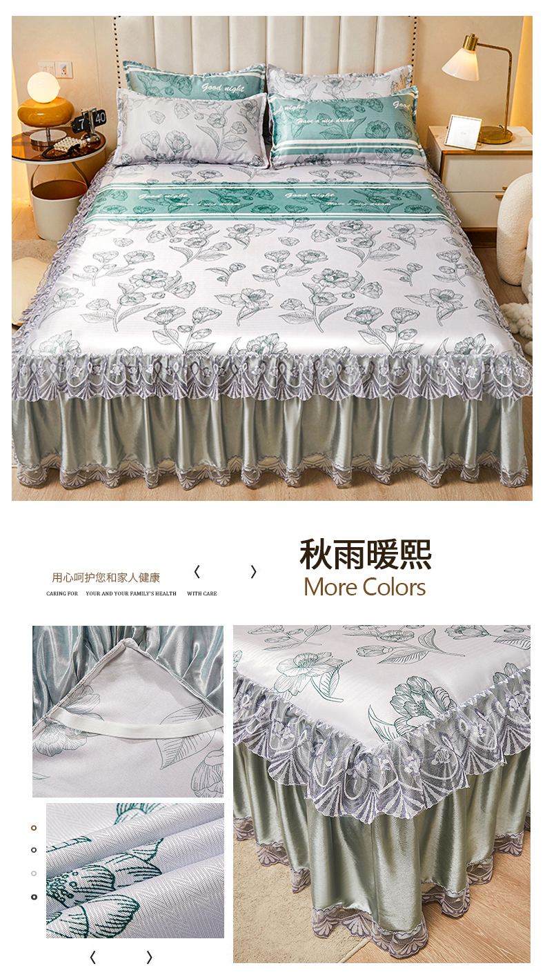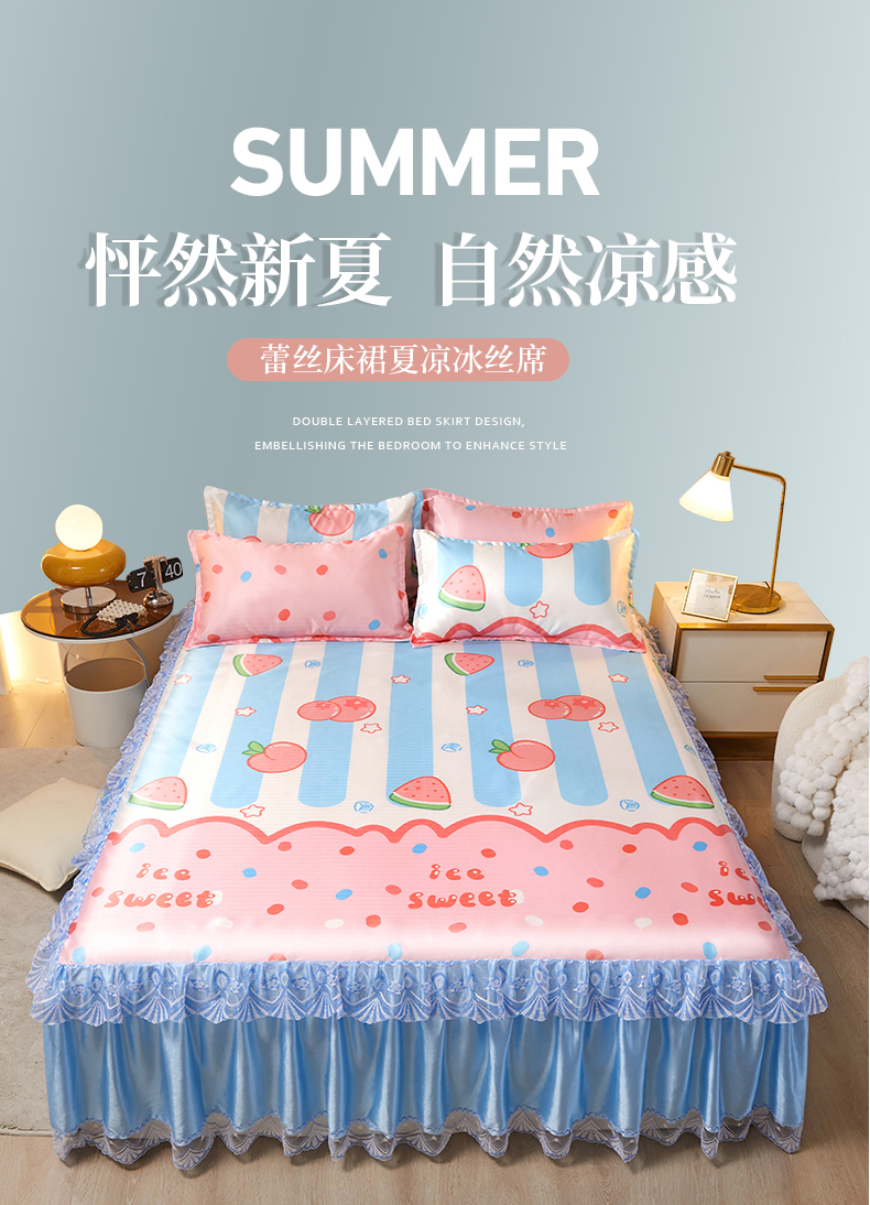 妖妖家纺 2026新款双层蕾丝床裙夏凉冰丝席 欧式风情