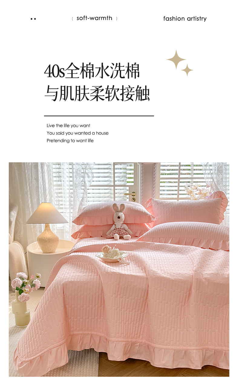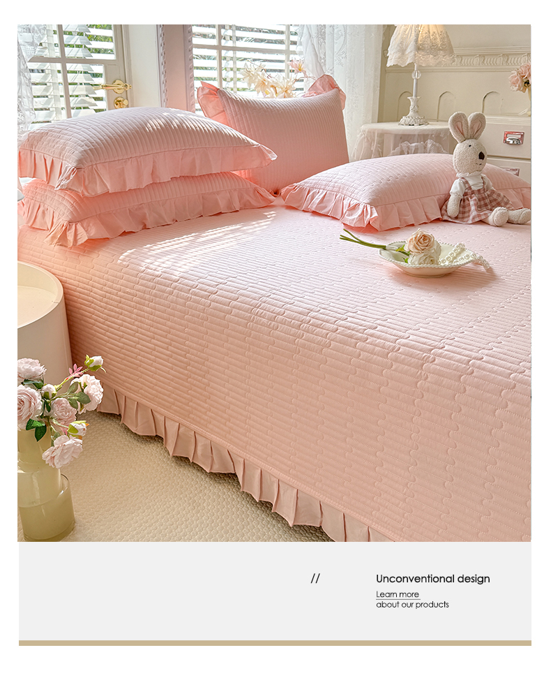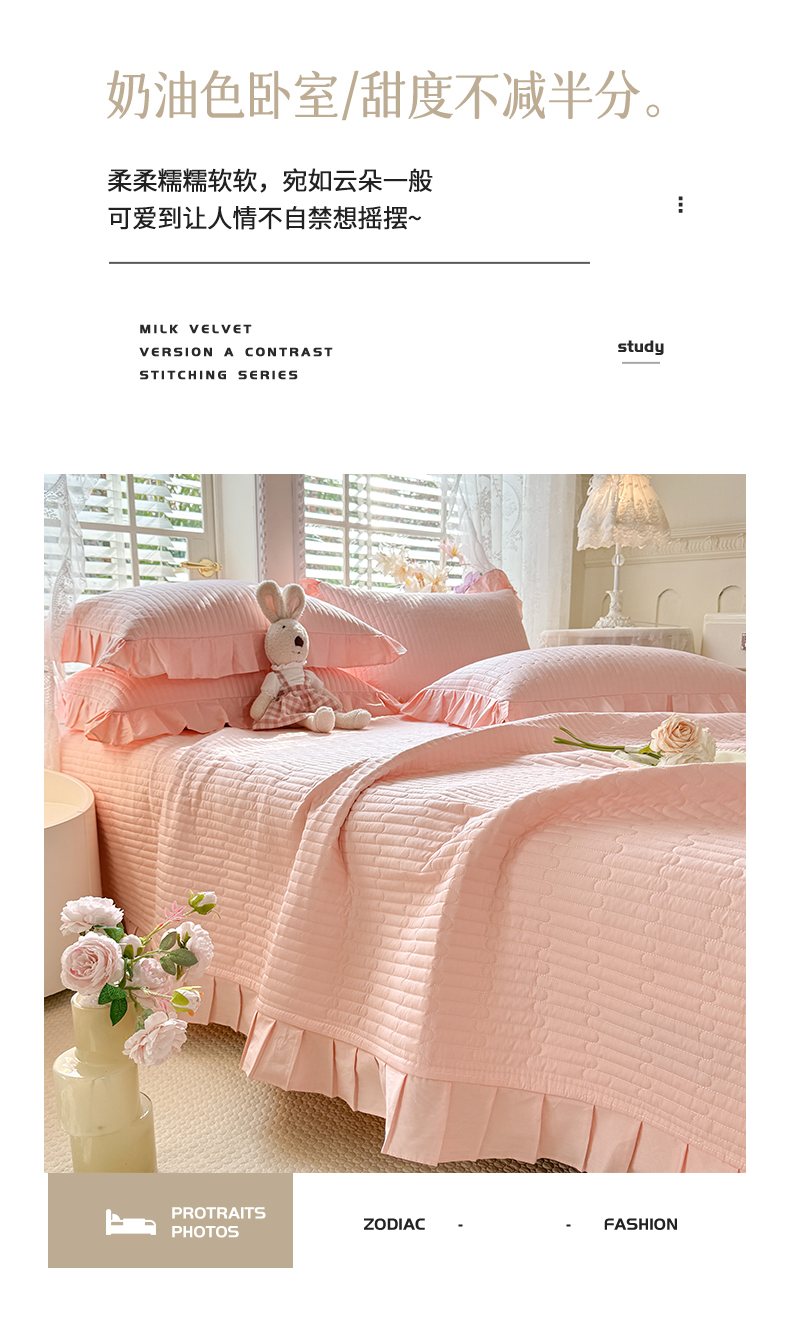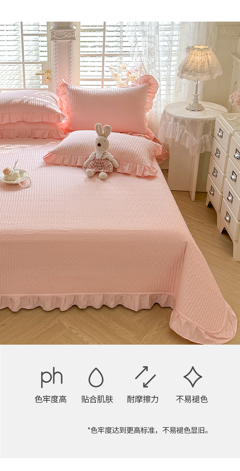 • 91家纺网 家纺一手货源 找家纺 花香四季家纺 2026新款13376全棉夹棉床盖三件套13372纯棉纯色床盖花边公主风(可定制任意尺寸) 甜心粉