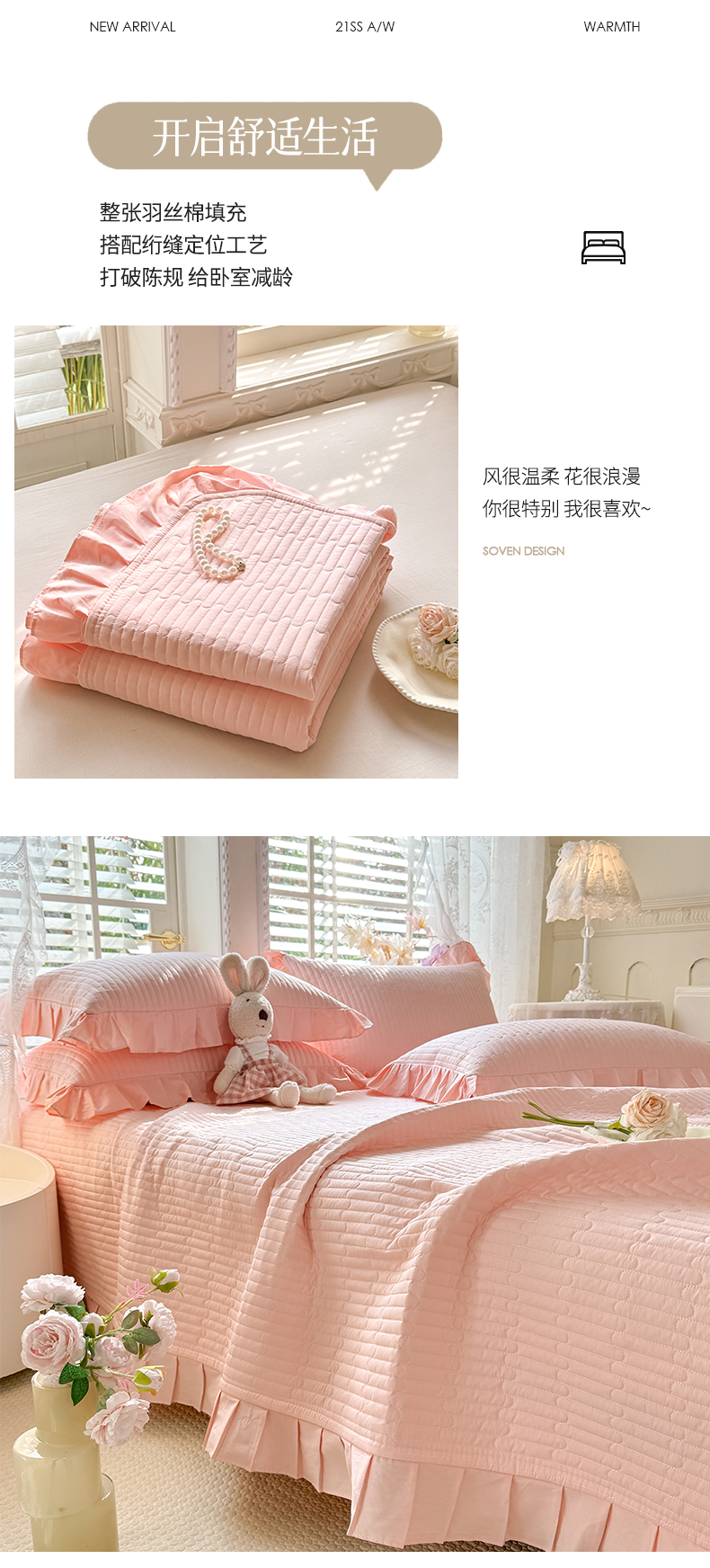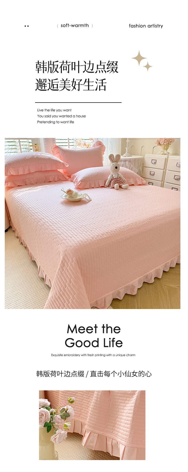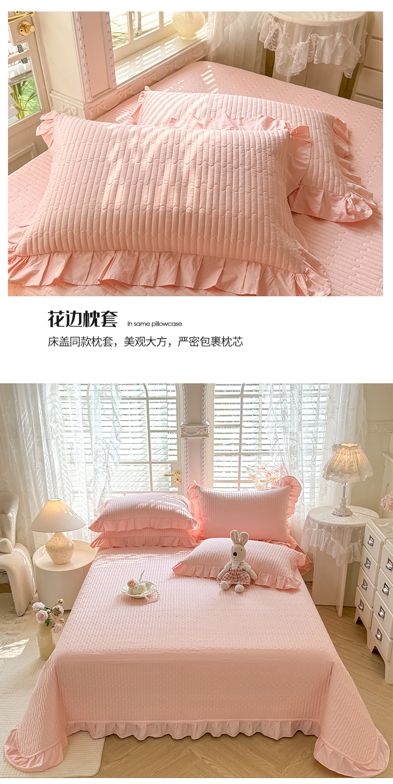 • 91家纺网 家纺一手货源 找家纺 花香四季家纺 2026新款13376全棉夹棉床盖三件套13372纯棉纯色床盖花边公主风(可定制任意尺寸) 甜心粉