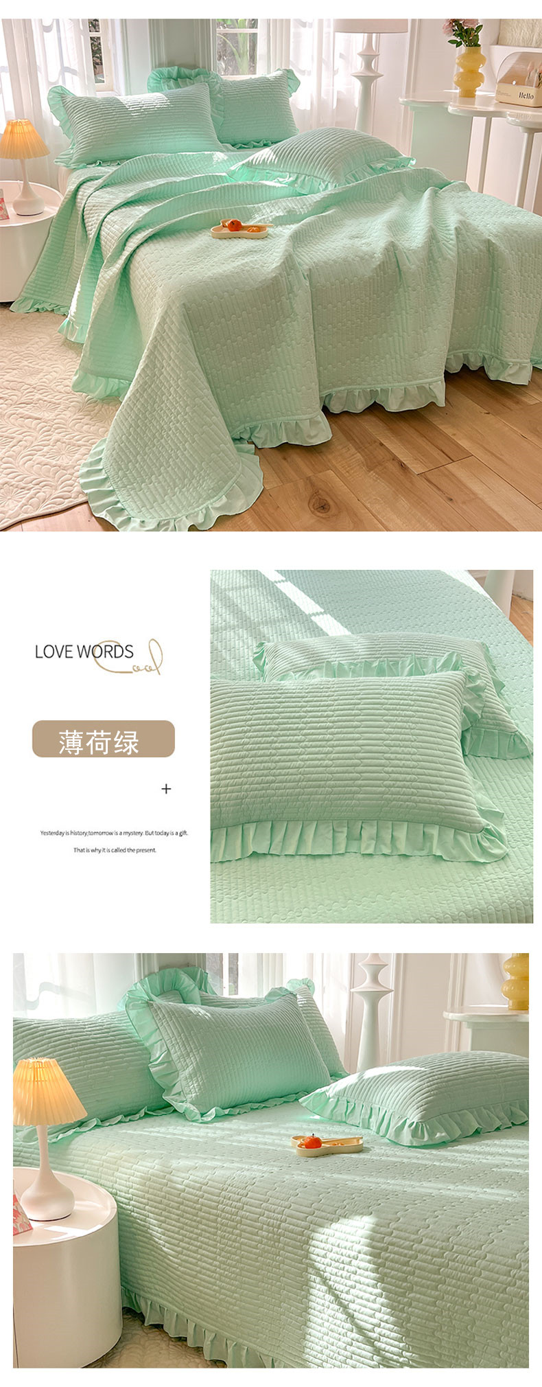• 91家纺网 家纺一手货源 找家纺 (总)花香四季家纺 2026新款13376全棉夹棉床盖三件套13372纯棉纯色床盖花边公主风(可定制任意尺寸),薄荷绿,清新蓝,奶酪黄,气质灰,甜心粉,豆沙色,暮林绿,荔枝粉,象牙白,芝士黄,组合图