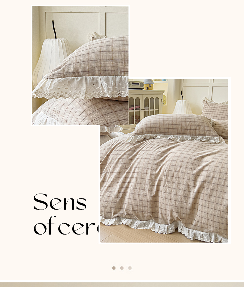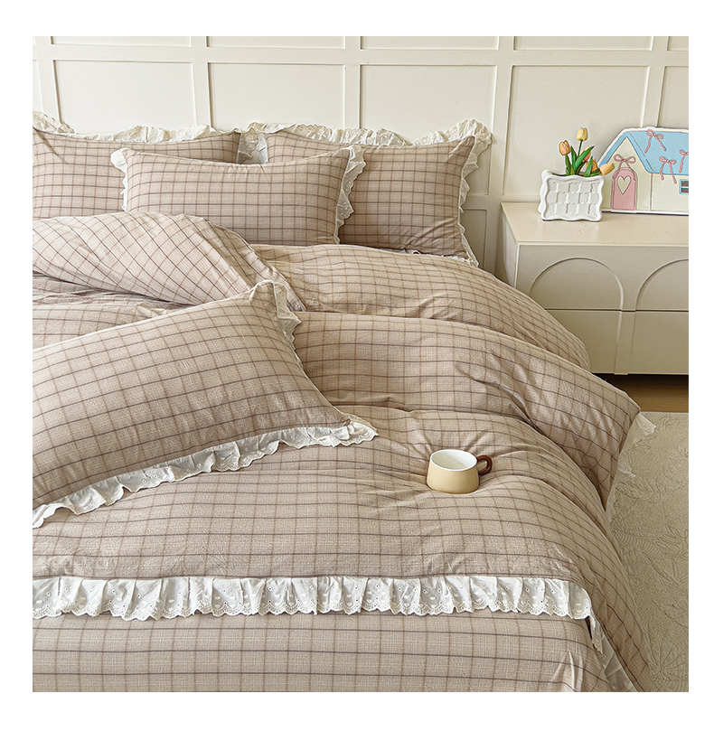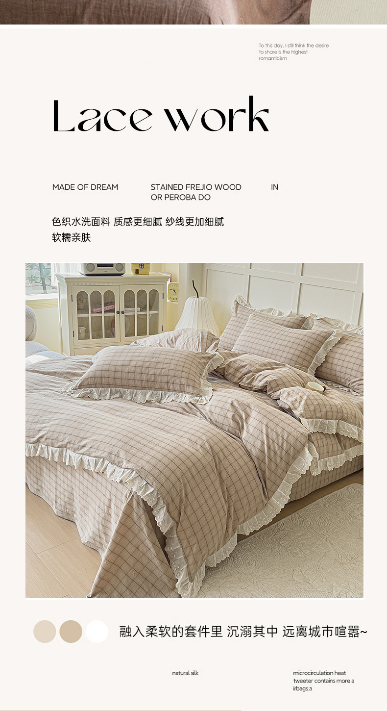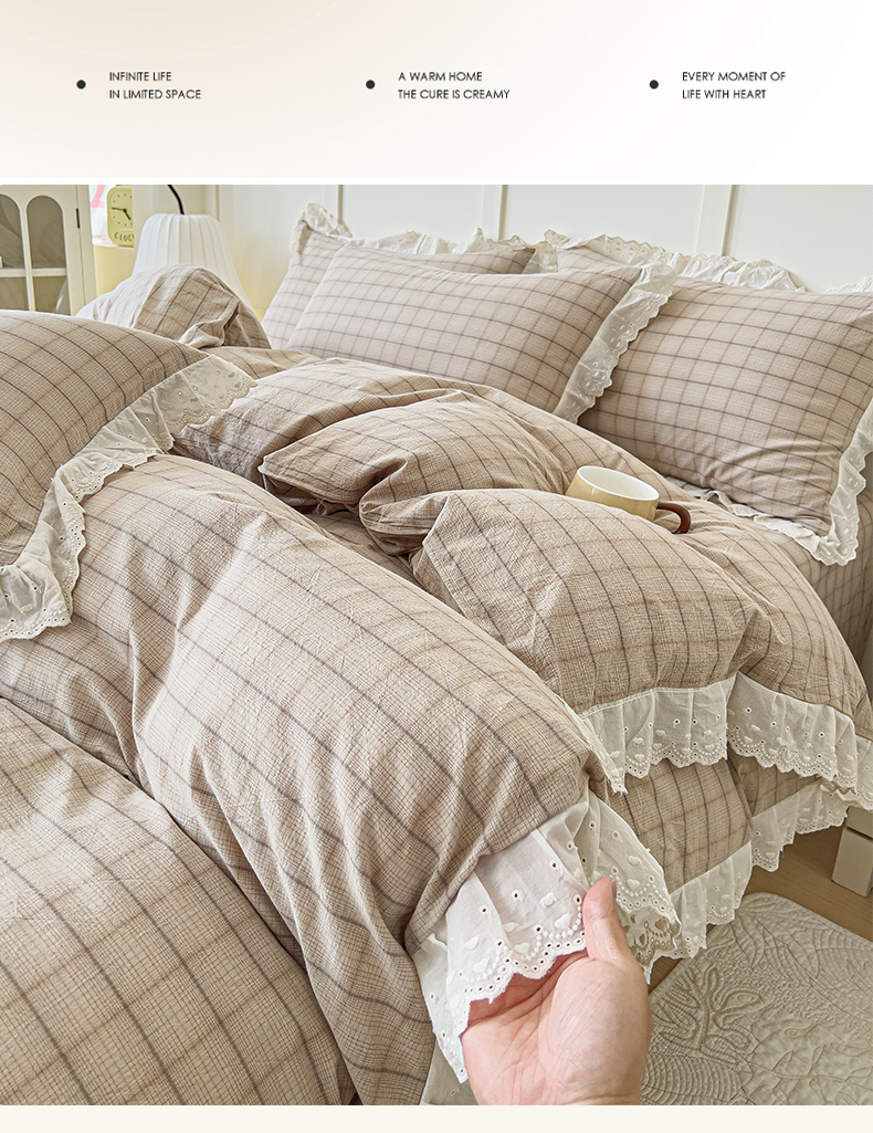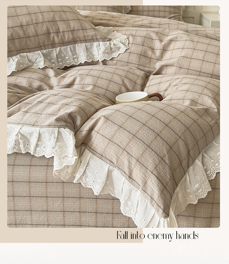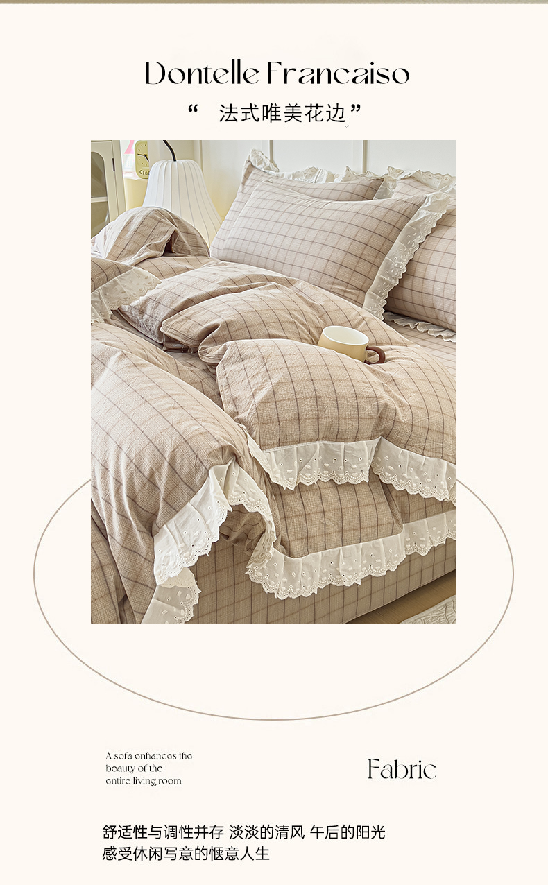 花香四季家纺 2026全棉色织水洗棉法式公主风花边床单款床笠款四件套 南初咖