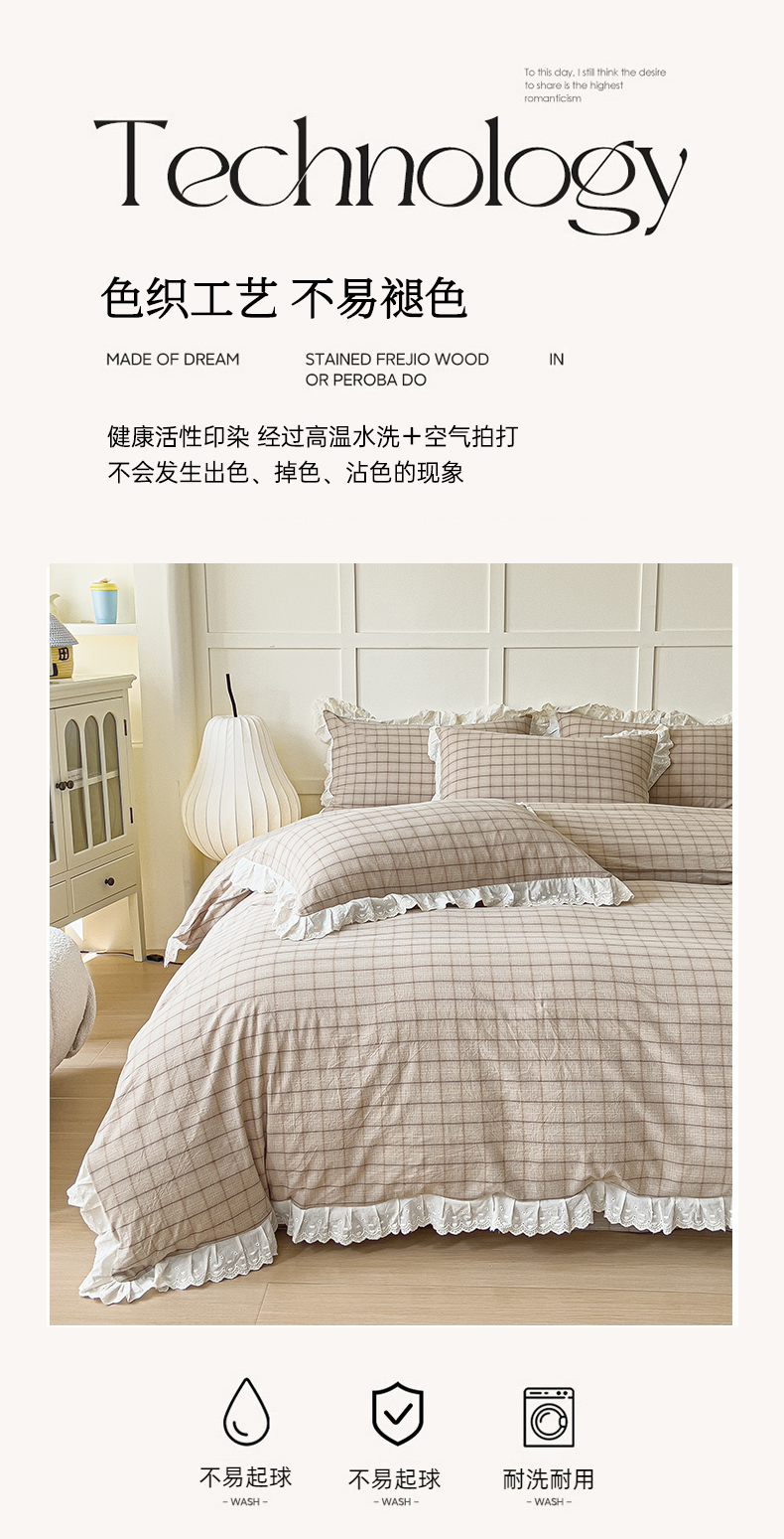 (总)花香四季家纺 2026全棉色织水洗棉法式公主风花边床单款床笠款四件套,初见咖,高智黑,米兰红,南初咖,云漫黑
