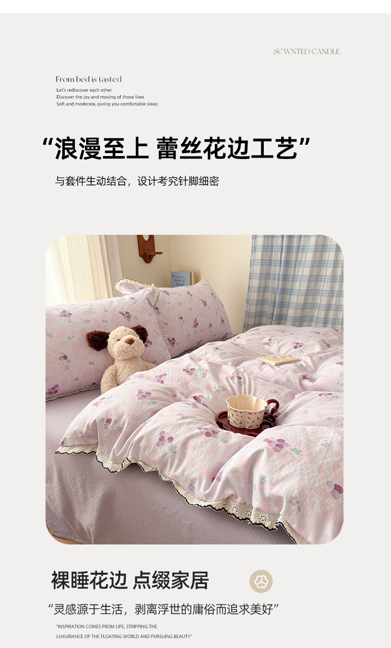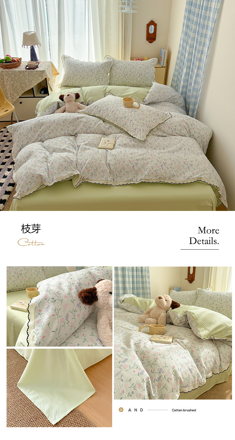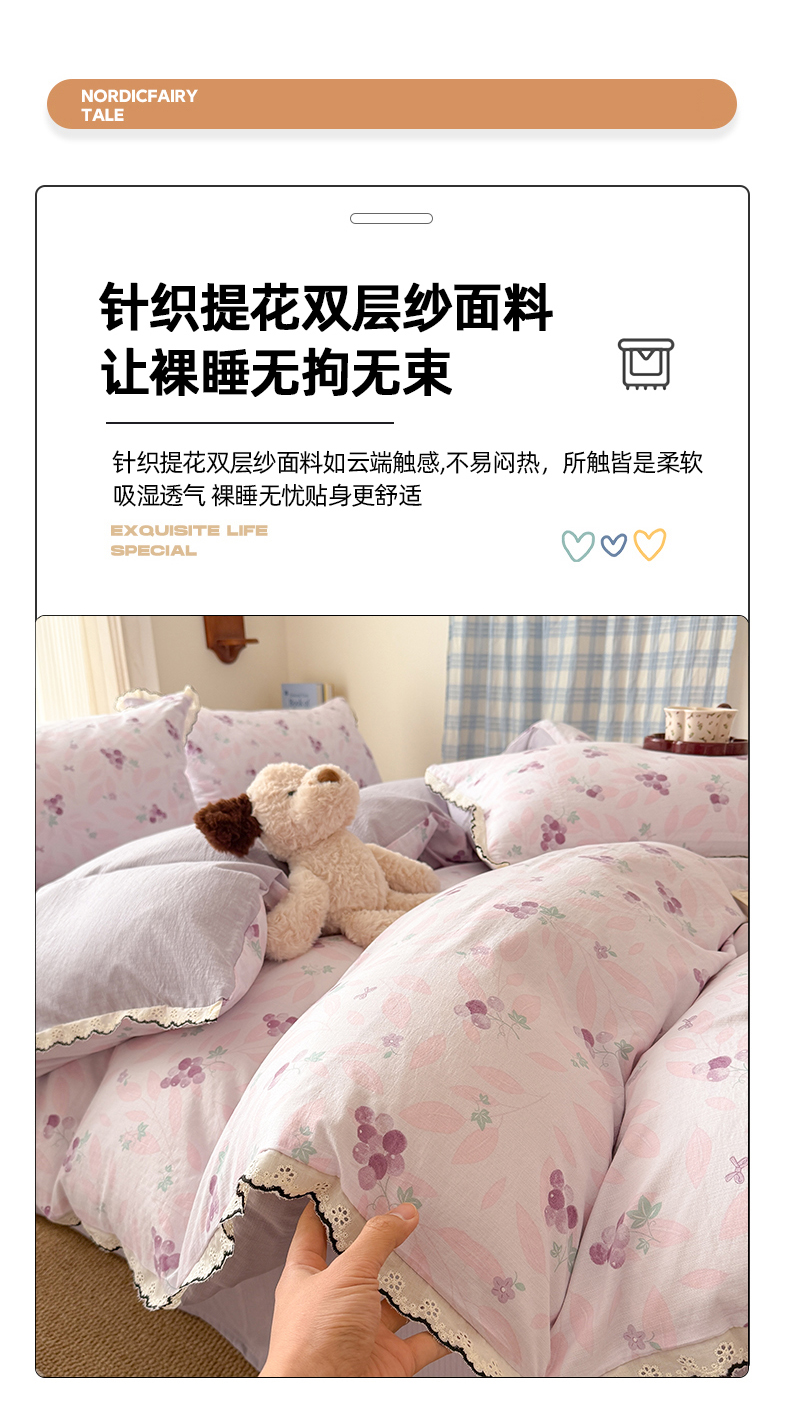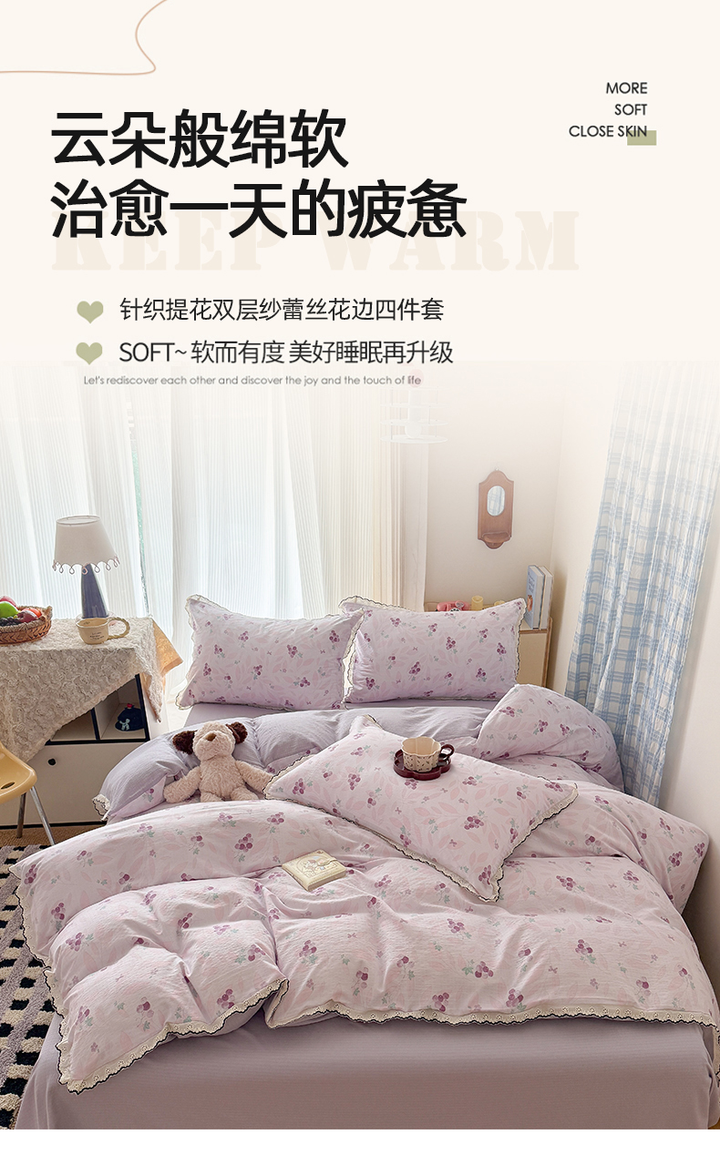 (总)温眠家纺 2026新款针织提花双层纱全棉蕾丝花边四件套,繁花,花田紫,蓝萱,墨蓝,奶油芝士,苹果星人,秋之恋,软萌可可,藤蔓,甜心猫咪,甜心木马,乌梅子酱,夏之物语,薰衣草,阳光花絮,枝芽