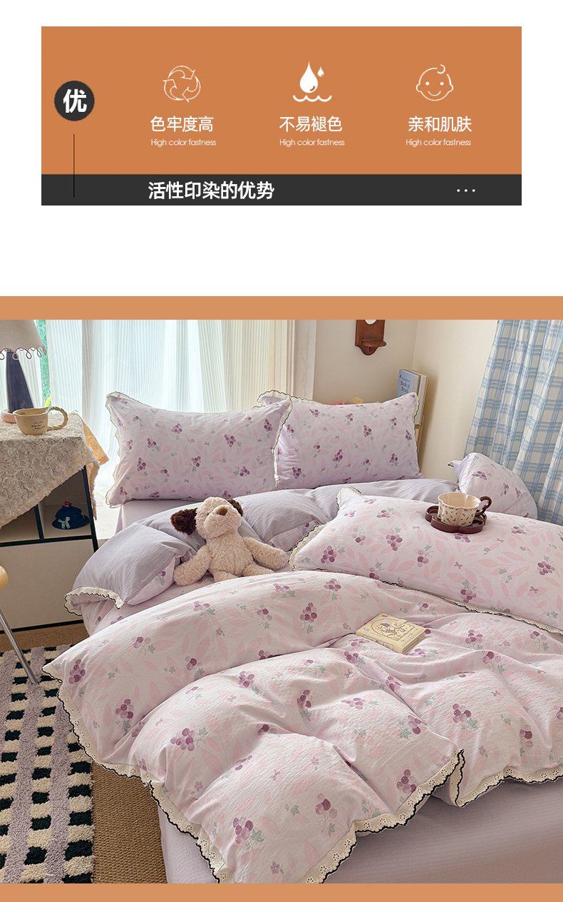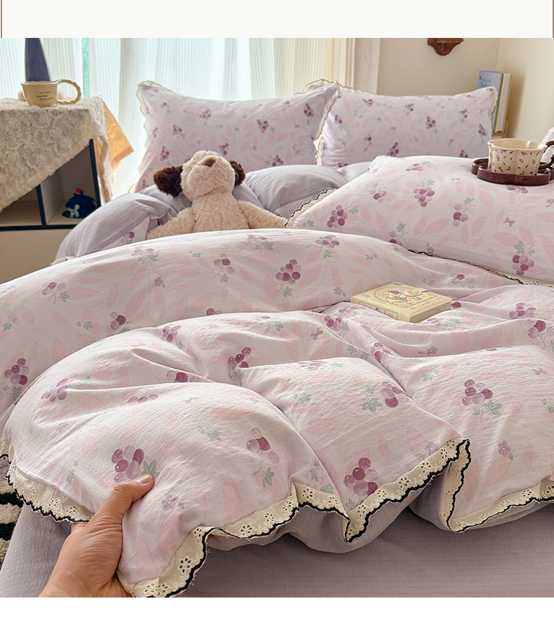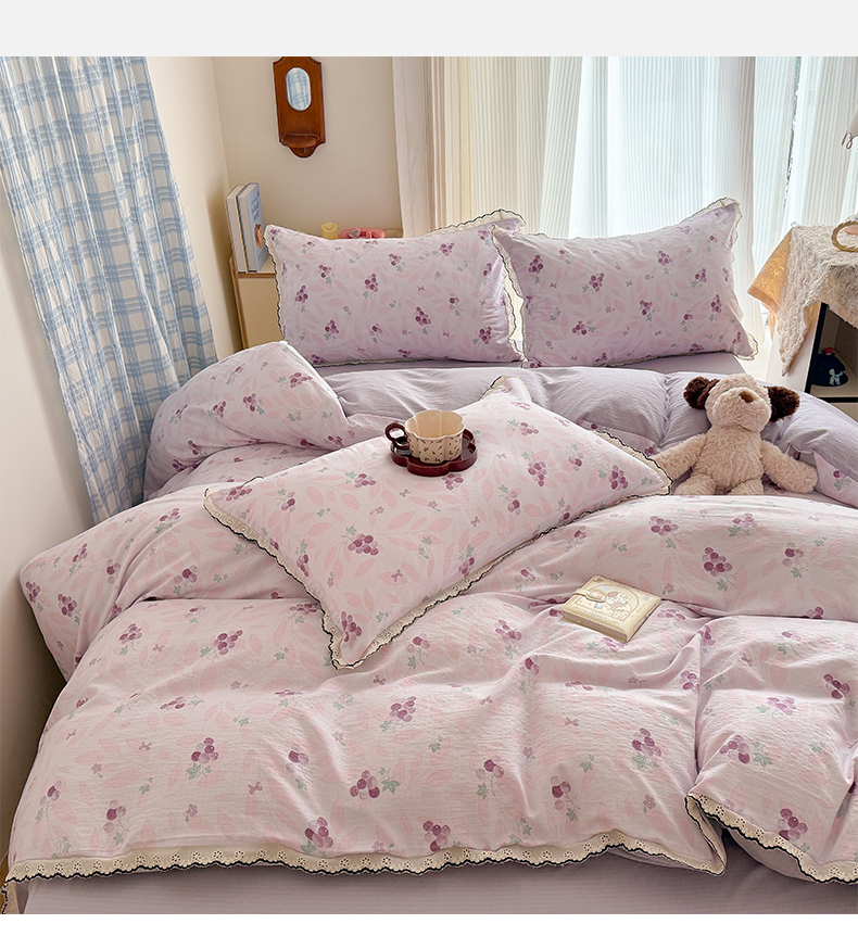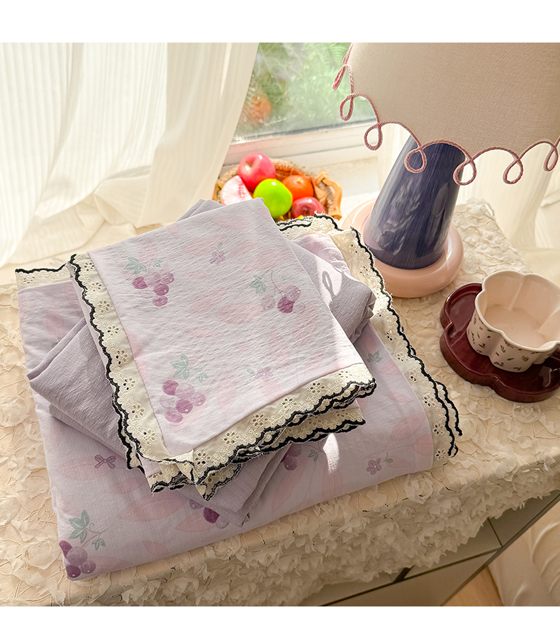 商品名称:温眠家纺 2026新款针织提花双层纱全棉蕾丝花边四件套 乌梅子酱