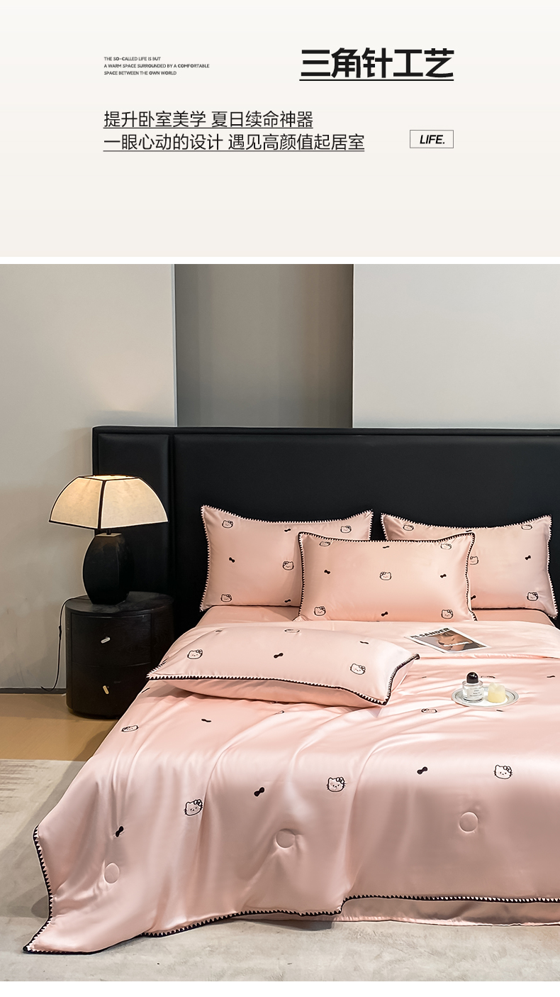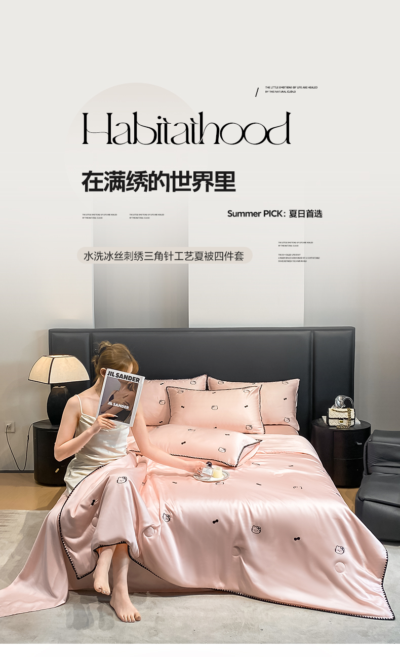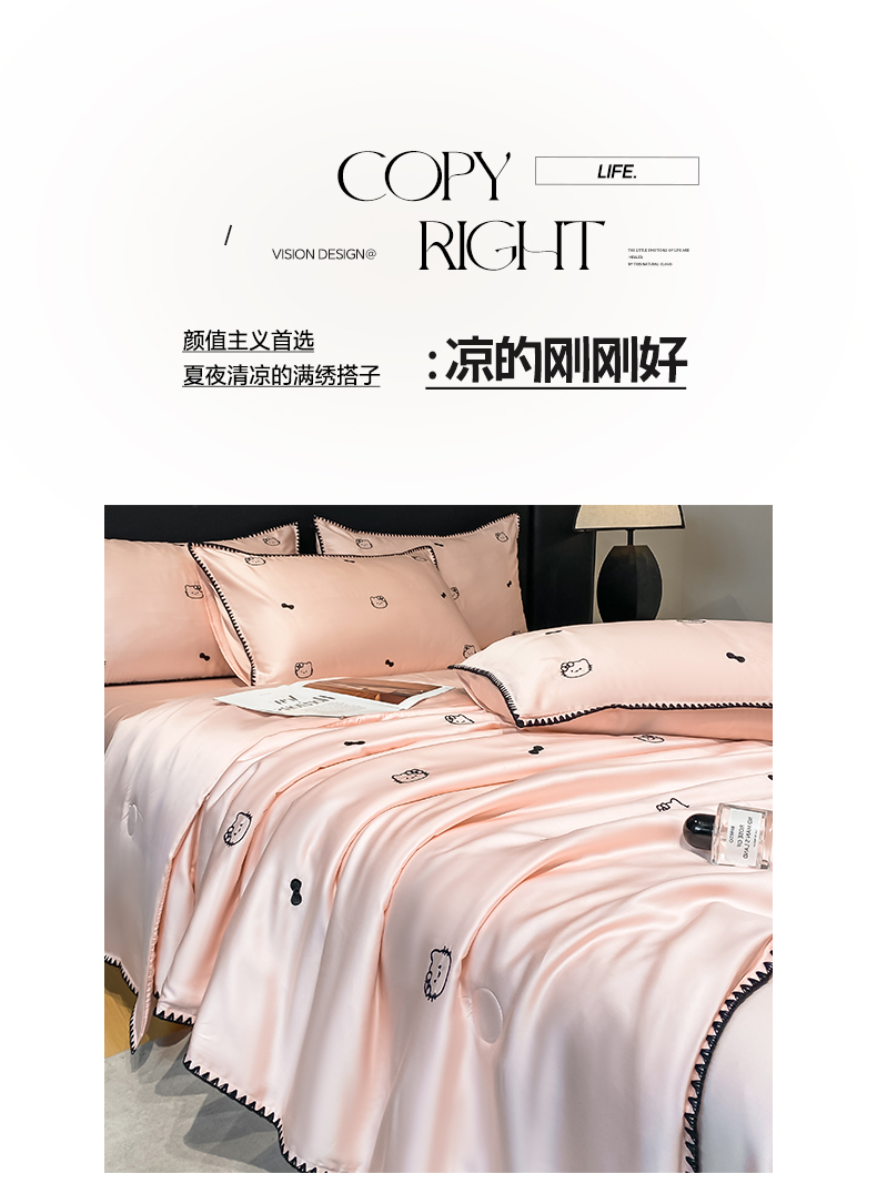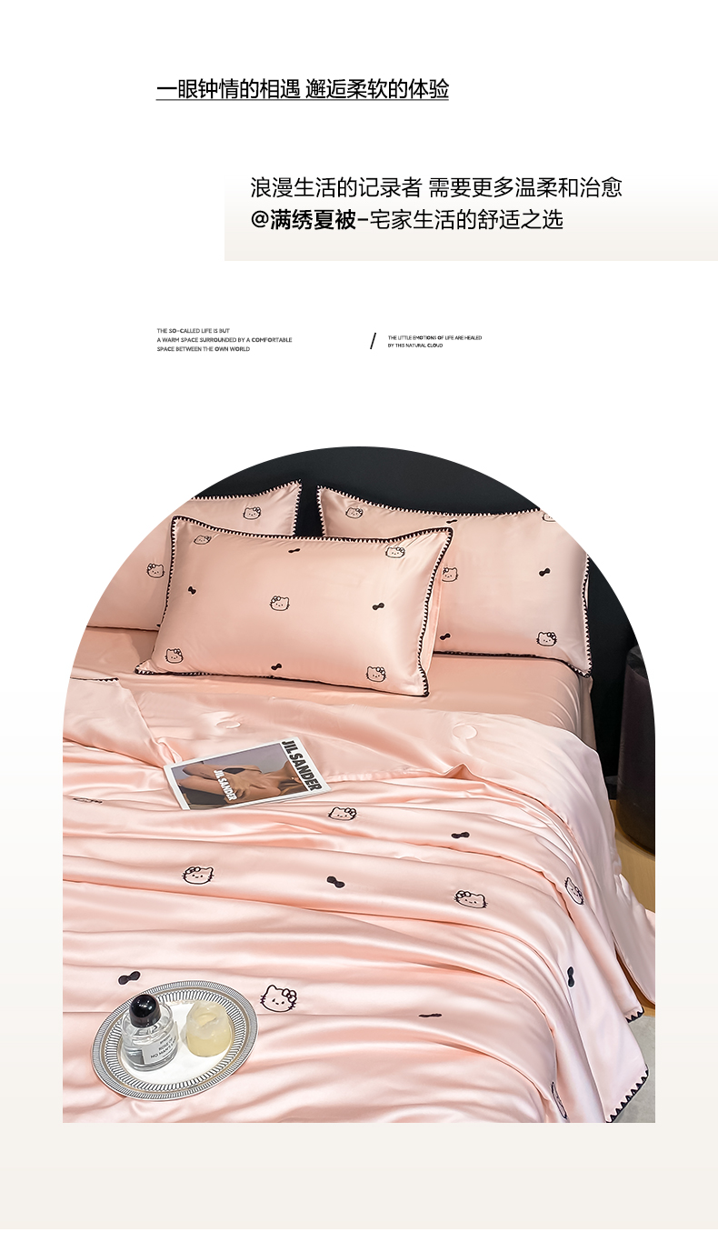 • 91家纺网 家纺一手货源 找家纺 如一 2026新款水洗冰丝刺绣三角针工艺夏被四件套 可美猫-粉黑