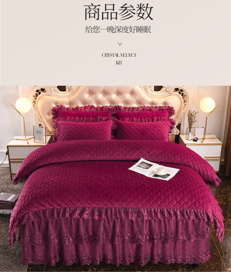 商品名称:恒爱家纺2021新款水晶绒夹棉蕾丝四件套 翩翩花舞-拉菲红