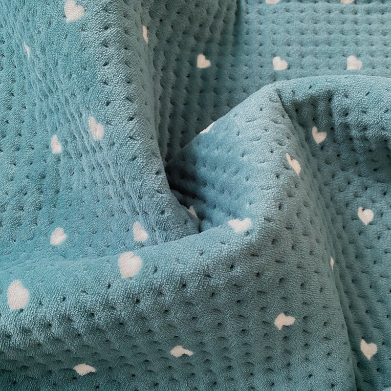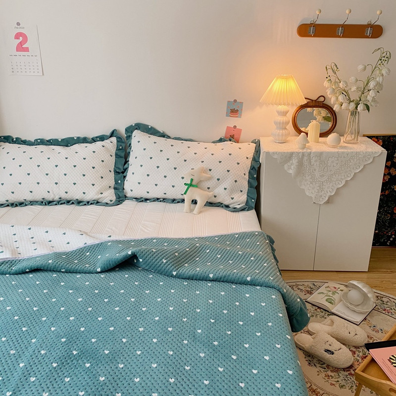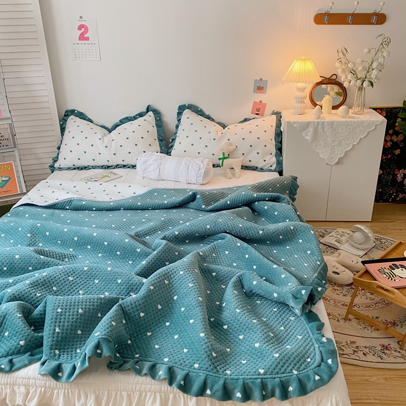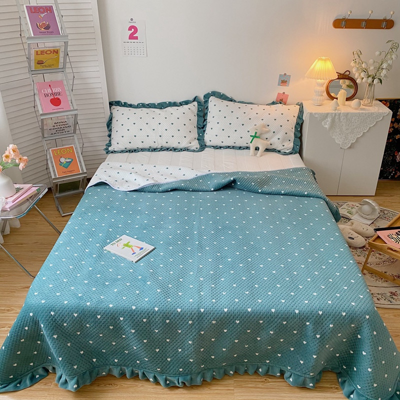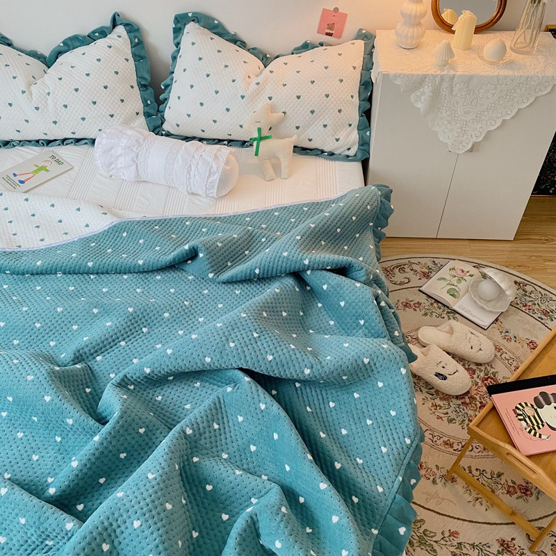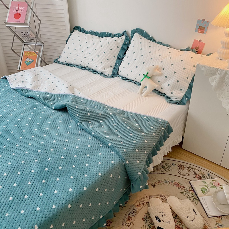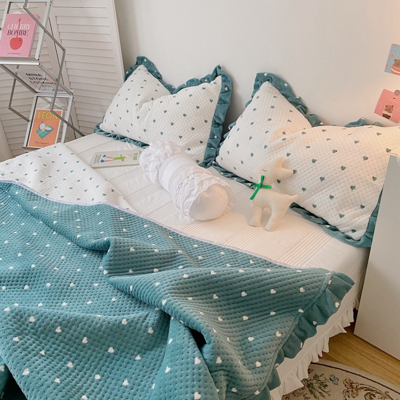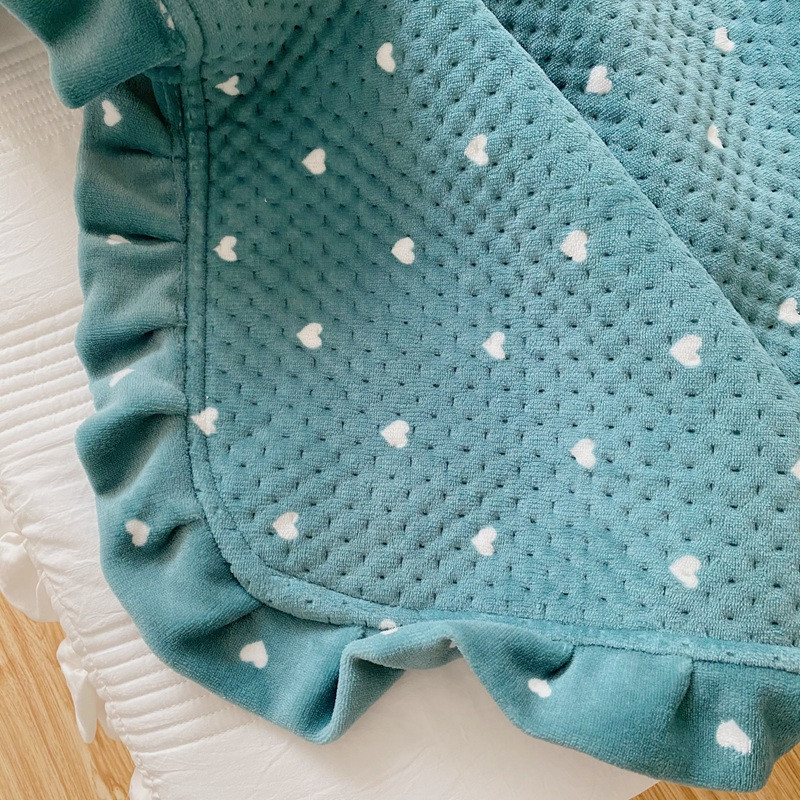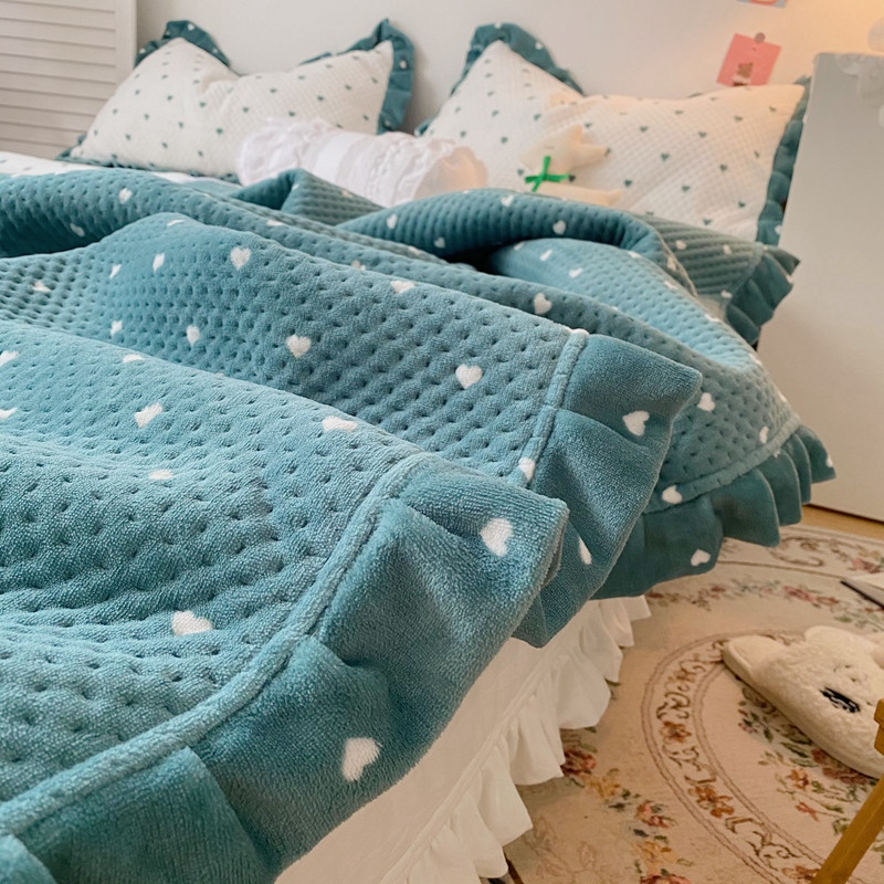 星期八 2020新款奶油色花边牛奶绒床盖 爱心绿
