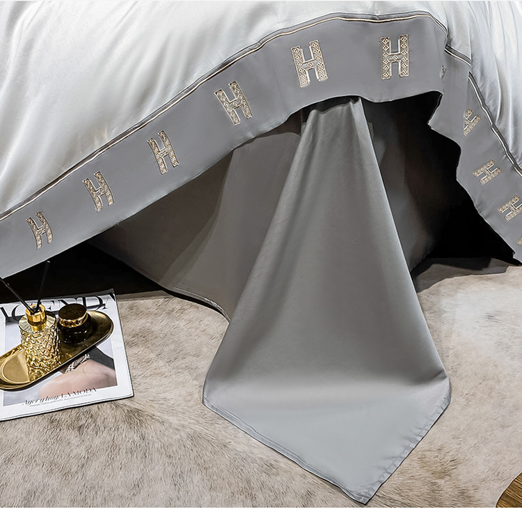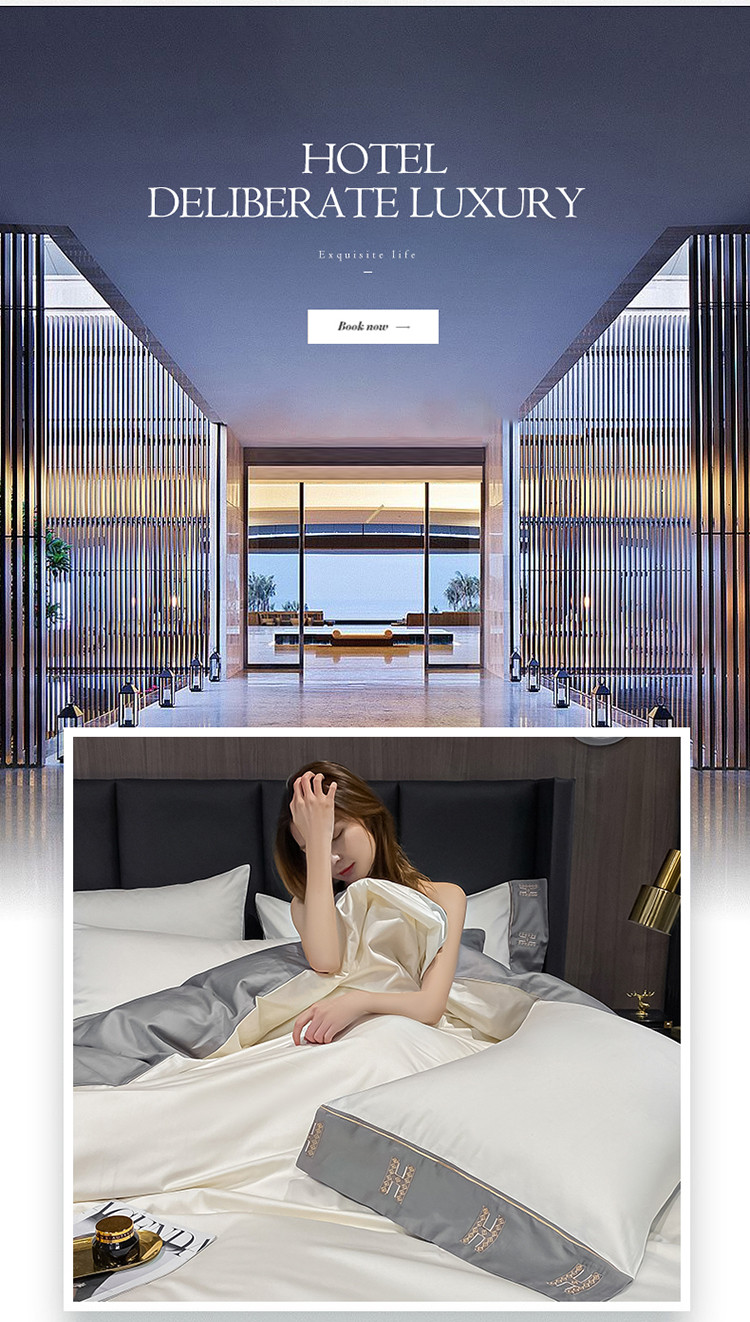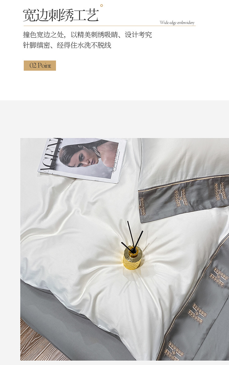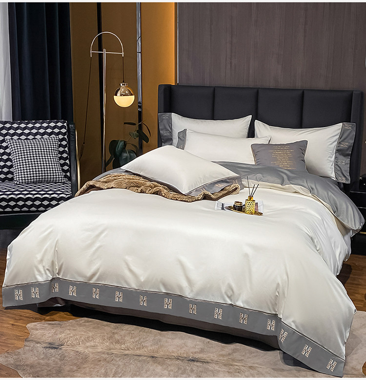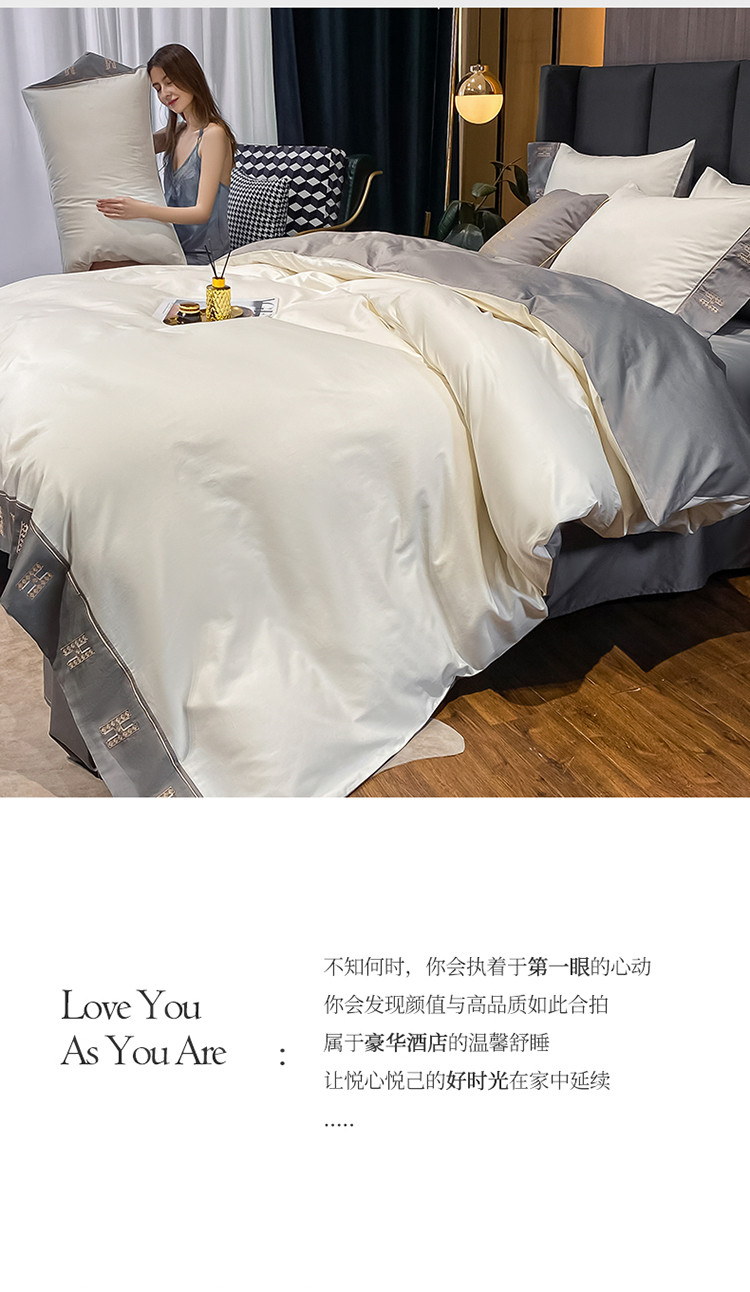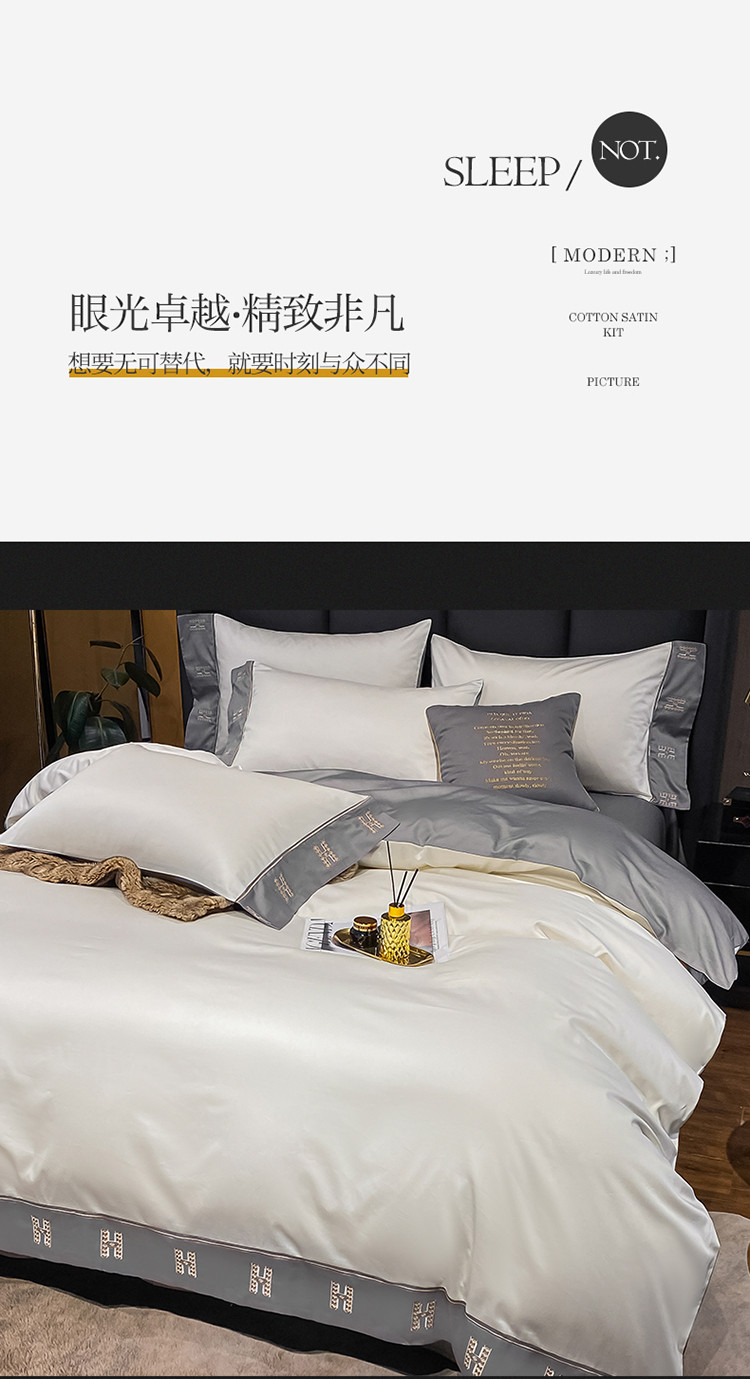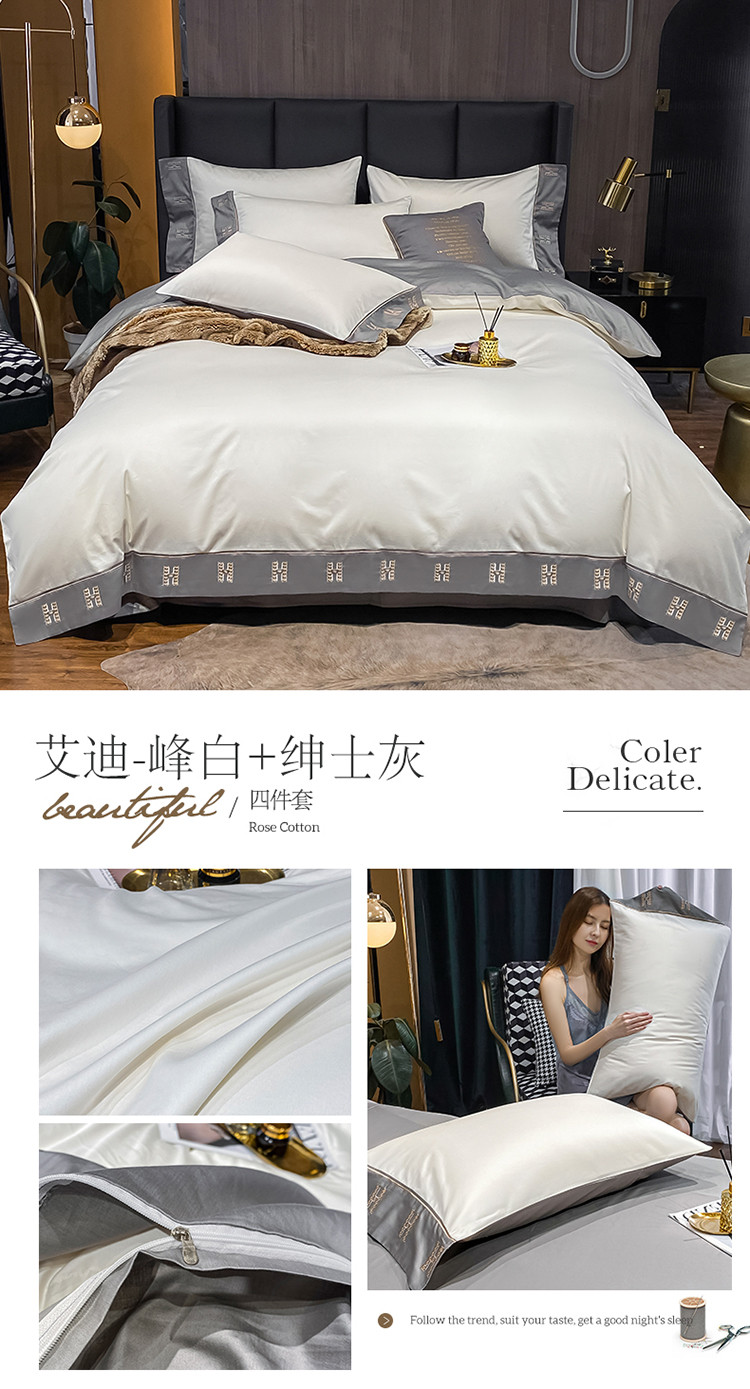 蓝米卡夫新款高档酒店款全棉贡缎长绒棉刺绣四件套艾迪峰白绅士灰