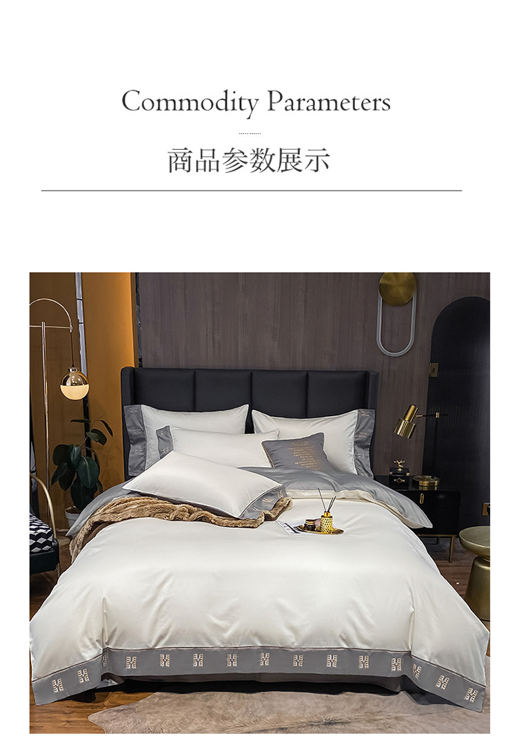 商品名称:蓝米卡夫新款高档酒店款全棉贡缎长绒棉刺绣四件套艾迪峰白绅士灰
