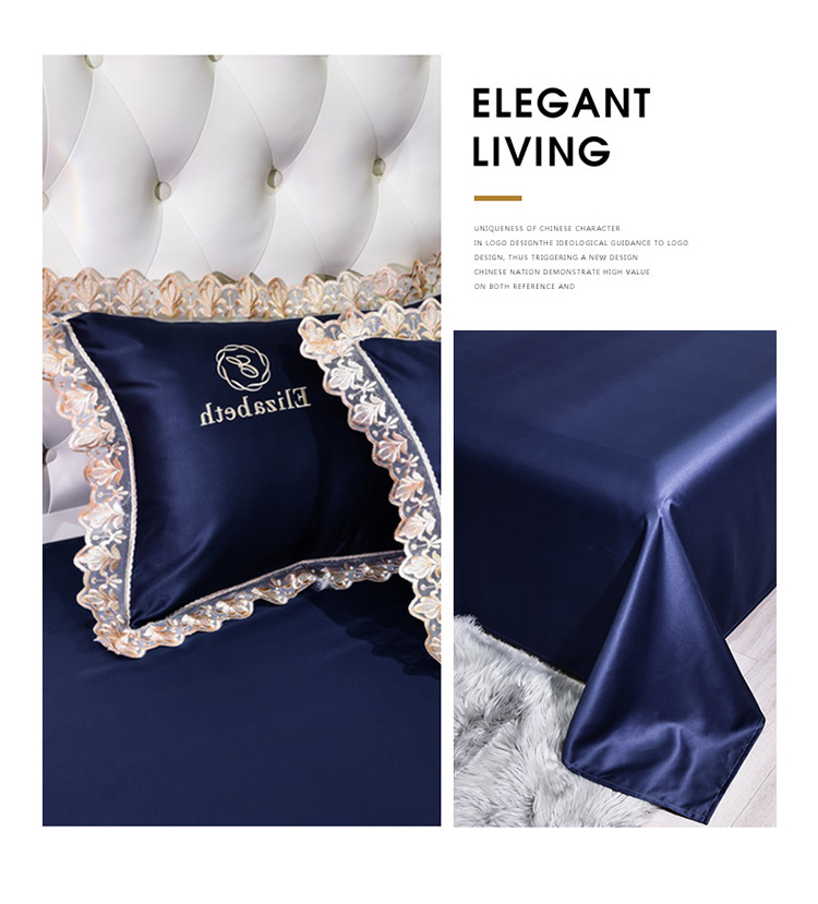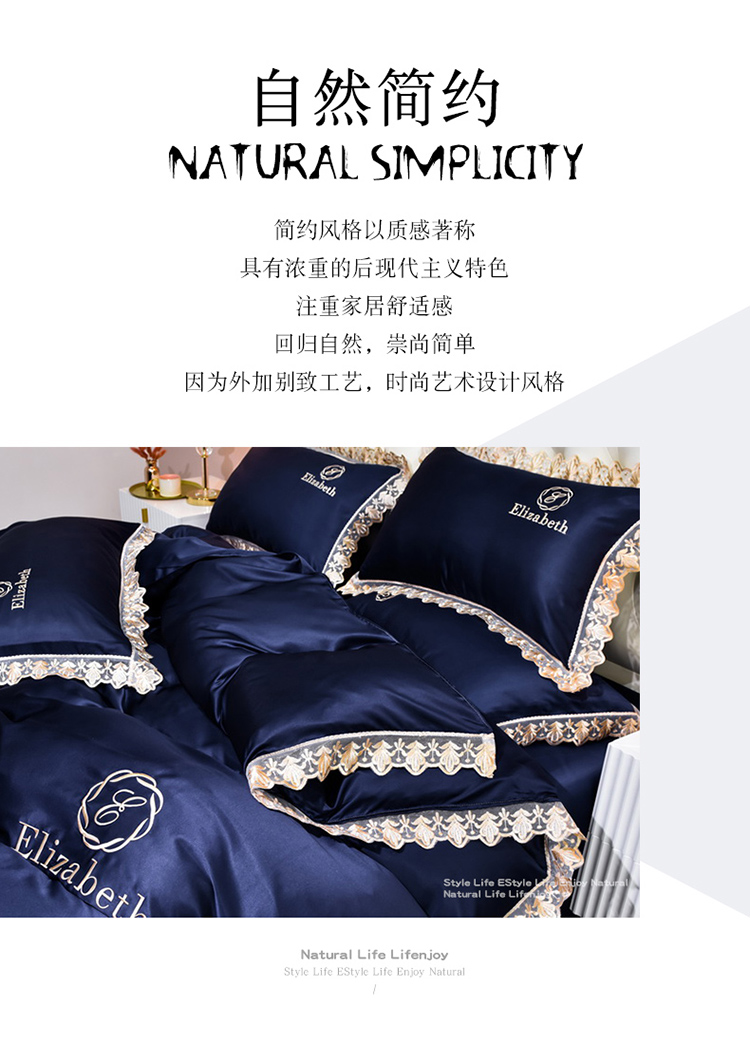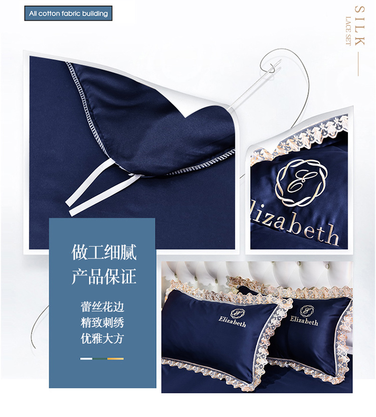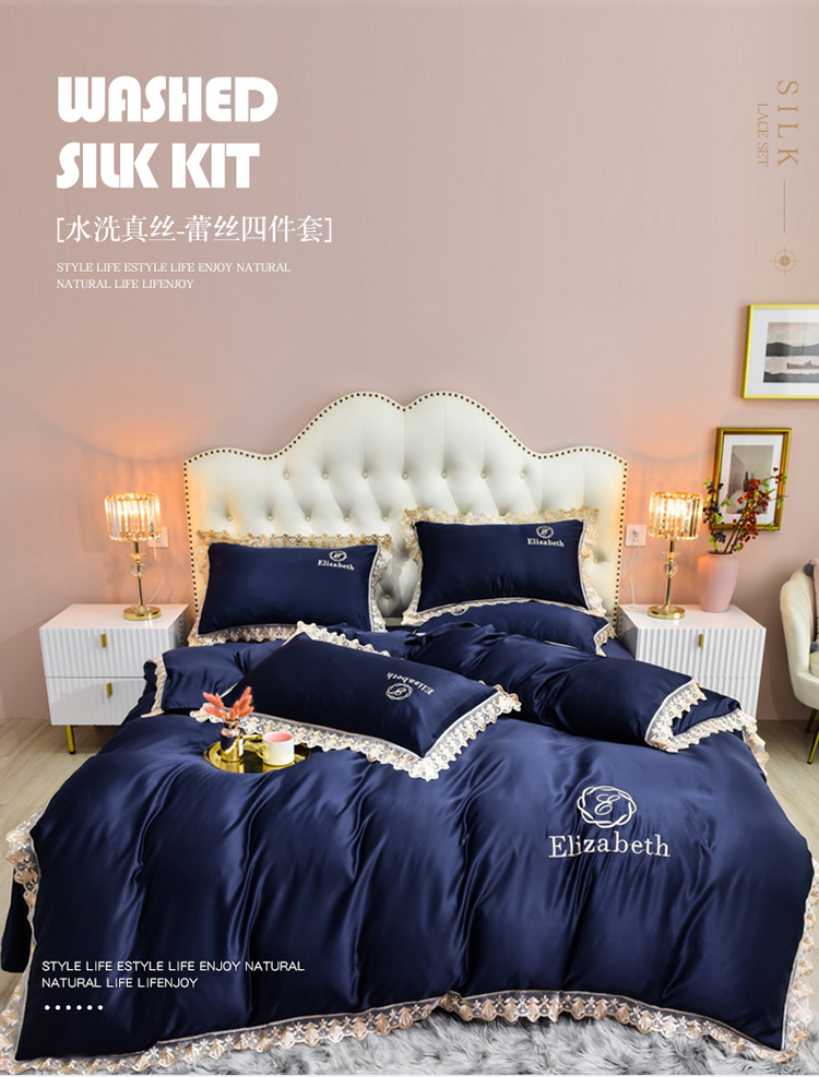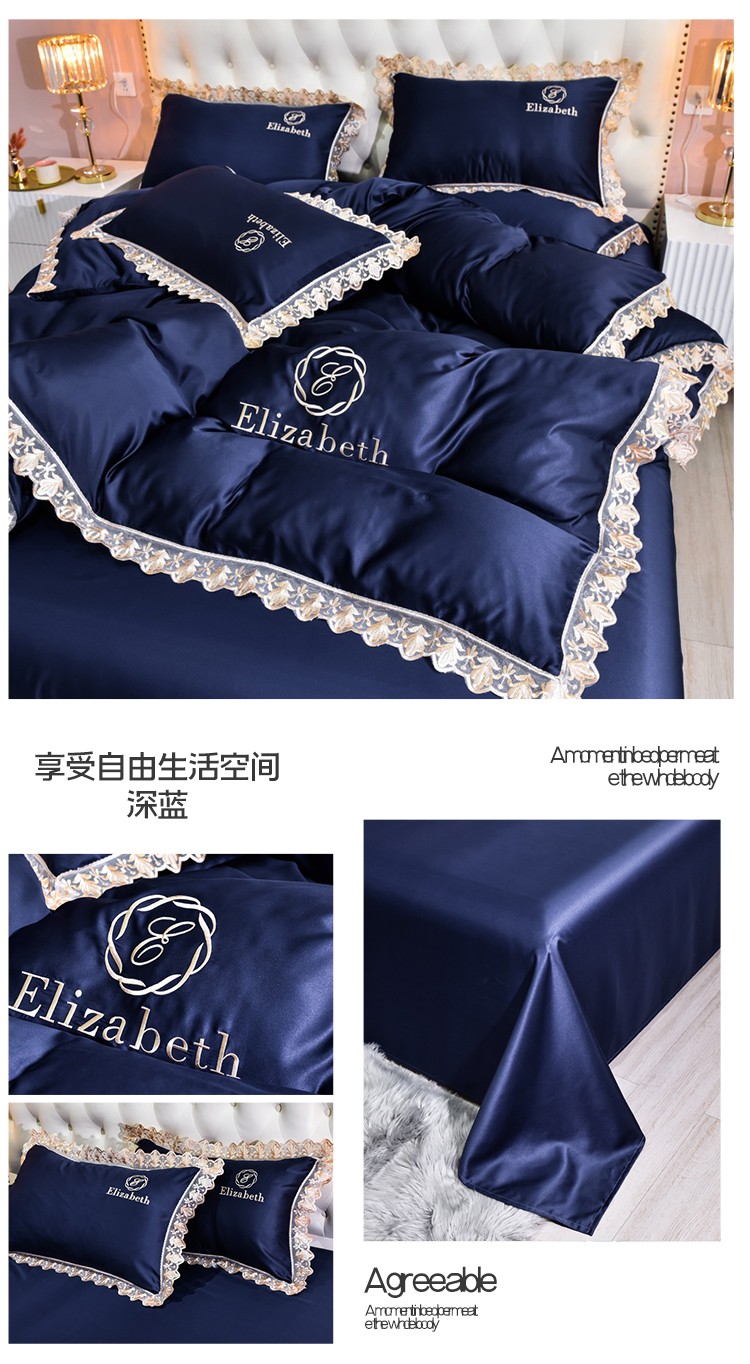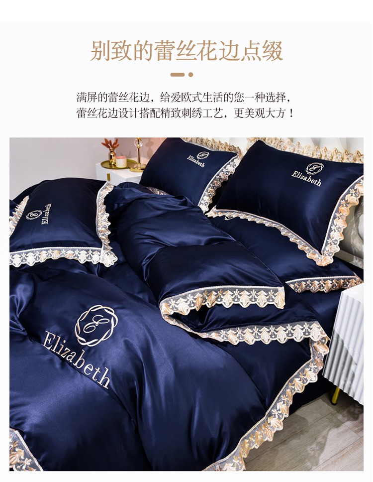 米奈家居 2021新款水洗真丝蕾丝花边爱琳四件套 深蓝