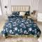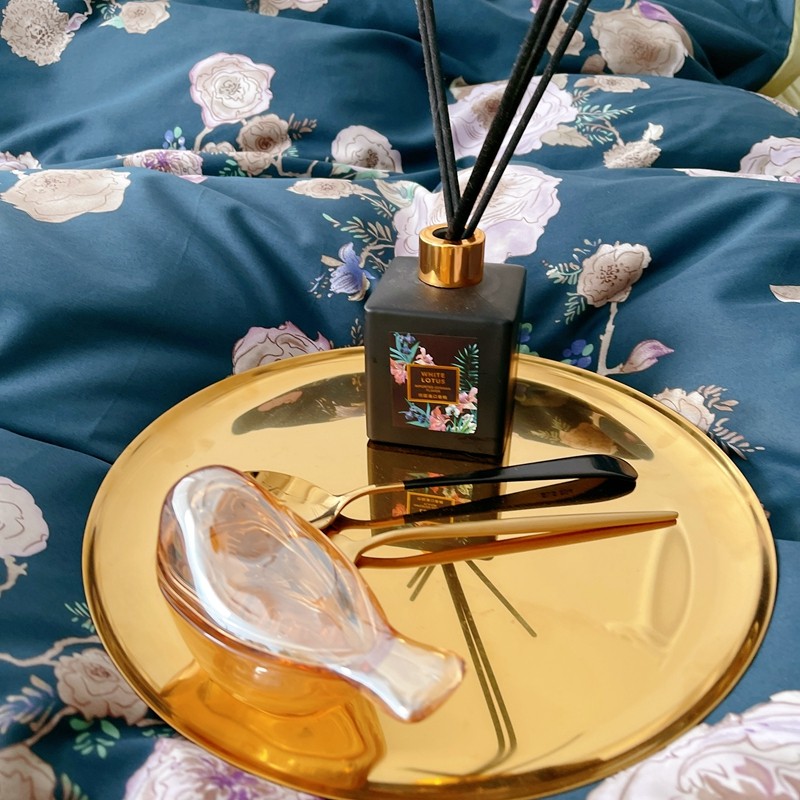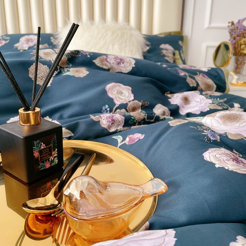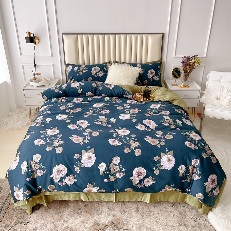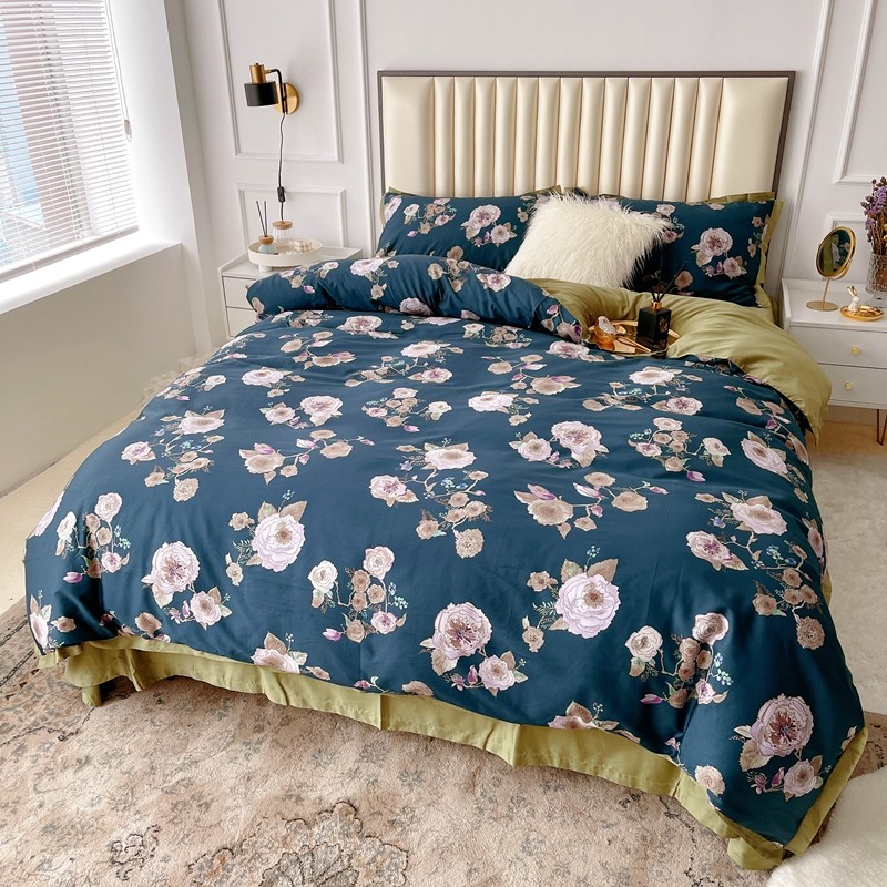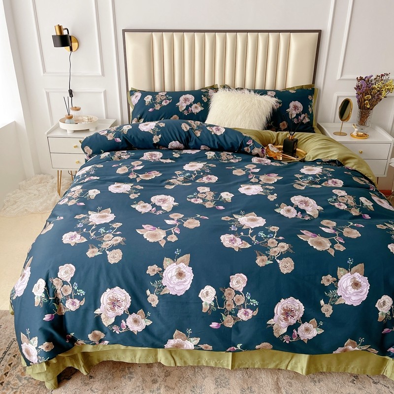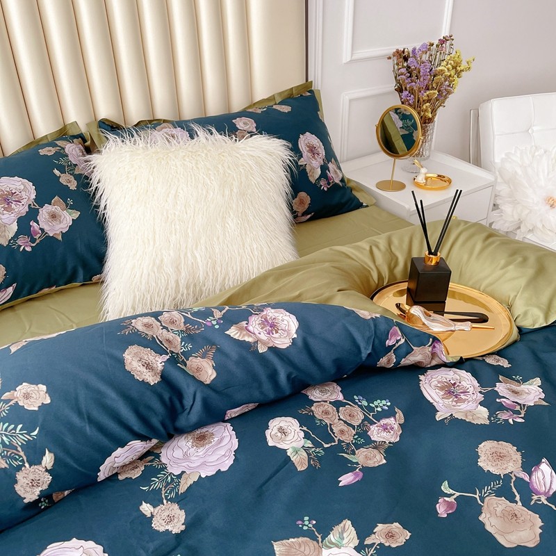 蘭菲 新款60支贡缎长绒棉印花美式花卉四件套水韵江南深蓝