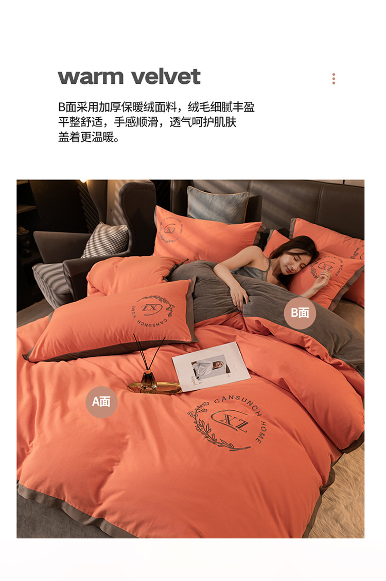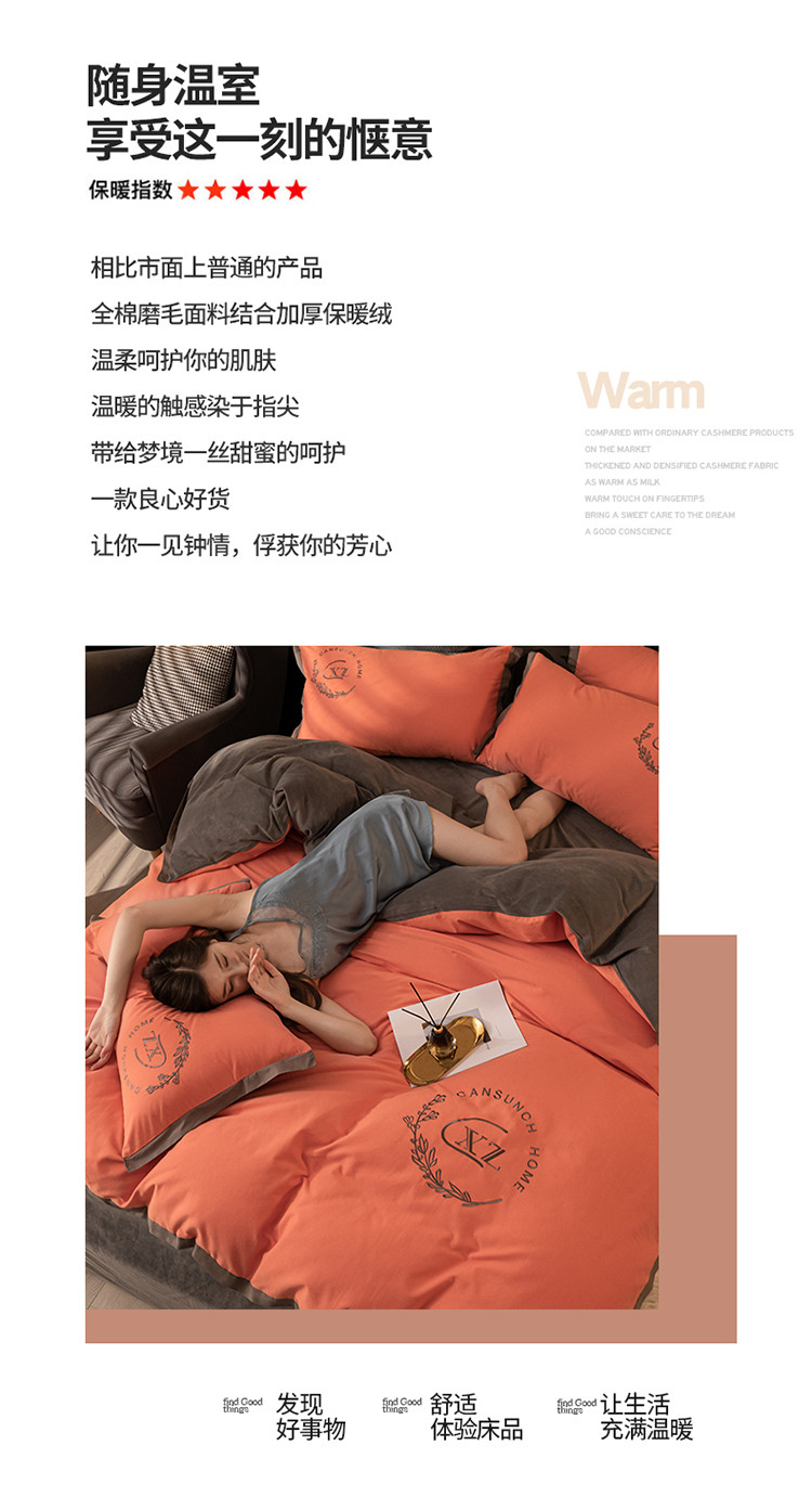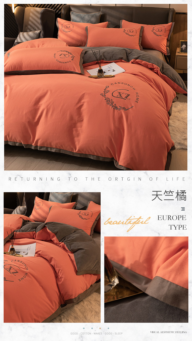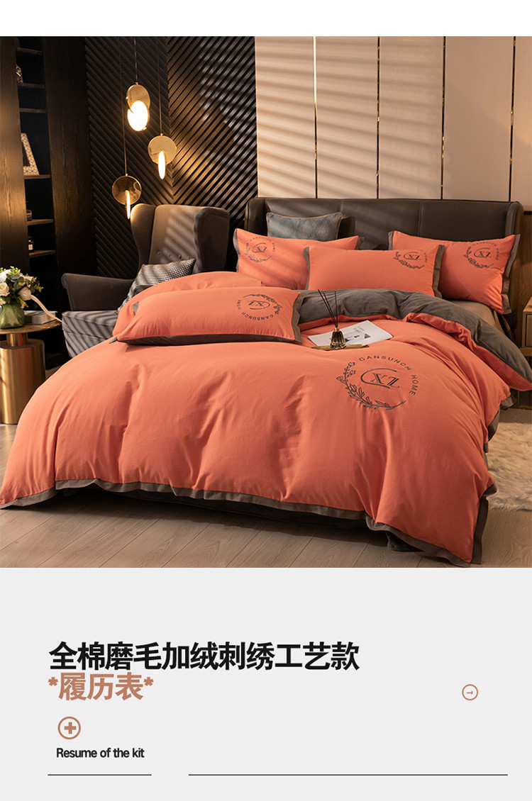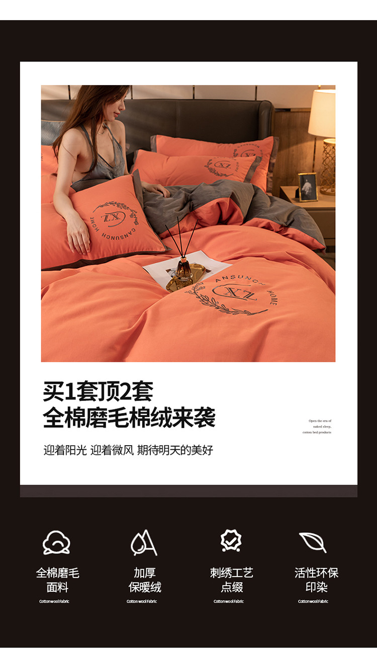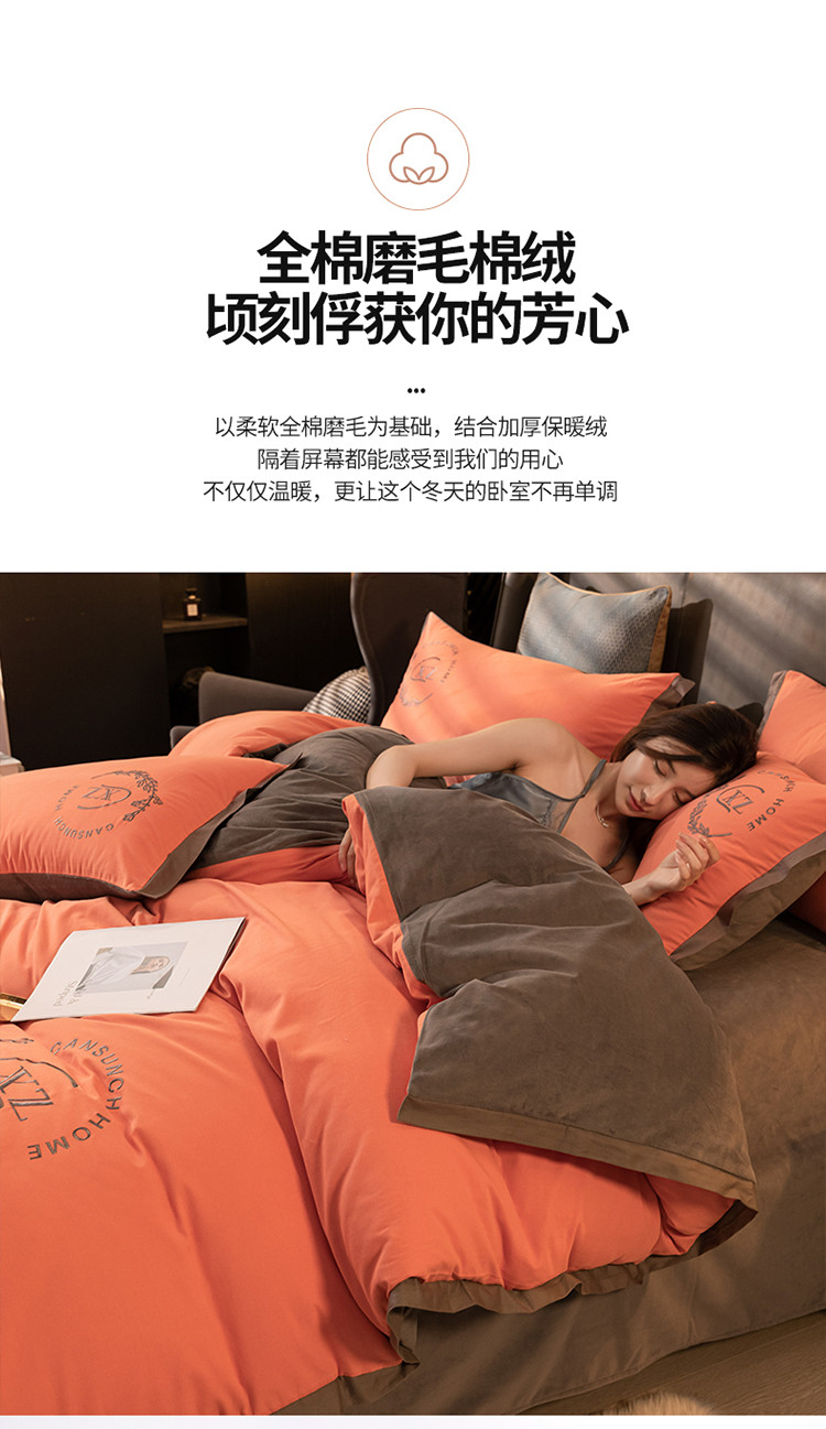 商品名称:蓝米卡夫 2024冬季升级款保暖全棉磨毛牛奶绒刺绣四件套 天竺橘