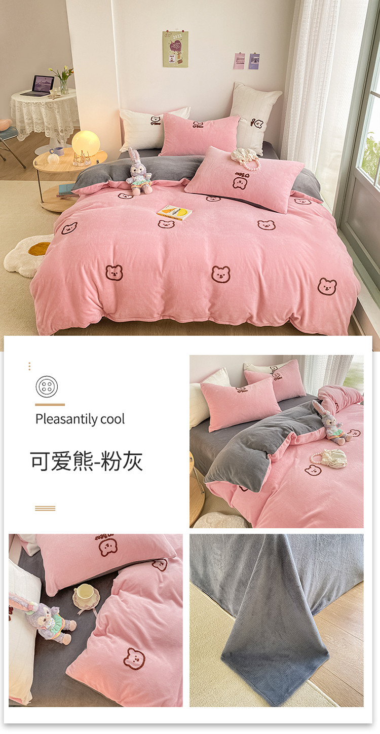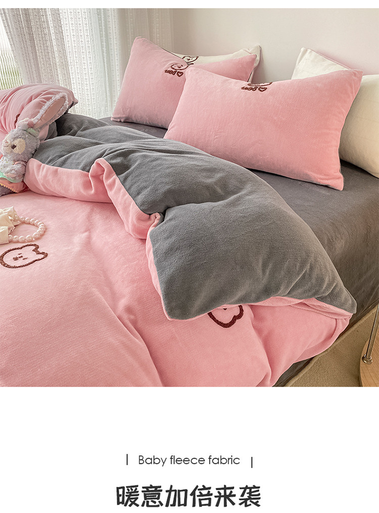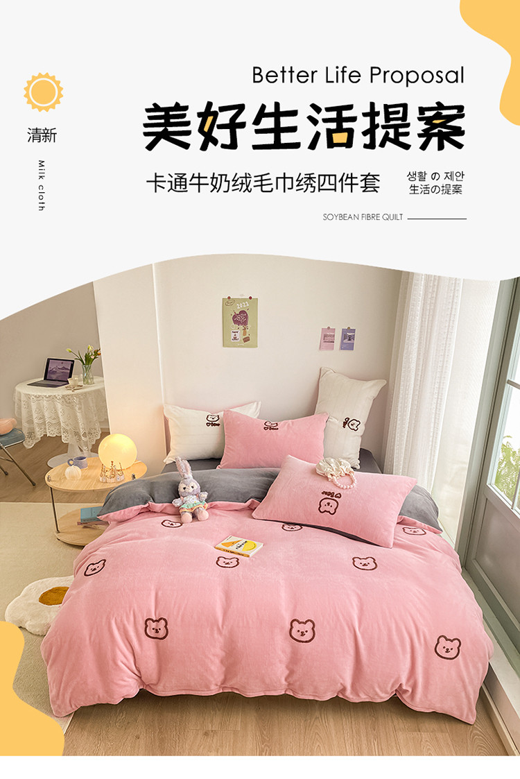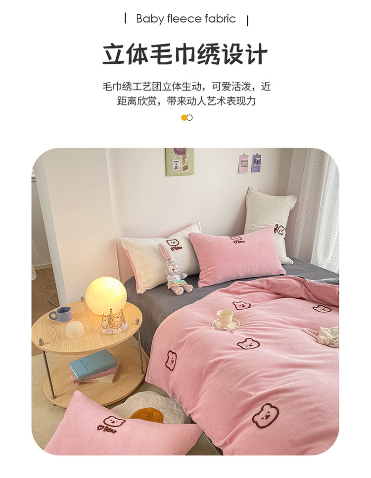 商品名称:雅居纺 2022新款牛奶绒毛巾绣四件套拍摄风格2 可爱熊-粉灰
