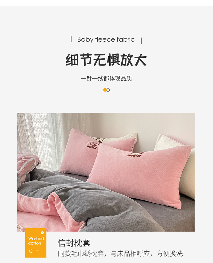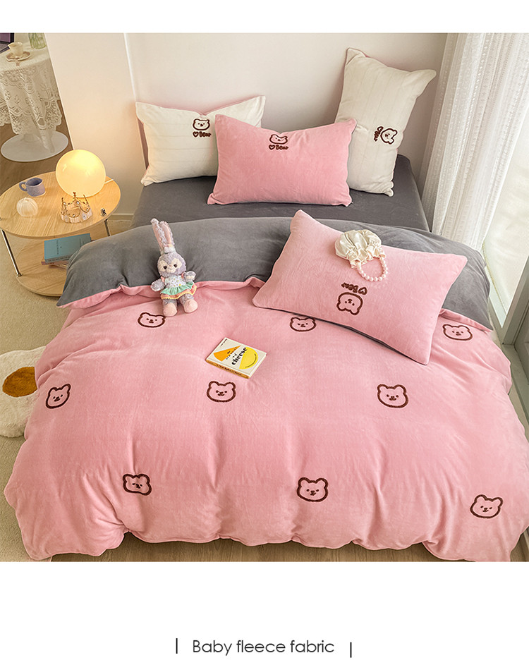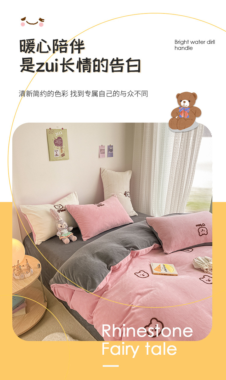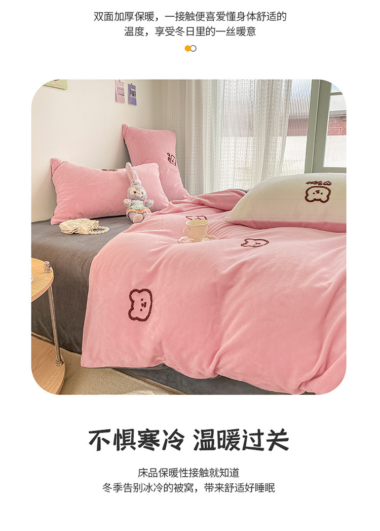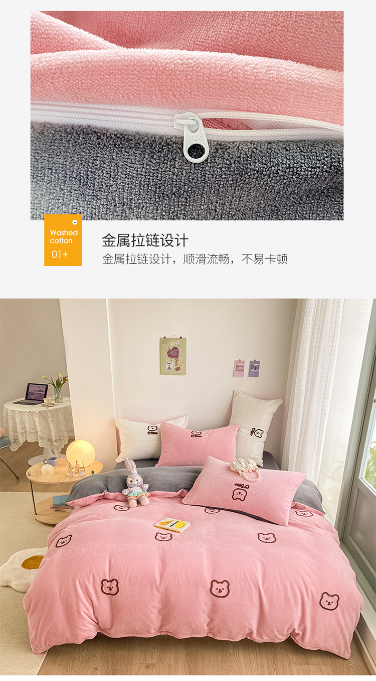 商品名称:雅居纺 2022新款牛奶绒毛巾绣四件套拍摄风格2 可爱熊-粉灰