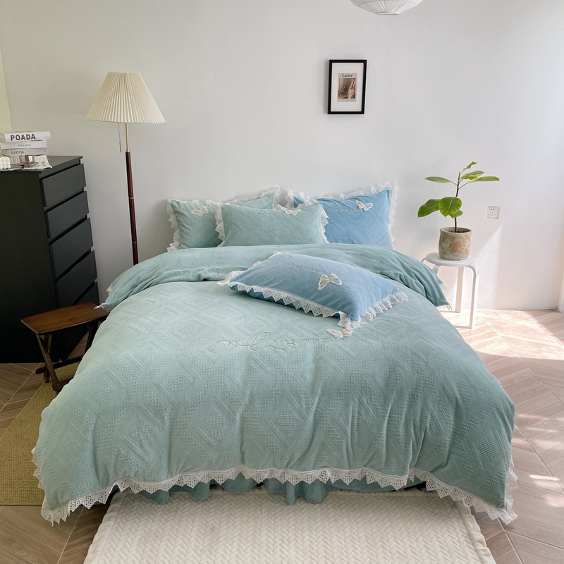 (总)北纬27度 2023新款高克重防静电牛奶绒四件套-人鱼小姐法式花边唯美系列金枝玉叶,金枝玉叶-天蓝,金枝玉叶-浅粉,金枝玉叶-牛油果绿,金枝玉叶-米色,金枝玉叶-紫色