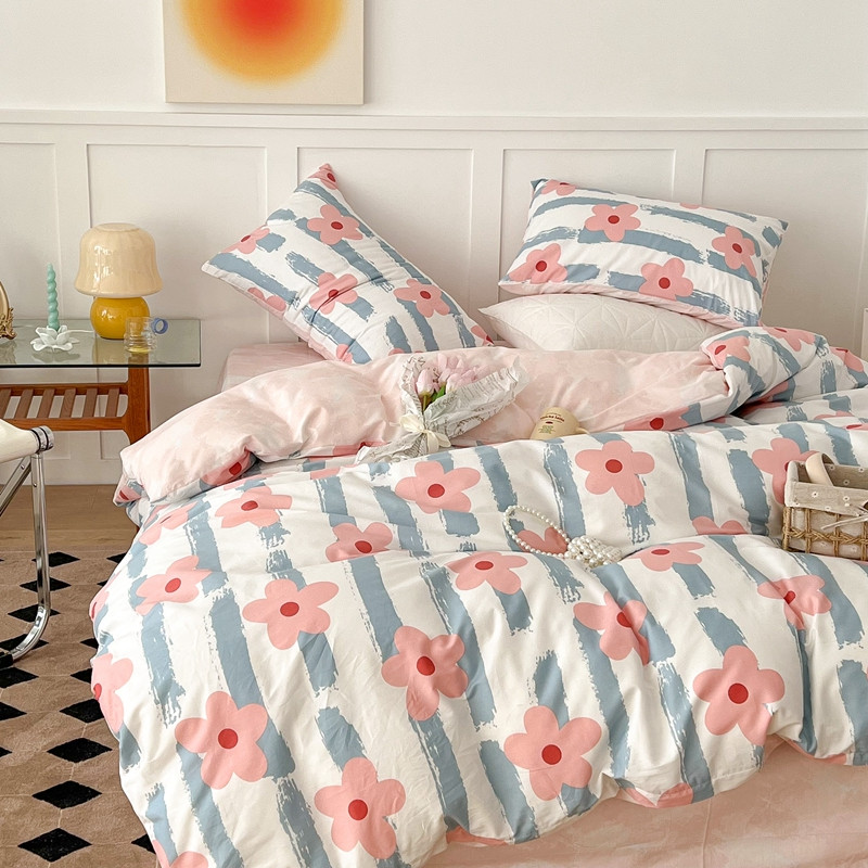 商品名称:昔可家纺 2022新款13372全棉普通款花花系列四件套 竖条粉花花