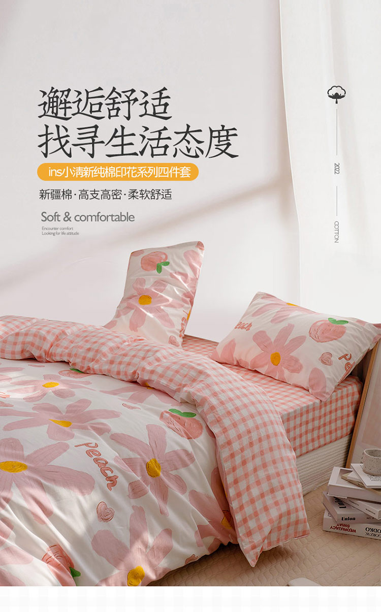沐棉家居 2022新款全棉13370印花四件套直播爆款 陌颜-粉