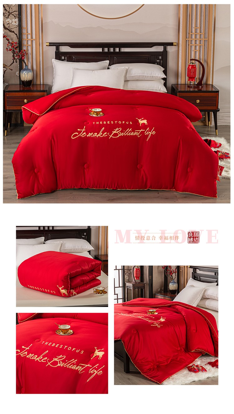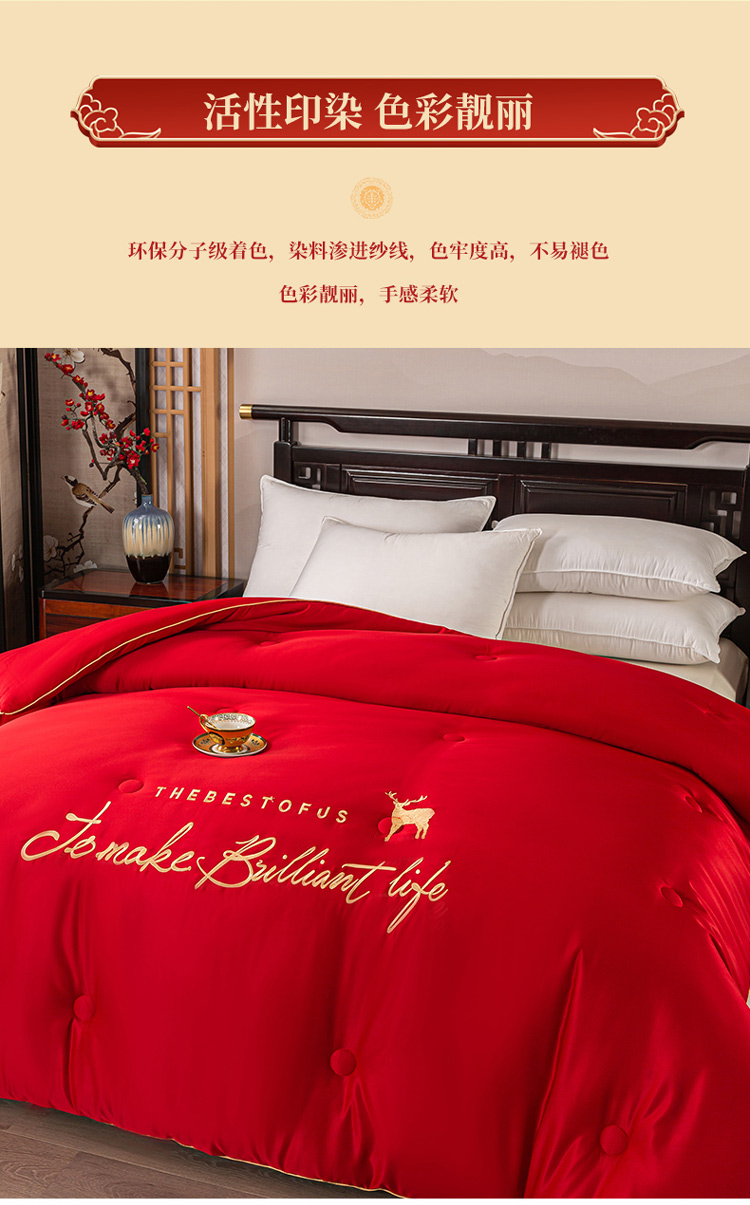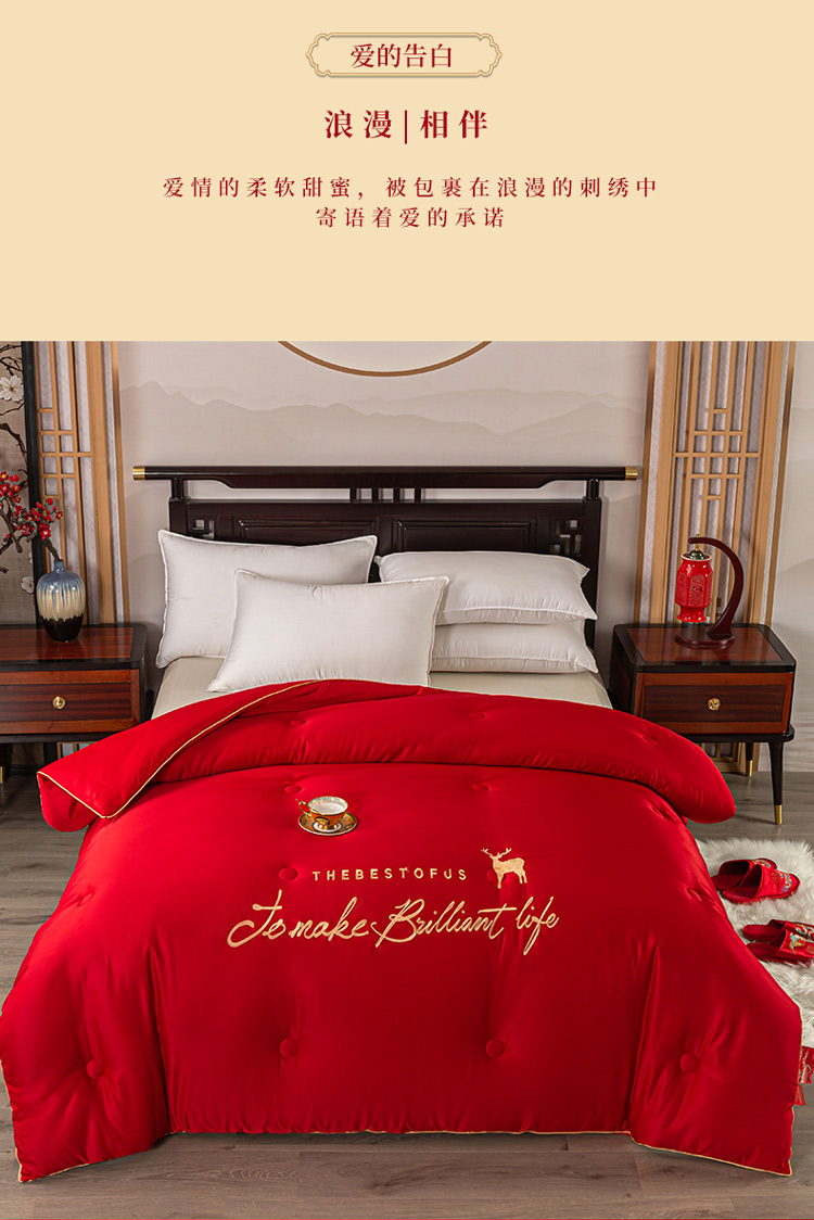 壹张床 新款婚庆斜纹水洗棉绣花冬被大豆春秋被喜庆被大红被子 一鹿相随