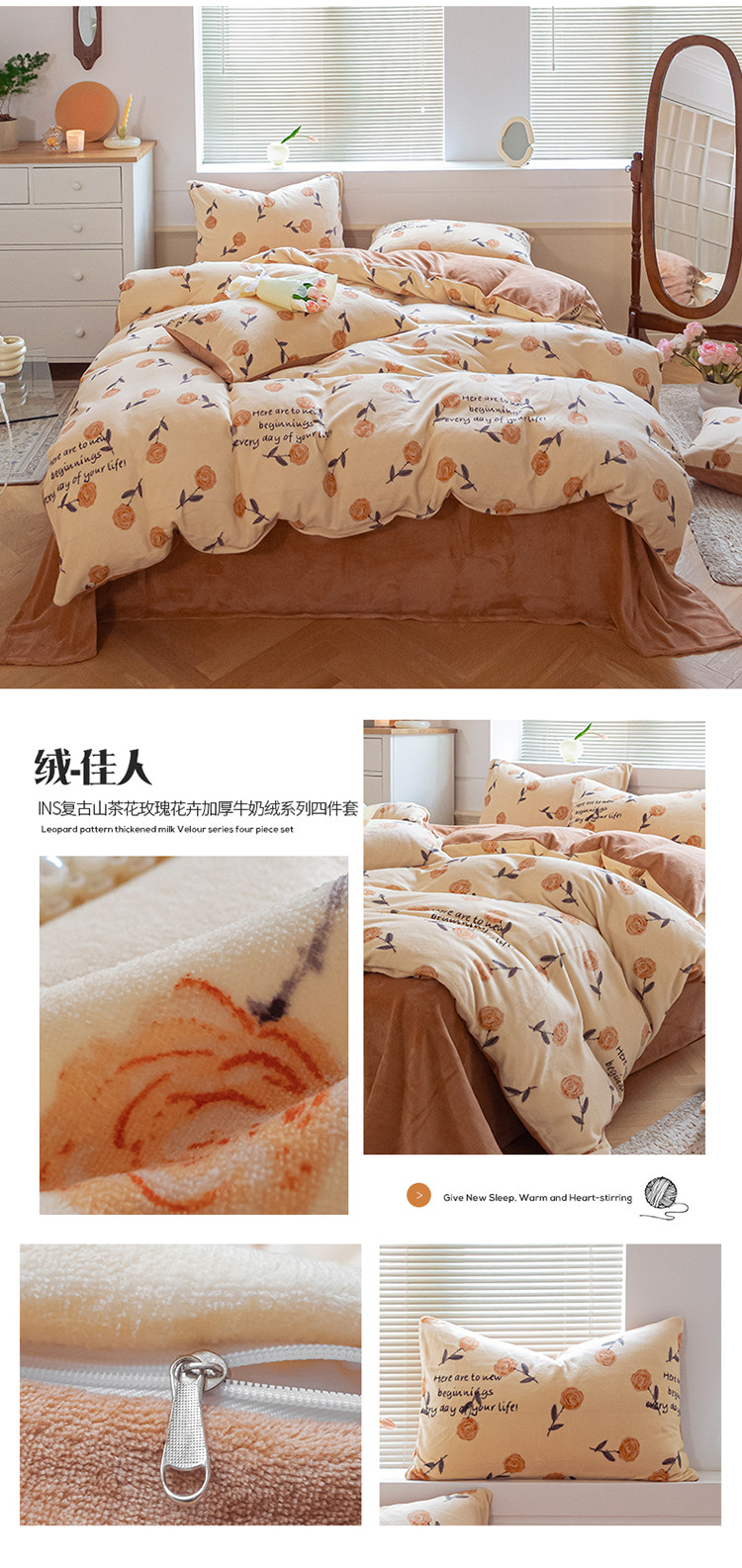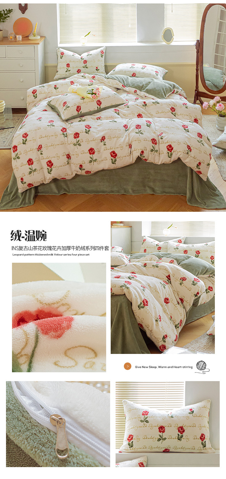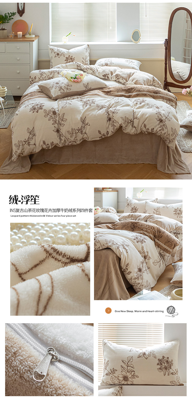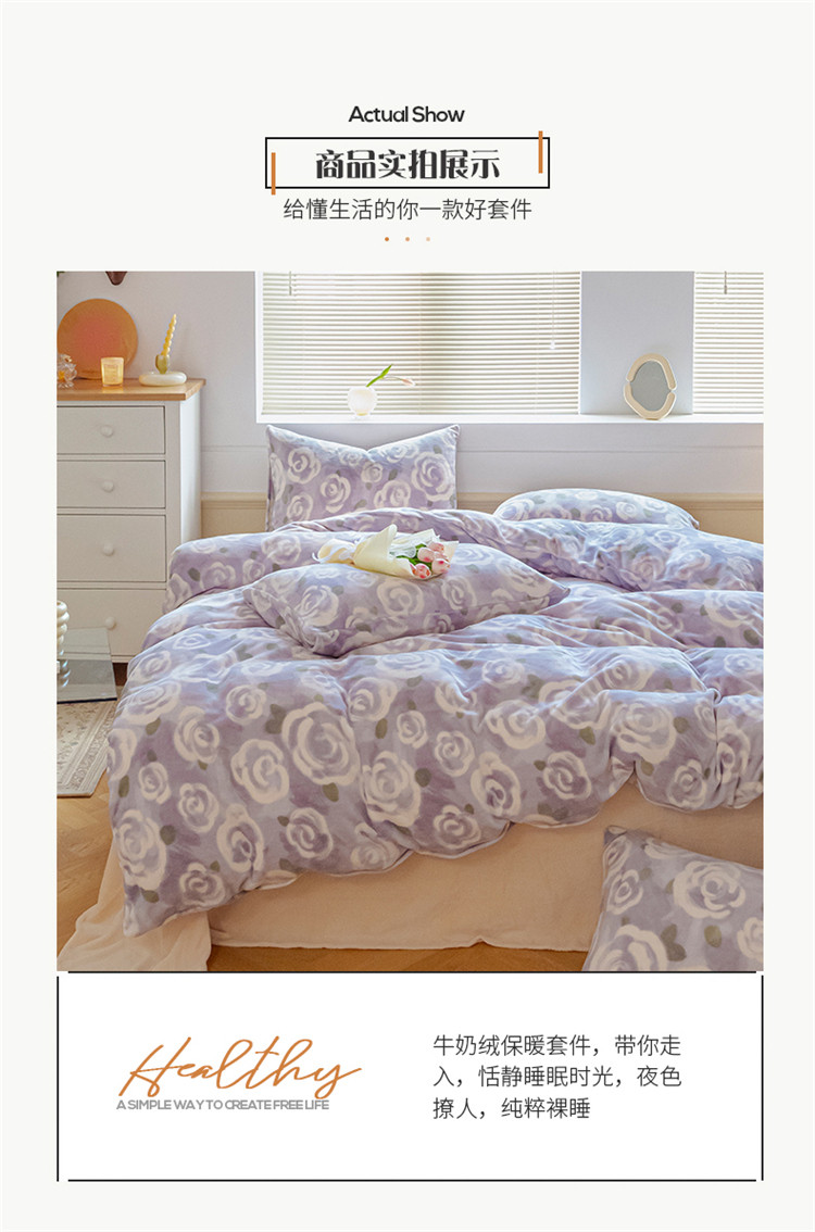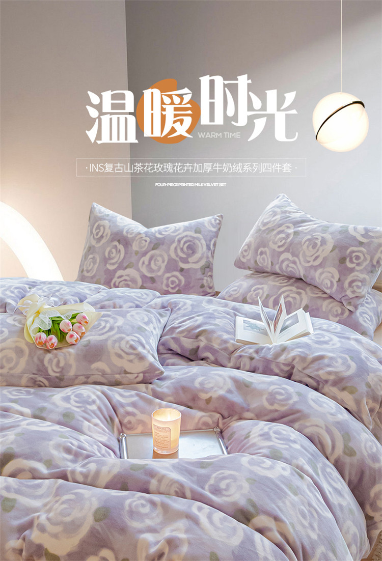 商品名称:(总)桃子ins复古山茶花玫瑰花卉加厚牛奶绒系列四件套