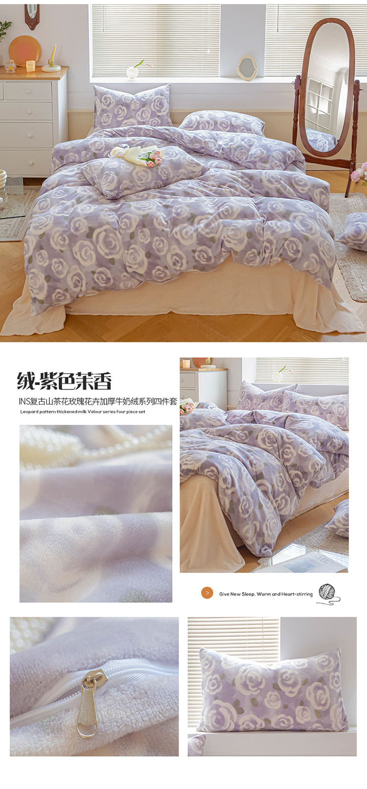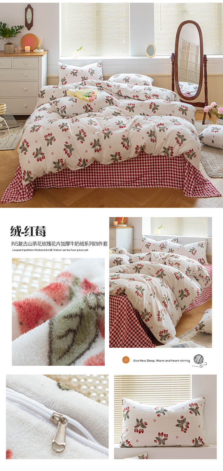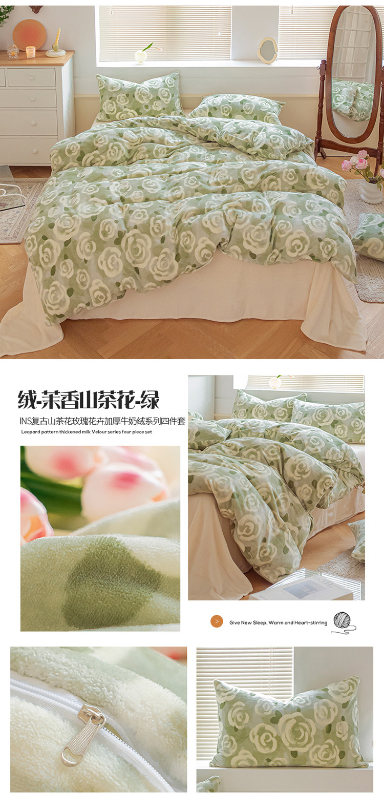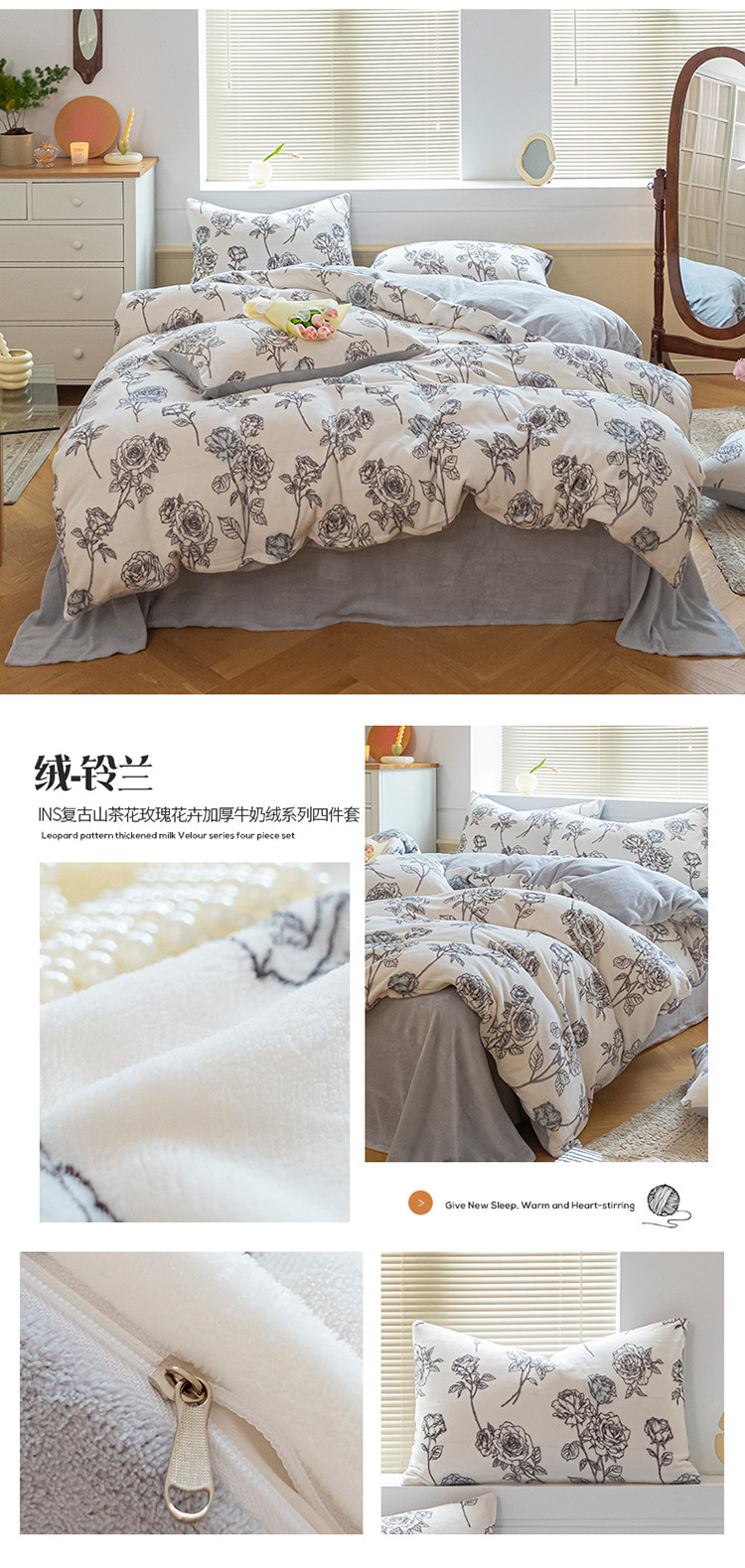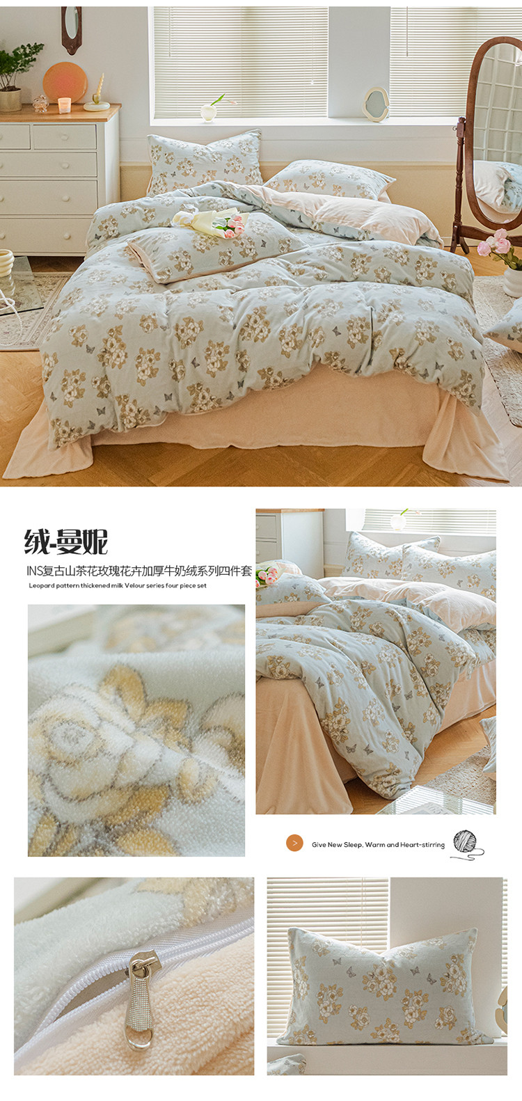 商品名称:(总)桃子ins复古山茶花玫瑰花卉加厚牛奶绒系列四件套