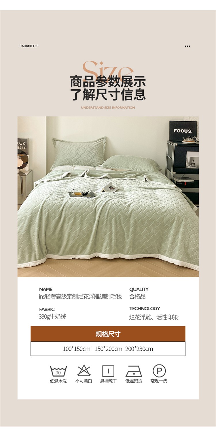 商品名称:桃子ins轻奢高级定制烂花浮雕编制牛奶绒毛毯毛毯-BV洞石绿